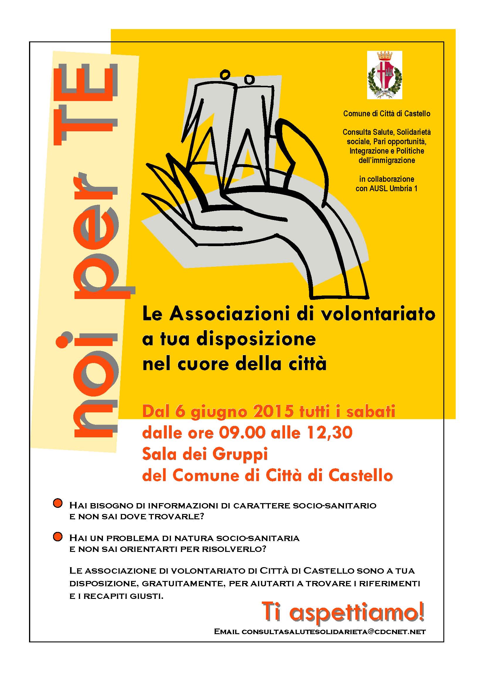 Per chi ha bisogno di informazioni sociosanitarie o ha un problema di natura sociosanitaria e non sa come risolverlo da sabato 6 giugno a Città di Castello c’è uno spazio di incontro dedicato all’orientamento e nato in seno alla Consulta Salute, Solidarietà sociale, Pari Opportunità, Integrazione e Politiche dell’immigrazione. Si chiama “Noi per te” e come spiega la presidente della Consulta Tina Pulcinelli “a partire da sabato 6 giugno, tutti i sabati dalle 9.00 alle 12.00, nella Sala dei Gruppi del comune tifernate, associazioni di volontariato saranno gratuitamente a disposizione dei cittadini per dare consulenza e indirizzare verso i giusti referenti. Discutendo al nostro interno, abbiamo osservato che questo bisogno di avere certezze è molto diffuso anche perché spesso le famiglie si trovano a dover affrontare situazioni nuove e non hanno inizialmente tutti gli strumenti per muoversi agevolmente. La Consulta vorrebbe dare una mano in questo senso”. “Noi per te” è in collaborazione con la Ausl Umbria 1.