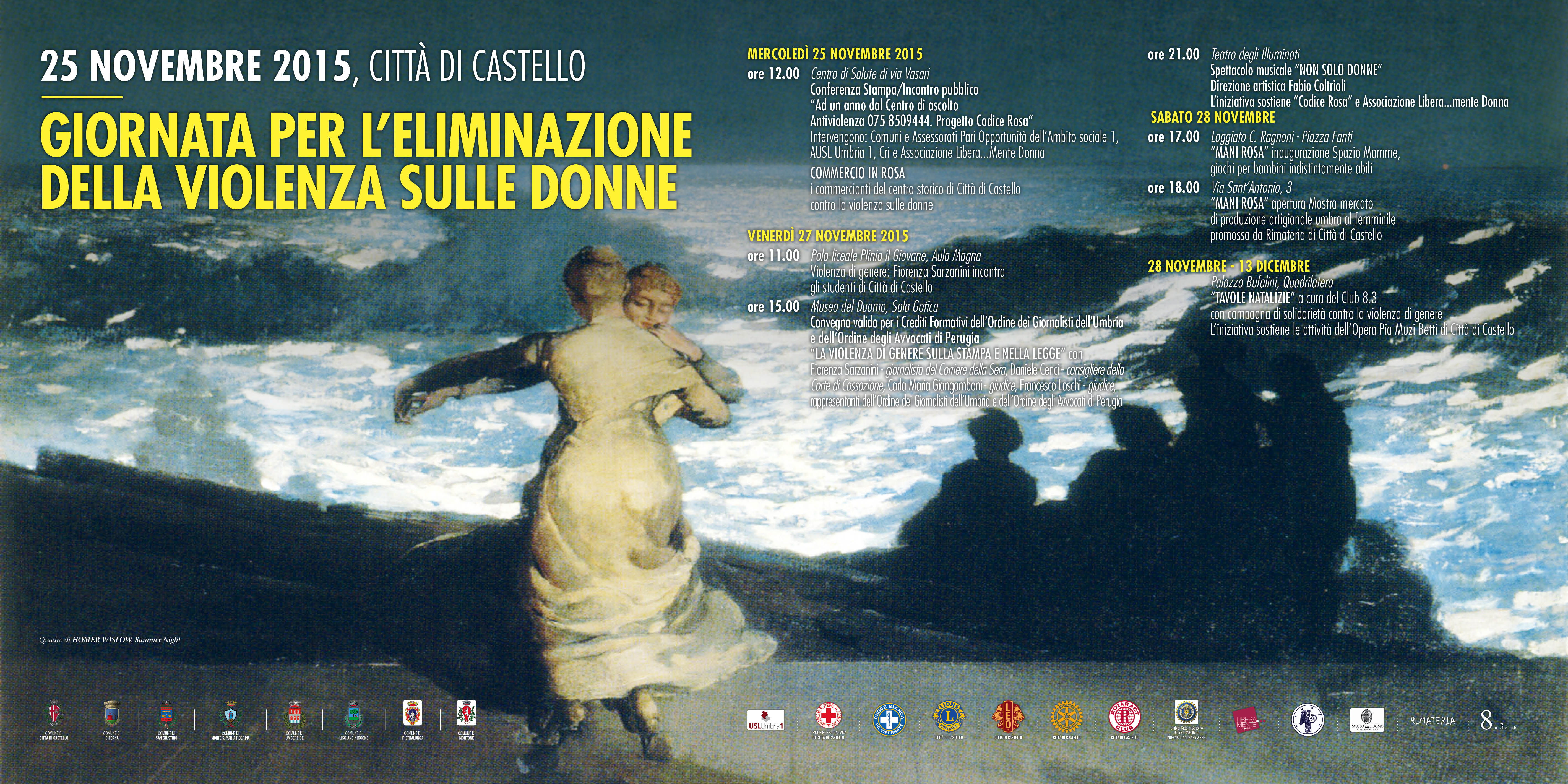 “Il mondo è attraversato da mille conflitti e tra questi dobbiamo annoverare la violenza di genere da cui il nostro territorio non è indenne”: così l’assessore alle Pari Opportunità del comune tifernate Andreina Ciubini ha introdotto il calendario di iniziative che accompagneranno il 25 Novembre, Giornata internazionale per l’eliminazione della violenza sulle donne, a Città di Castello. “Le manifestazioni, riunite in un unico contenitore, sono il frutto del lavoro congiunto di tanti soggetti, dall’Amministrazione comunale agli altri Comuni dell’ambito sociale 1, che proprio un anno fa hanno dato vita al Centro di ascolto antiviolenza, che risponde al numero 075 8509444”: AUSL Umbria n.1, diocesi di Città di Castello CRI, Pat, scuole della città, sindacati, Caritas, Lion Club di Città di Castello, Leo Club e Inner Wheel, Rotary, Rotaract e Fidapa, Teatro dei 90, Club 8.3, Rimateria, e l’associazione Libera…mente Donna, curatrice del Progetto “Codice Rosa”, che integra il circuito di protezione delle istituzioni sulle donne vittime di violenza con luoghi dedicati presso i Pronto soccorso. Abbiamo costruito insieme un calendario per raggiungere tutti ed estirpare questo fenomeno indegno di una società moderna. Il primo appuntamento è con la presentazione di Codice Rosa, canale di accoglienza e di supporto mercoledì 25 Novembre alle 12,00 presso il Centro salute di Via Vasari, perché rappresenta una prosecuzione del numero 075 8509444, attivato nel 2014, di cui tracceremo un bilancio” prosegue l’assessore, parlando anche di “Commercio in rosa”, un’iniziativa di sostegno, a cui, in collaborazione con l’Assessorato al Turismo e Commercio e le associazioni di categoria, possono partecipare tutti gli operatori del centro storico, esponendo in vetrina un oggetto di colore rosa.