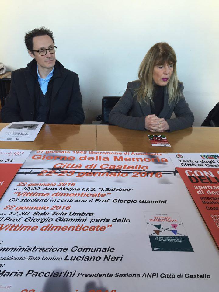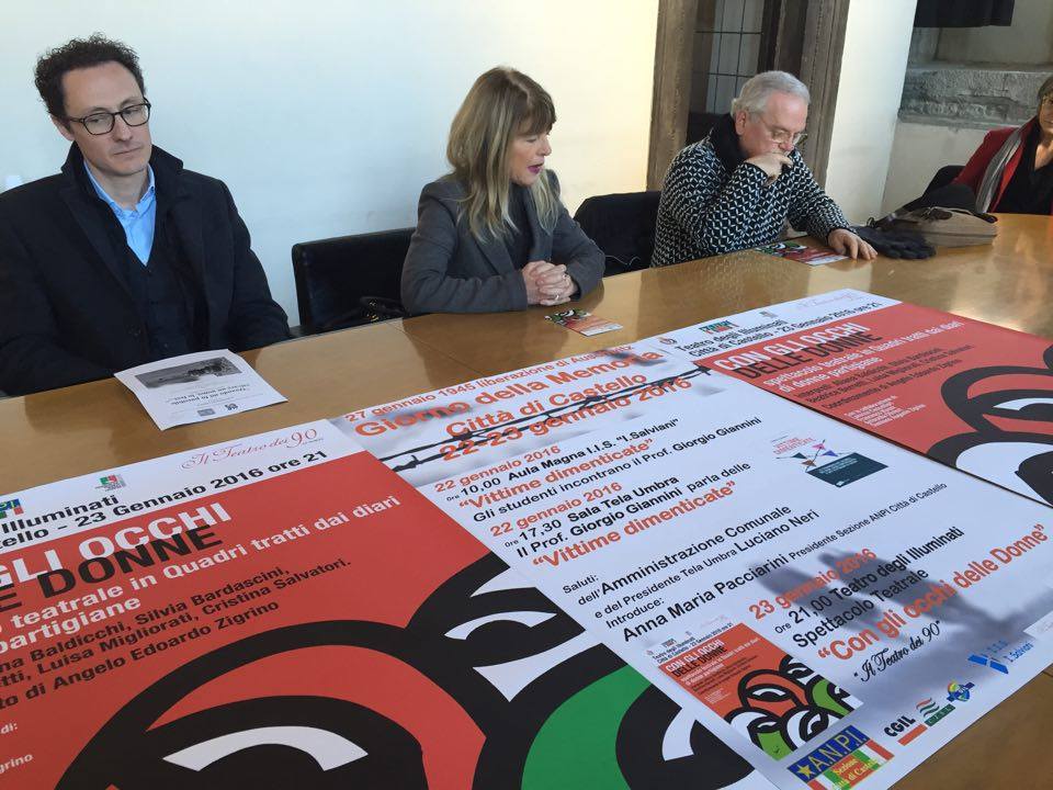 Accanto a questa iniziativa, altri soggetti si sono mobilitati in vista della Giornata della Memoria: in particolare Anpi che “proporrà alle scuole superiori venerdì 22 gennaio alle 10.00 nell’aula magna dell’istituto Salviani un incontro con Giorgio Giannini, autore della pubblicazione Vittime dimenticate in cui si parla di tutte le categorie umane, che furono ritenute indegne dal regime nazifascista e come tali perseguite. Giannini nel pomeriggio, alle 17.30, nella sede di Tela Umbra, parlerà del libro anche in una presentazione pubblica” ha spiegato la presidente di Anpi tifernate Anna Maria Pacciarini, aggiungendo che nella serata di sabato 23 gennaio (ore 21.00) al Teatro degli Illuminati il Teatro dei 90 presenterà sullo stesso tema Con gli occhi delle donne, una rappresentazione nata sulla base dei diari e delle testimonianze delle donne partigiane. La nostra missione negli ultimi anni è stata difendere la memoria e rendere consapevoli le giovani generazione di errori del passato perché la storia non è mai uguale a se stessa anche se gli errori spesso si presentano uguali, in luoghi e con protagonisti diversi. Dobbiamo saperli riconoscere e evitarli. Inoltre con uno spettacolo dedicato alle donne, ne vogliamo ricordare il 70° anniversario del diritto di voto”. Pasquale La Gala, presidente del Teatro dei 90, Angelo Edoardo Zigrino, coordinatore della produzione e una delle attrici, Cristina Salvatori, hanno illustrato lo spettacolo, inserendolo nel percorso di teatro al femminile che la compagnia sta facendo e sottolineando come dalle parole delle donne non emerge un eroismo guerriero ma spesso disarmato, spesso fatto di piccole ma importantissime scelte”. Sul palco con Cristina Salvatori, ci saranno Aliana Baldicchi, Silvia Bardascini, Beatrice Berretti, Luisa Migliorati; collaborano Lorenzo Cancellieri, Francesco Massi, Antonella Olivieri e Damiano Augusto Zigrino.
