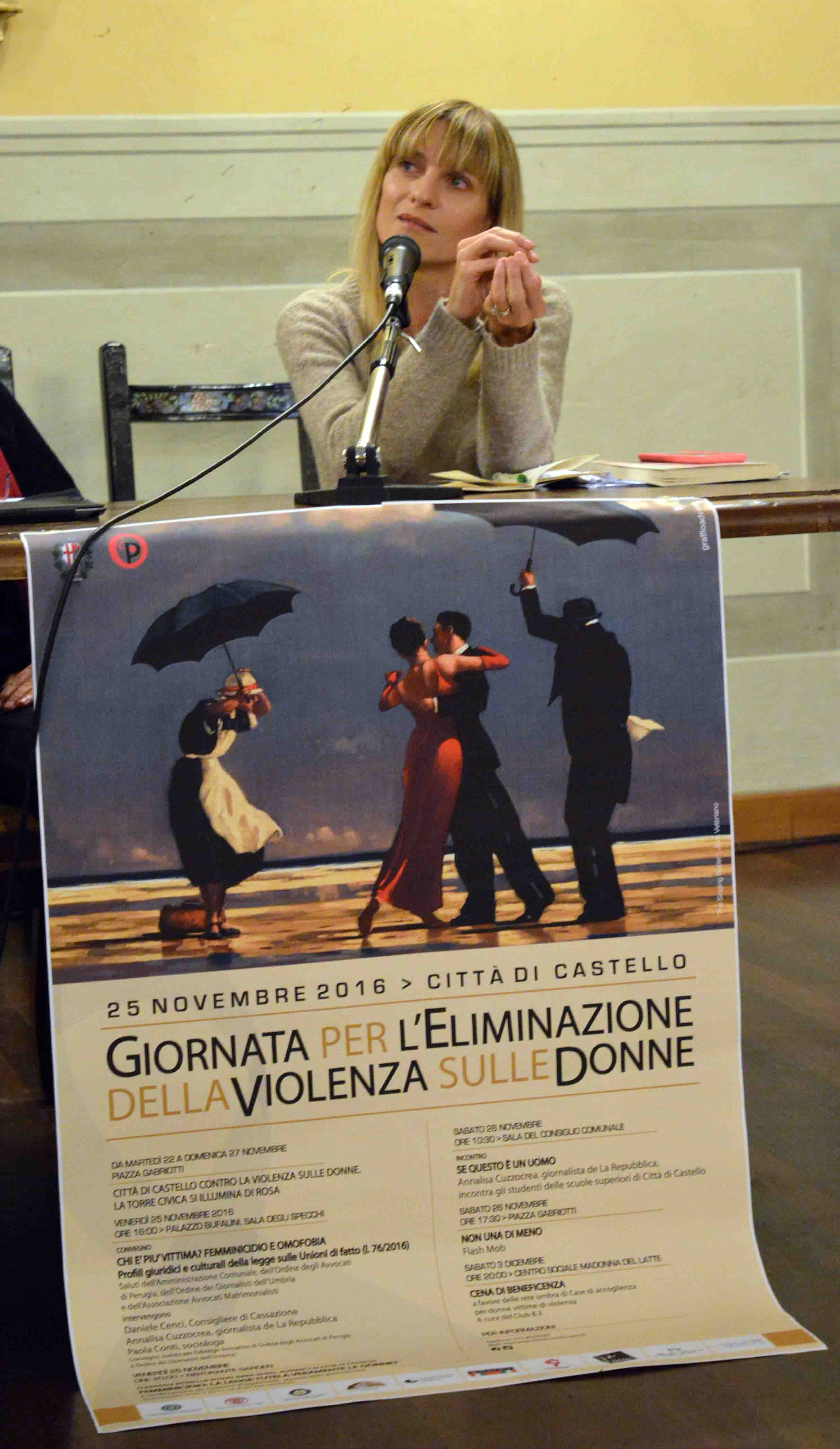 La torre civica illuminata di rosa contro la violenza sulle donne: proseguono le iniziative del Giornata internazionale, che ieri ha proposto il convegno Chi è più vittima? Femminicidio e omofobia, che nella Sala degli Specchi mettendo a confronto il Consigliere di Cassazione Daniele Cenci, la sociologa Paola Conti e l’ospite della Giornata 2016 Annalisa Cuzzocrea, giornalista di Repubblica, che oggi ha incontrato le scuole. “Bisogna essere educati anche a dirsi ti amo ed addio. C’è bisogno di un’educazione sentimentale” ha detto, invitando le donne a non tollerare nessun atto violenza. Momento clou del calendario il flash mob, Non una di meno, sulle note di Sofia di Alvaro Soleil in programma oggi pomeriggio, sabato 26 novembre alle 17.30 in Piazza Gabriotti o in caso di pioggia al Loggiato Gildoni, grazie alla collaborazione di Studio Danza, Academy Ballet e Zona Dieci Danza, che hanno elaborato la coreografia, pubblicata nella pagine FB Riconosci la violenza.