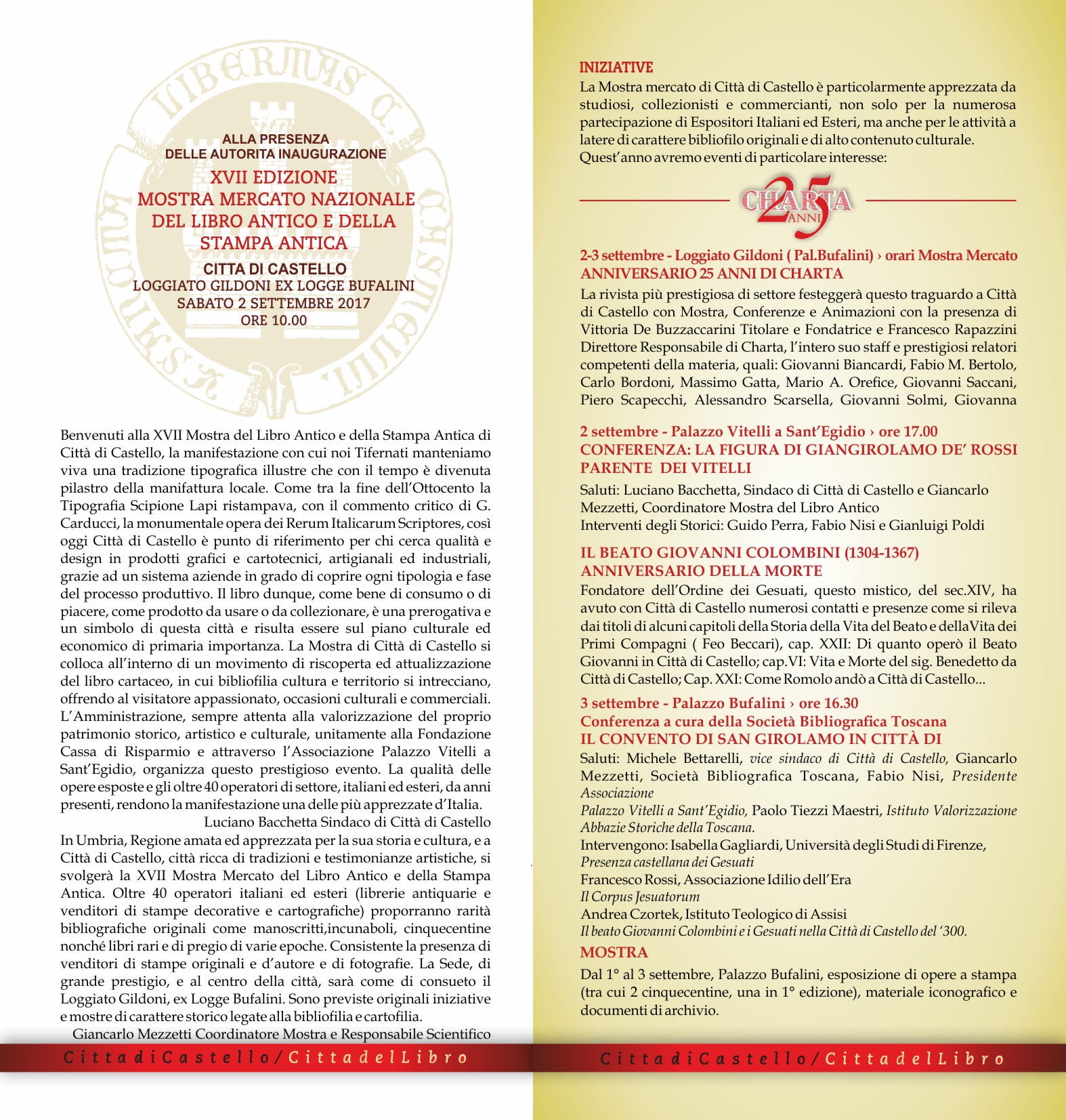 “Non bisogna lasciarsi ingannare dal fatto che tecnicamente la mostra potrebbe essere definita un fenomeno di nicchia perchè in realtà abbraccia e coinvolge tutti i maggiori operatori del settore in Italia, dove è il riferimento principale per questo tipo di commercio e di collezionismo” dicono l’assessore alla Cultura Michele Bettarelli e l’assessore al Turismo e Commercio Riccardo Carletti, per i quali “le manifestazioni generalise spesso hanno meno carattere e meno attrattività di un evento che riesce ad compattare la sua platea naturale e a mobilitare un pubblico più ampio perché propone un articolo familiare ed oggettivamente bello. Inoltre quest’anno il calendario di eventi collaterali è particolarmente ricco a partire dai 25 anni della maggiore rivista specializzata italiana Charta, che ha deciso di festeggiare a Città di Castello il suo compleanno. Di questo dobbiamo ringraziare l’associazione Palazzo Vitelli a Sant’Egidio, che nell’organizzazione non ha risparmiato energie e personaggi di spicco”. Ed è il presidente dell’ente promotore Fabio Nisi a confermare la grande qualità degli appuntamenti che faranno di cornice alla mostra vera e propria: “Avere Charta è un onore ma anche un riconoscimento importante. La rivista più prestigiosa di settore ci considera per così dire la casa del libro antico e il posto giusto dove festeggiare, insieme alle altre riviste ed ai più importanti esponenti del settore, un traguardo importante. Dietro questa scelta c’è il serio e certosino lavoro compiuto negli ultimi anni e la grande passione del coordinatore Giancarlo Mezzetti”. «Abbiamo invitato a Città di Castello tutto il nostro staff - dichiara Vittoria De Buzzaccarini, editore della rivista Charta - per ripercorrere la tanto lunga storia di questa edizione che è cambiata nel tempo, ma che è riuscita a mantenere i propri lettori su un livello importante; inoltre abbiamo pensato di coinvolgere un personaggio per noi emblematico, che sarà il marionettista Albert Bagno che a Città di Castello si esibirà in uno spettacolo con marionette d’epoca». Per l’occasione sarà realizzato un numero speciale della rivista che ripercorrerà tutte le tappe dei 25 anni e che sarà distribuito in via eccezionale proprio alla Mostra del Libro Antico. “Ai prestigiosi esemplari del circuito commerciale, aggiungeremo le conferenze ormai attese sulle figure della famiglia Vitelli, su Giovanni Colombini, fondatore anche a Città di Castello dell’ordine dei Gesuati e sul convento di San Girolamo, al centro di uno studio della Società bibliografica toscana” anticipa Mezzetti, attingendo dalla brochure già distribuita a livello nazionale. “Stiamo promuovendo a tutto campo la mostra dove saranno visibili anche quest’anno molte rarità bibliografiche, incunaboli, cinquecentine e la cartografia d’epoca, che rappresenta il nostro fiore all’occhiello”.