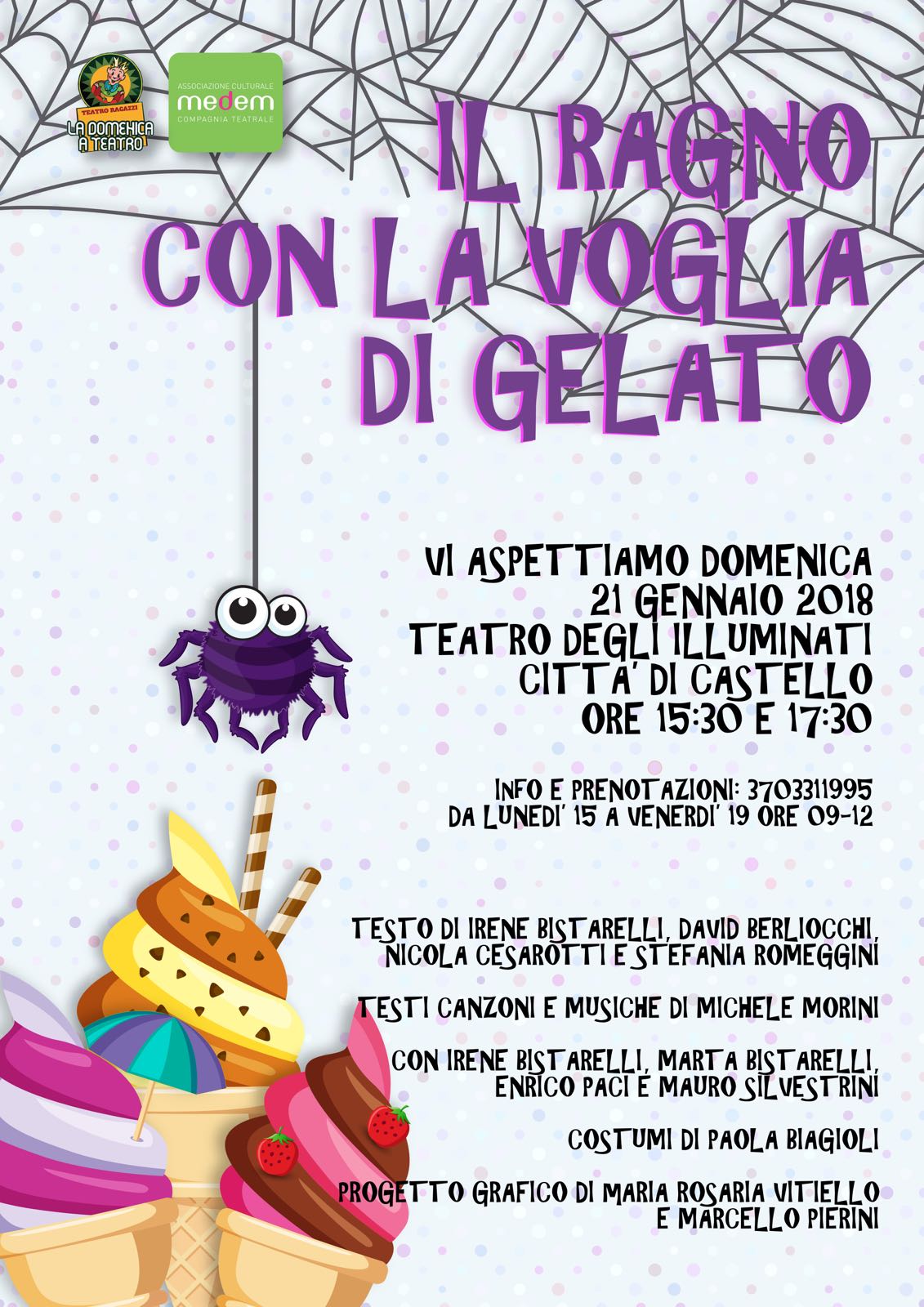 Sarà la compagnia Medem a salire sul palco del Teatro degli Illuminati domani, domenica 21 gennaio, per il primo spettacolo del 2018 della stagione teatrale riservata a bambini e ragazzi. Per il ciclo “La domenica a teatro”, andrà in scena lo spettacolo dal titolo “Il ragno con la voglia di gelato”, che sarà proposto al pubblico negli abituali due appuntamenti delle ore 15.30 e delle ore 17.30. Indicato per bambini dai quattro anni di età, il lavoro, scritto a quattro mani da David Berliocchi, Irene Bistarelli, Nicola Cesarotti e Stefania Romeggini, proporrà la storia di un ragno gigante di nome Salvatore, sognatore e goloso di gelato. Aiutato dall’amica Caterina, insieme a una fata in carriera e a un orco un po’ maldestro, Salvatore cercherà di soddisfare il proprio desiderio di gustare l’amato dolce freddo, sottraendosi alla cameriera di casa che vuole eliminarlo. Una divertente avventura che sarà interpretata sul palco da Marta Bistarelli, Irene Bistarelli, Mauro Silvestrini ed Enrico Paci, per la regia di Irene Bistarelli. Per la vendita dei biglietti, al costo di 5 euro a persona, il botteghino del Teatro degli Illuminati sarà aperto a partire dalle ore 14.30 di domani.