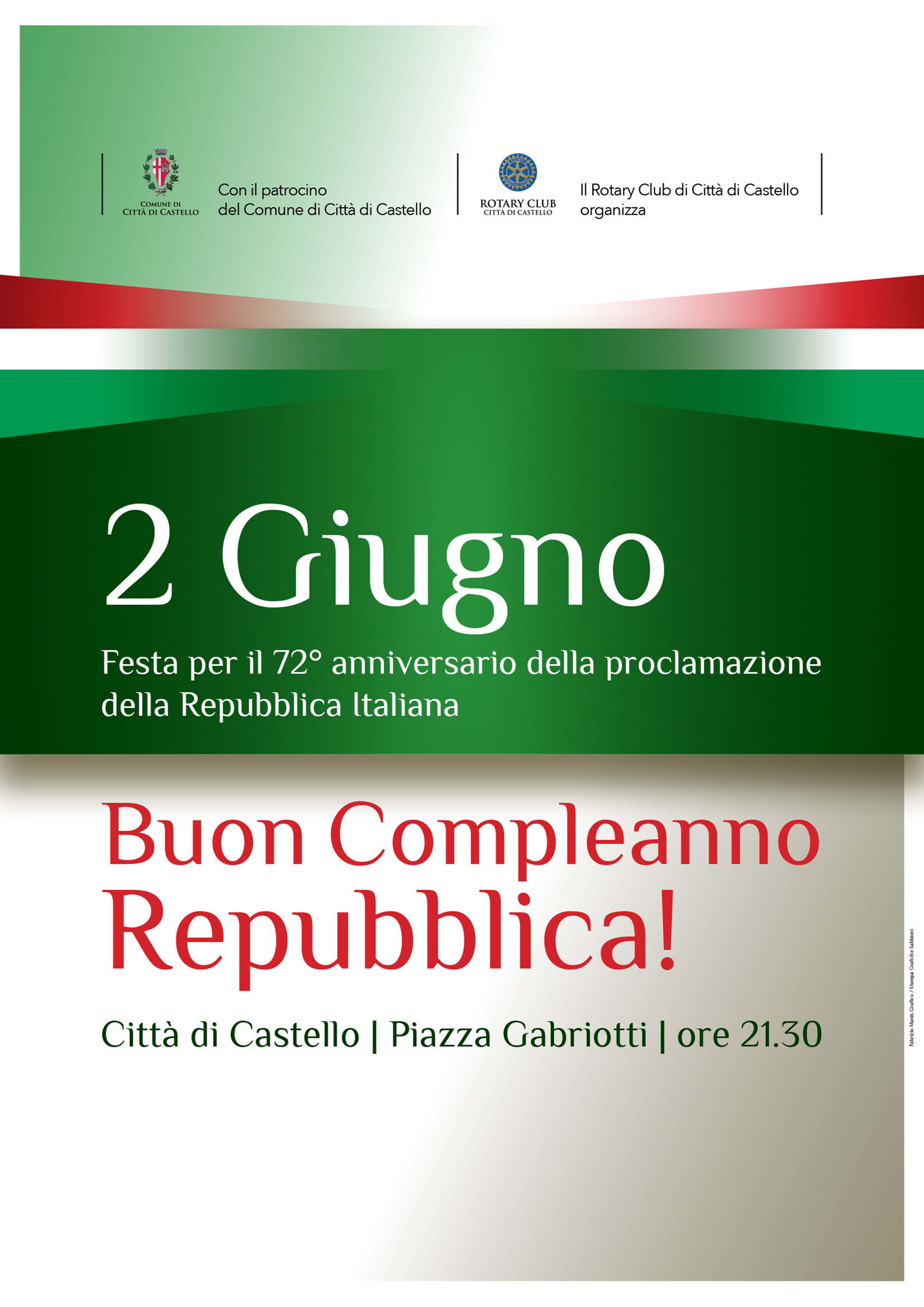 Saranno di nuovo gli uomini del Distaccamento dei Vigili del fuoco di Città di Castello a garantire anche quest’anno l’emozionante omaggio che Città di Castello tributa alla Repubblica Italiana, nel giorno del 72° anniversario della sua istituzione, attraverso il plebiscito del 2 giugno 1946, in cui gli italiani scelsero per sé e per il loro Paese un regime democratico. In Piazza Gabriotti e nonostante il cantiere, il Tricolore tornerà a vestire la torre civica grazie ai sette professionisti delle tecniche SAF del capo distaccamento dei Vigili del Fuoco tifernati Massimo Vescarelli, che si caleranno dalla cima della torre, srotolando il drappo lungo la facciata principale e sotto gli occhi dei tanti cittadini che ogni 2 giugno rispondono all’appello di Comune e Rotary Club. L’appuntamento è alle ore 21.30 quando la Filarmonica G. Puccini, diretta dal maestro Francesco Marconi, entrerà in Piazza Gabriotti, scandendo le fasi della discesa del Tricolore e accompagnando l’applauso alla bandiera. Prima dello spettacolo notturno, il sindaco Luciano Bacchetta e il presidente del Rotary Club Silvia Mercati terranno un breve discorso. Poi a drappo disteso, ci saranno gli attesi fuochi di artificio ed il brindisi finale. (Allegata locandina)