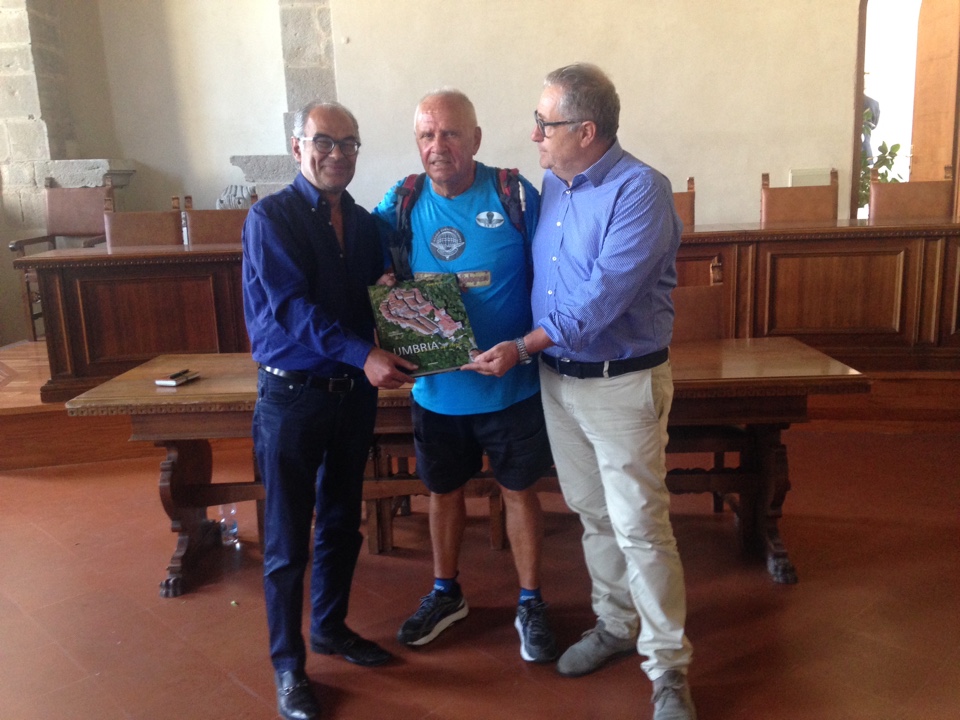 Maglietta azzurra d’ordinanza, calzoncini corti, scarpe da ginnastica e zainetto in spalla, Alessandro Bellière, l’alpino-paracudista 85anni (campione di atletica leggera negli anni ’50) ha fatto ingresso nella sala del consiglio comunale questa mattina alle ore 12, come da programma dopo aver percorso i circa sedici chilometri della 57esima tappa da Monterchi a Città di Castello. Tutto secondo copione. Ad attenderlo nell’aula consiliare il sindaco, Luciano Bacchetta e l’assessore allo sport, Massimo Massetti. “Con il cammino di questa mia ultimissima sfida – ha dichiarato Bellière - intendo unire in un virtuale abbraccio lungo 4.245 Km per 146 tappe tutte le 20 province capoluogo di regione. Quando avrò terminato questa quinta sfida avrò percorso sul territorio italiano oltre 20mila chilometri in 601 tappe. Desidero incontrare, come ho già fatto nelle altre sfide, scolaresche, giovani, anziani e diversamente abili, nello spirito di amicizia che la sana attività sportiva promuove e naturalmente sempre all’insegna del mio motto: “Volere è Potere””, ha precisato ancora il maratoneta dei record che dopo, una sosta in terra altotiberina ripartirà domani mattina alla volta di Apecchio, circa 30 chilometri della 58esima tappa. Bellière ha deciso di percorrere a piedi per l’ultima volta l’Italia da nord a sud (4.245 chilometri): da Genova a Palermo, un percorso iniziato lo scorso 28 maggio che si concluderà in Sicilia il 24 Ottobre, 146esima tappa, nel giorno del suo compleanno. “Percorrendo a piedi questi luoghi dalla Valtiberina toscana fino alla vostra bellissima città si possono cogliere tutte quelle sfumature e caratteristiche che ne fanno un luogo davvero straordinario sotto ogni profilo, ambientale, architettonico, storico e sociale, a partire dalla gente e dalla vostra cordialità”, ha concluso Alessandro Bellière ringraziando sindaco e assessore allo Sport e tutta la comunità locale. “Chi promuove lo sport, i sui valori autentici di sana competizione, rispetto degli avversari e condivisione di una passione è sempre il benvenuto nella nostra città” – hanno dichiarato il sindaco Luciano Bacchetta e l’assessore allo sport, Massimo Massetti, che si sono congratulati con Bellière per questa ultima impresa a piedi per l’Italia e gli hanno consegnato il volume, “Umbria Emozioni dal cielo” che racchiude immagini mozzafiato e testi sugli scorci ed angoli più suggestivi della regione Umbria.