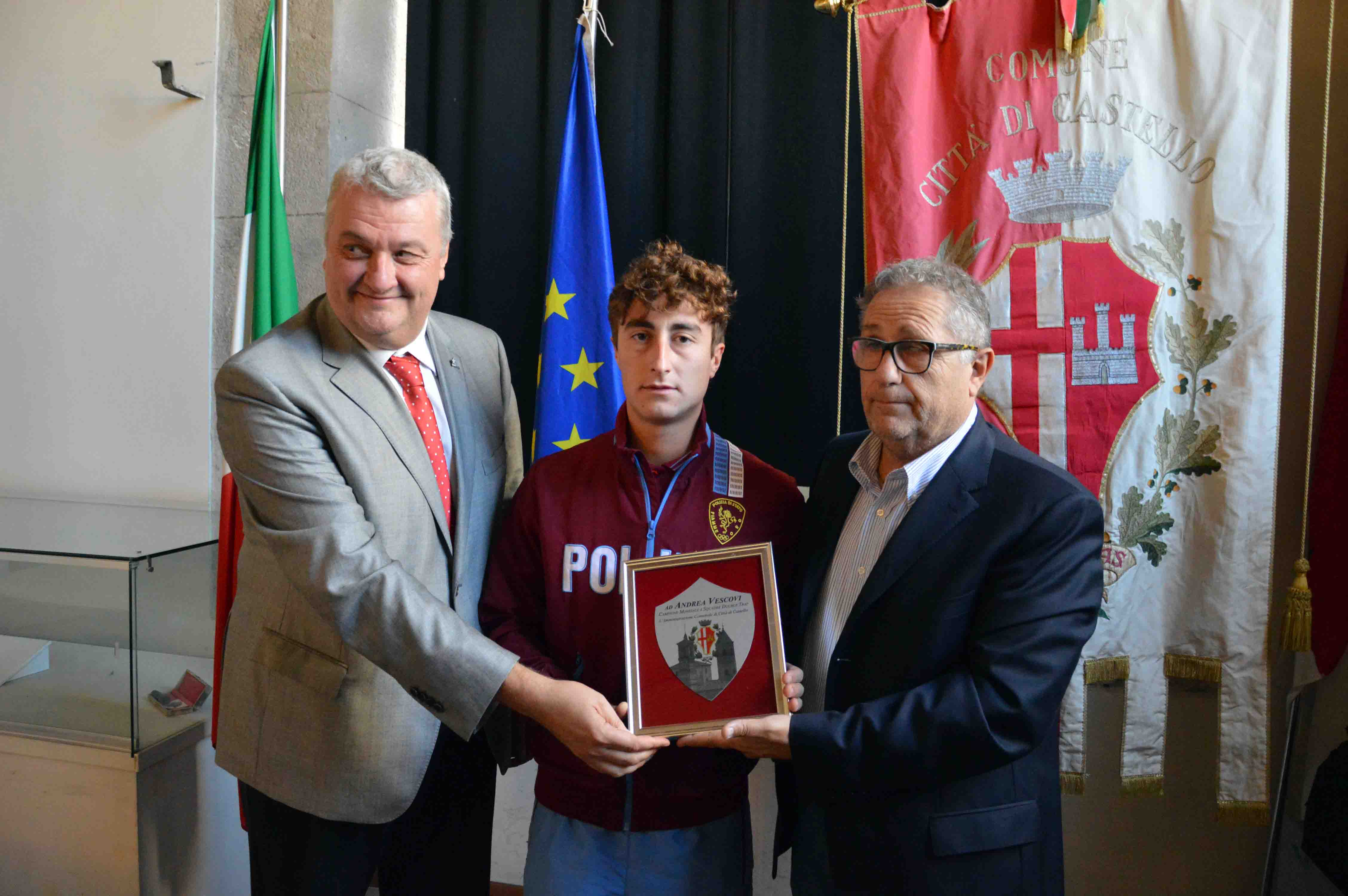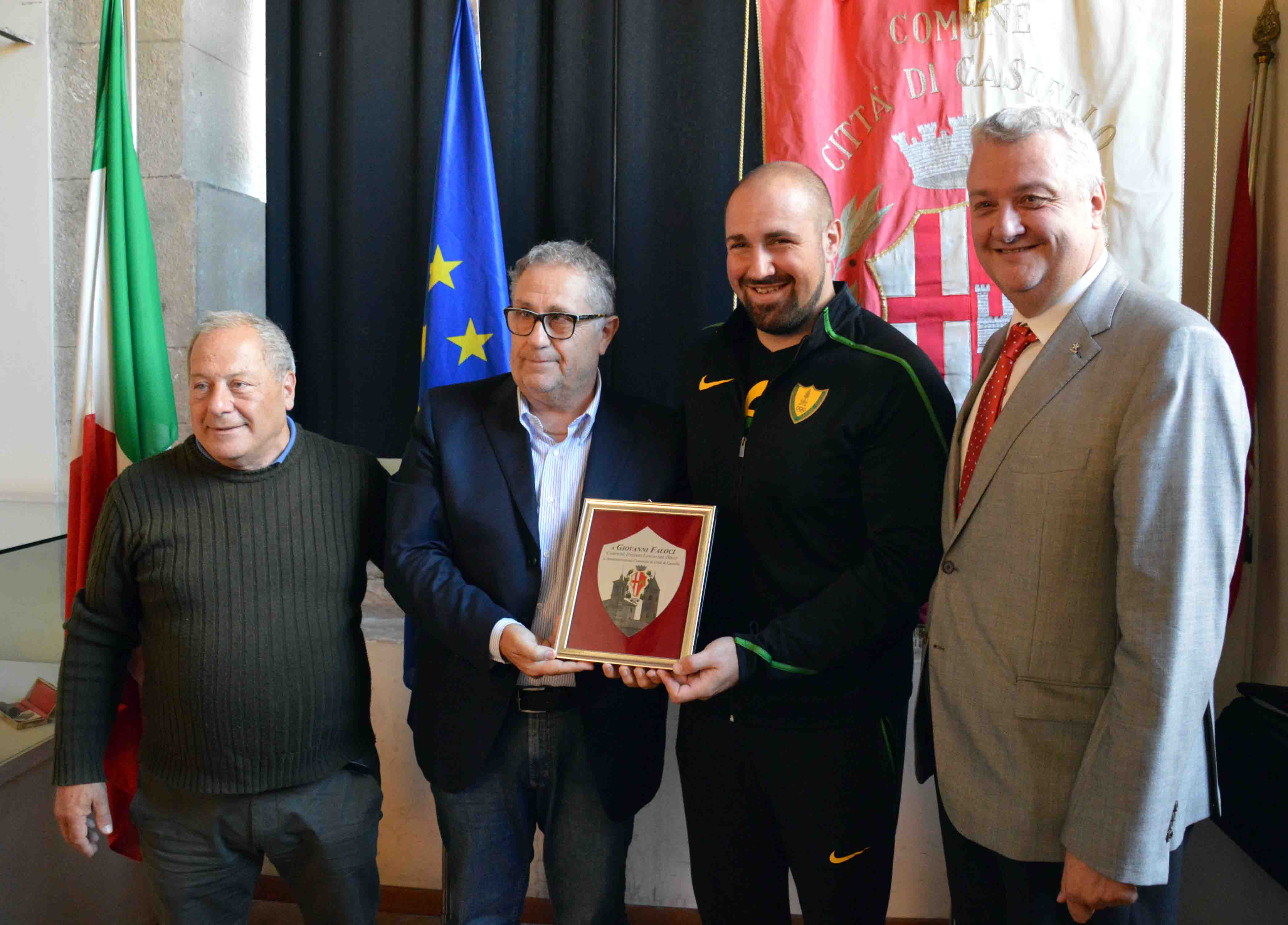 Sfilata di eccellenze sportive di Città di Castello nella residenza municipale, dove l’assessore allo Sport Massimo Massetti ha incontrato il campione mondiale a squadre nella specialità del double trap seniores maschile Andrea Vescovi e il campione italiano di lancio con il disco Giovanni Faloci, insieme ai rappresentanti della Tiferno Runners, che parteciperà alla maratona di New York con quattro atleti e l’obiettivo ambizioso di portare Cristian Marianelli a essere il primo italiano a tagliare il traguardo. “Questa mattina siamo qui per interpretare il desiderio di tanti tifernati che avrebbero voluto stringere la mano e congratularsi con due straordinari atleti come Vescovi e Faloci e fare un incoraggiamento sincero ai podisti che correranno la maratona più importante al mondo con il logo del Comune di Città di Castello sul petto”, ha sottolineato Massetti nell’incontro, al quale ha preso parte l’arbitro internazionale di pallavolo Simone Santi, per la prima volta nella sua nuova veste ufficiale di delegato del Coni per i comuni dell’Alta Valle del Tevere, la dirigente comunale del Servizio Sport Giuliana Zerbato, il presidente della “Tiferno Runners” Andrea Vandini, con alcuni sponsor, e il presidente dell’Altletica Libertas Ugo Tanzi. “E’ un dovere, oltre che un motivo di orgoglio per l’amministrazione comunale – ha detto Massetti - premiare Vescovi e Faloci, che portano in alto il nome di Città di Castello in due discipline nelle quali non è facile emergere partendo da un contesto territoriale come il nostro e nelle quali arrivare ai massimi livelli è, pertanto, davvero un magnifico esempio di talento e professionalità nella pratica dello sport”. A nome dell’amministrazione comunale l’assessore ha consegnato una targa commemorativa dei successi ottenuti ai due campioni, i quali, visibilmente emozionati, hanno espresso la soddisfazione di veder sottolineati pubblicamente i risultati ottenuti, ma soprattutto l’impegno e la passione con cui quotidianamente si sono preparati per questi obiettivi. Insieme a Santi, Massetti ha auspicato per entrambi la partecipazione alle Olimpiadi del 2020 a Tokyo e ha dato l’appuntamento per un nuovo incontro in Comune nel quale festeggiare altri successi. Lo stesso proposito è stato formulato al presidente della Tiferno Runners Vandini, che il 4 novembre correrà a New York insieme a Marianelli, invitato dall’organizzazione della manifestazione per il decimo tempo italiano sulla distanza ottenuto a Rimini nel 2017, Federico Morini e Daniele Belletti. “Partecipare con quattro atleti a un evento così importante è già un obiettivo straordinario che ci inorgoglisce – ha puntualizzato Massetti - perché la ‘Tiferno Runners’ sarà in gara con il logo del Comune e porterà Città di Castello in una ribalta internazionale di grande prestigio, nella quale tiferemo perché il podista di punta della squadra Marianelli possa primeggiare”. Nel salutare gli atleti a nome del Coni e rappresentare la particolare soddisfazione del comitato umbro, Santi ha ringraziato il presidente Domenico Ignozza per la nomina e l’assessore Massetti per aver avanzato la sua candidatura, garantendo il massimo impegno per rappresentare tutti gli sport nei comuni della vallata e farsi interprete delle istanze e delle problematiche delle amministrazioni locali.