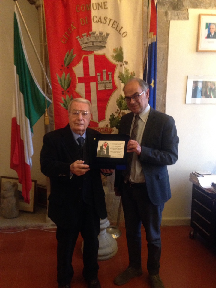 Una targa con per celebrare il traguardo di vita raggiunto, il ruolo svolto nel settore dell’economia e industria, nel volontariato, alla guida di associazioni di categoria, istituti bancari ed altri ambiti della comunità locale e regionale. “L’amministrazione comunale al Commendator Antonio Gasperini “capitano” di industria, simbolo ed esempio per tutta la comunità tifernate”, questa è la motivazione impressa nella targa con il logo del comune che questa mattina il sindaco, Luciano Bacchetta ha consegnato al Commendator Antonio Gasperini, ricevuto a palazzo comunale assieme alla figlia Alessandra e al genero Eros Colcelli. “Un tributo doveroso ad un vero e proprio simbolo della nostra città che ha raggiunto un traguardo di vita importante circondato dall’affetto della sua famiglia, dei dipendenti dell’azienda fondata agli inizi degli anni sessanta nella zona industriale, che assieme ad altri grandi imprenditori tifernati, ha contribuito a far nascere e sviluppare all’insegna della prosperità e lavoro. Il commendator Gasperini – ha detto il sindaco Bacchetta – ha rappresentato e rappresenta per intere generazioni anche un esempio per impegno nel volontariato, alla testa della sua amata Avis sempre a fianco di chi soffre ed ha bisogno di aiuto, alla guida di associazioni di categoria, istituti di credito e sempre in prima linea nella sua comunità e città che idealmente oggi, ne sono sicuro, si stringe attorno a lui con un caloroso abbraccio”. “Grazie Commendatore – ha concluso il sindaco Bacchetta – per quello che ha fatto per la nostra città e per i tifernati: siamo orgogliosi e riconoscenti per quello che ha rappresentato e rappresenta. Auguri”.