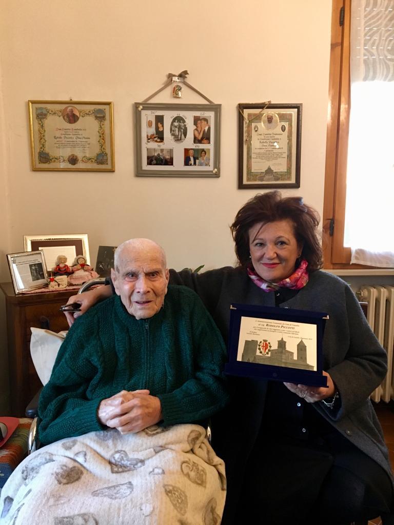 Il comune nella persona dell’Assessore alle Politiche Sociali, Luciana Bassini, ha voluto rendere omaggio, a nome del sindaco e della città, al concittadino Rodolfo Piccotti, classe 1917, 102 anni compiuti, con la consegna di una targa ricordo alla presenza dei familiari e di tantissimi amici della comunità di Promano e non solo. "A Rodolfo Piccotti per il traguardo di vita raggiunto e per i valori e ideali che rappresenta in famiglia e nella comunità tifernate", questa la motivazione impressa sulla targa. Rodolfo Piccotti, detto “Picche” è uno degli ultimi reduci della campagna italiana di Russia del 1941 della quale ancora parla con viva memoria. “E’ stata una giornata straordinaria all’insegna della gratitudine e ricordo di tanti cittadini italiani come il tifernate Piccotti protagonisti di un periodo storico drammatico che ha lasciato il segno in tutti noi. Con i suoi racconti appassionati e lucidi Rodolfo Piccotti ci ha fatto rivivere quei momenti e ci ha trasmesso i valori di patriottismo e difesa della democrazia che hanno caratterizzato quegli anni. Grazie a lui, alla sua famiglia e comunità locale: non lo dimenticheremo mai.”