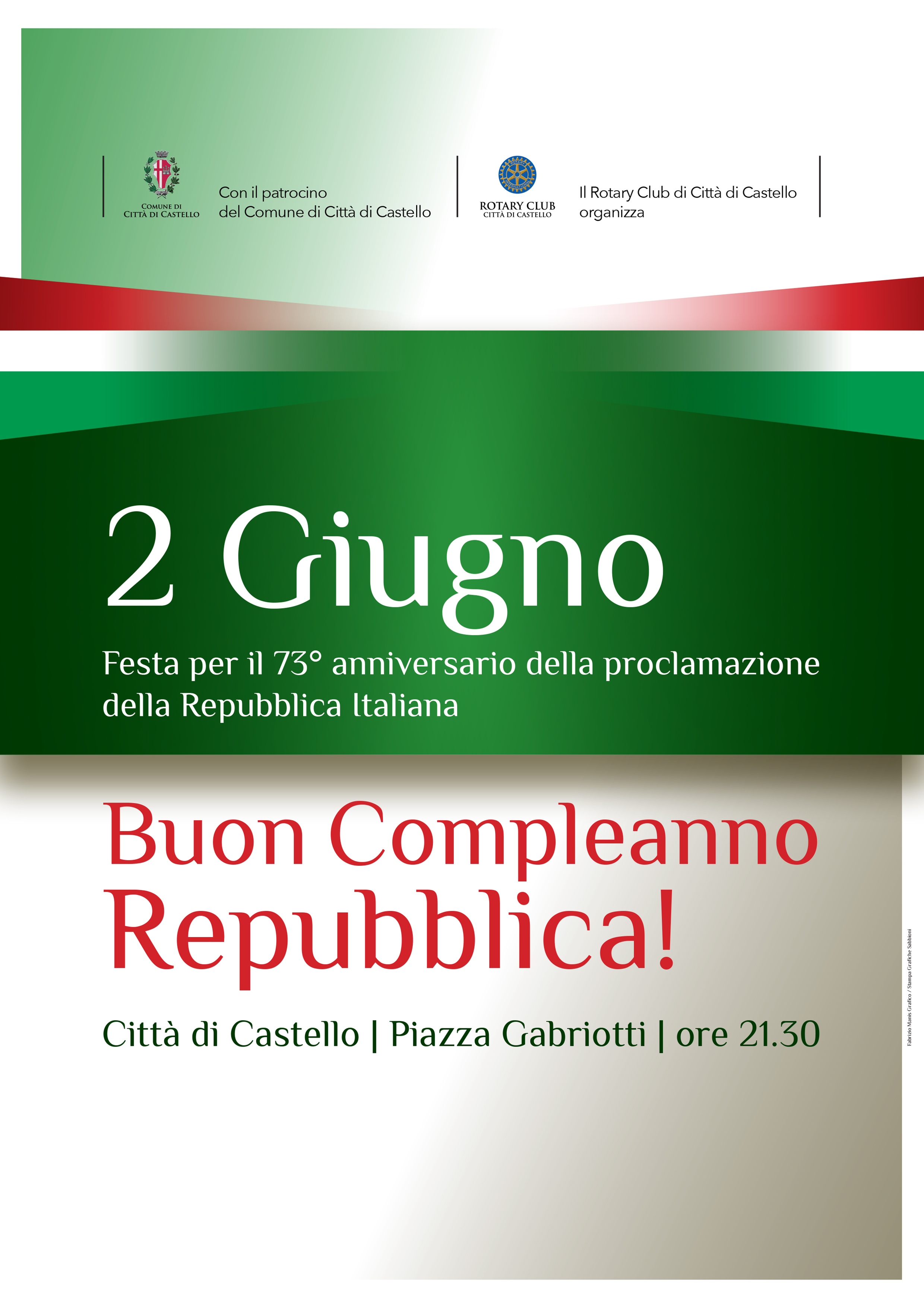 Saranno di nuovo gli uomini del Distaccamento dei Vigili del fuoco di Città di Castello a garantire anche quest’anno l’emozionante omaggio che Città di Castello tributa alla Repubblica Italiana, nel giorno del 73° anniversario della sua istituzione, attraverso il plebiscito del 2 giugno 1946, in cui gli italiani scelsero per sé e per il loro Paese un regime democratico. In Piazza Gabriotti il Tricolore tornerà a vestire la torre civica grazie ai sette professionisti delle tecniche SAF del distaccamento dei Vigili del Fuoco tifernati, che si caleranno dalla cima della torre, srotolando il drappo lungo la facciata principale e sotto gli occhi dei tanti cittadini che ogni 2 giugno rispondono all’appello di Comune e Rotary Club. L’appuntamento è alle ore 21.30 quando la Filarmonica G. Puccini, diretta dal maestro Francesco Marconi, e il Coro degli alunni dell'Istituto comprensivo Alberto Burri di Trestina, diretti dal maestro Francesco Banconi, entreranno in Piazza Gabriotti, scandendo le fasi della discesa del Tricolore e accompagnando l’applauso alla bandiera.