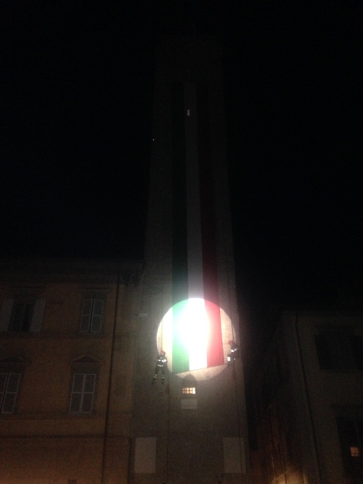 La torre civica vestita a festa con il tricolore sulle note dell’Inno di Mameli e l’immancabile spettacolo colorato dei fuochi d’artificio sullo sfondo dei Giardini del Cassero ha richiamato tanta gente, anche alcuni turisti, ieri sera in Piazza Gabriotti. Tutti con il naso all’insù, smartphone alla mano per ammirare e scattare gli attimi più spettacolori delle evoluzioni di due coraggiosi Vigili del Fuoco, i capi-squadra, Elio Peli e Massimo Mancinelli, del distaccamento tifernate (rappresentato dal neo-capo reparto Giuseppe Gennatiempo) ed altri professionisti delle tecniche SAF che si sono calati dalla sommità della Torre Civica facendo srotolare il lungo tricolore, reso ancora più suggestivo da un gioco di luci. Una manifestazione, la Festa della Repubblica, senza dubbio inedita, che da dal 2003 grazie al Rotary Club di Città di Castello si ripete ogni anno sempre con grande successo e cornice di pubblico. Il momento più spettacolare della serata (coordinata in maniera impeccabile da Claudio Tomassucci) sulle note della Filarmonica G. Puccini, diretta dal maestro Francesco Marconi, e il Coro degli alunni dell'Istituto comprensivo Alberto Burri di Trestina, diretti dal maestro Francesco Banconi, è stato preceduto dagli interventi del sindaco, Luciano Bacchetta, del Presidente del Rotary Club, Lorenzo Nicasi e del Comandante Provinciale dei Vigili del Fuoco di Perugia, Michele Zappia che hanno tutti sottolineato il grande significato storico e sociale di una manifestazione che travalica i confini comunali e comprensoriali. Il sindaco, Luciano Bacchetta, ha infine salutato e ringraziato l’ormai ex capo-distaccamento dei Vigili del Fuoco, Massimo Vescarelli, capo reparto esperto da venerdi scorso in pensione e con lui tutti i vigili del fuoco.