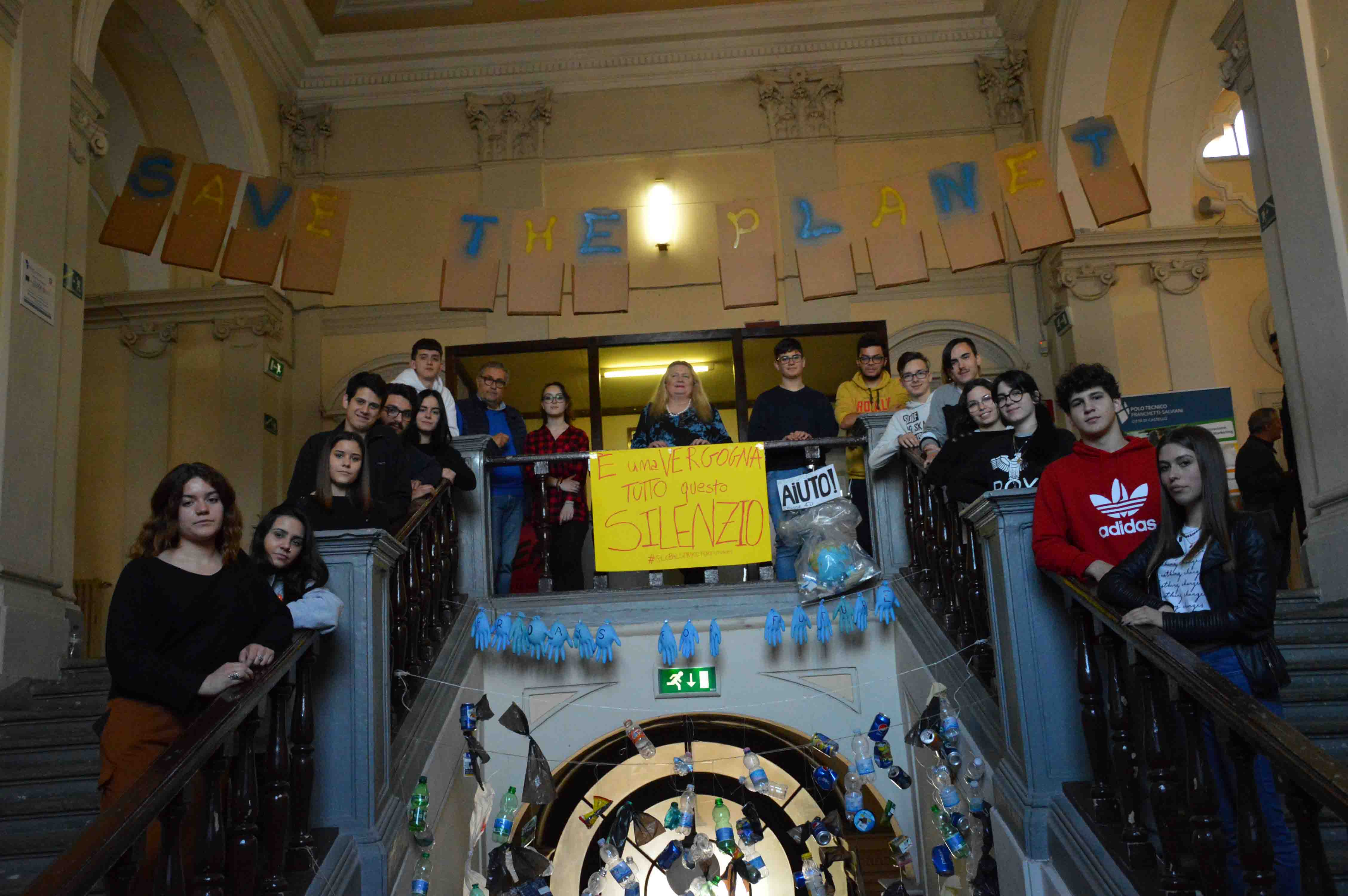 “Save the planet” è l’appello che circa 200 studenti del Polo Tecnico Franchetti-Salviani hanno lanciato insieme agli assessori all’Ambiente Massimo Massetti e alla Scuola Rossella Cestini, presentando nei giorni scorsi le installazioni realizzate in aula nell’ambito della mobilitazione internazionale promossa dall’attivista Greta Thunberg con i “Fridays for future”. La protesta contro le politiche che determinano il riscaldamento globale del pianeta e il cambiamento climatico è stata interpretata dai ragazzi attraverso un lavoro didattico che dal 15 marzo li ha visti protagonisti ogni venerdì, per otto settimane, di una riflessione sulle tematiche ambientali e sulle soluzioni per contrastare i comportamenti sconsiderati che mettono a rischio l’umanità. Le installazioni realizzate hanno trasformato l’atrio della sede dell’istituto situata nel centro storico in un ideale manifesto della cultura ambientale maturata sui banchi, mettendo in pratica le diverse competenze acquisite negli indirizzi Informatico, Chimico-Ambientale, Grafica e Comunicazione, Meccanico. L’impegno a sensibilizzare la comunità locale ha preso la forma di una "tenda" di barattoli e bottigliette sulla scalinata principale, di globi racchiusi in sacchetti con rifiuti, di guanti monouso gonfiati, di una raccolta di cicche di sigarette, di cartelloni colorati. A sovrastare il tutto una collana di scatole della pizza riciclate appesa al soffitto dell’ingresso, con la scritta “Save the planet”, che ha dato forza ai concetti espressi in uno spot video realizzato in classe. “Bisogna lavorare tutti insieme per fare in modo che le generazioni future possano vivere in un ambiente sostenibile”, hanno affermato Cestini e Massetti, che hanno evidenziato come “vedere i nostri giovani così coinvolti nelle questioni ambientali, con senso di responsabilità e consapevolezza dell’importanza di impegnarsi in prima persona per sensibilizzare la comunità, è un segnale molto importante, che rafforza tutte le azioni alle quali lavoriamo come amministrazione comunale per gestire correttamente i rifiuti e ridurne la produzione, ma anche per favorire l’utilizzo delle energie rinnovabili”. Il dialogo tra studenti e amministratori ha permesso di consolidare il patto civico a sostegno delle idonee abitudini di cui c’è bisogno per salvaguardare l’ambiente e di condividere, anche all’interno della scuola, azioni finalizzate a contribuire in modo concreto a ridurre inquinamento e i costi sociali della produzione dei rifiuti. “Abbiamo pensato di far riflettere i ragazzi sulle tematiche ambientali di maggiore attualità e produrre qualcosa di visibile, che fosse di impatto per chiunque frequenta la scuola, in modo da stimolare tutti, a cominciare dalle famiglie, ad aumentare il protagonismo personale nei comportamenti quotidiani che possono aiutare il pianeta”, ha sottolineato la dirigente scolastica del Franchetti-Salviani Valeria Vaccari, nel puntualizzare che “alle idee e allo studio seguono i comportamenti, per cui proprio a scuola abbiamo l’opportunità forse più grande di costruire una comunità consapevole e responsabile”.