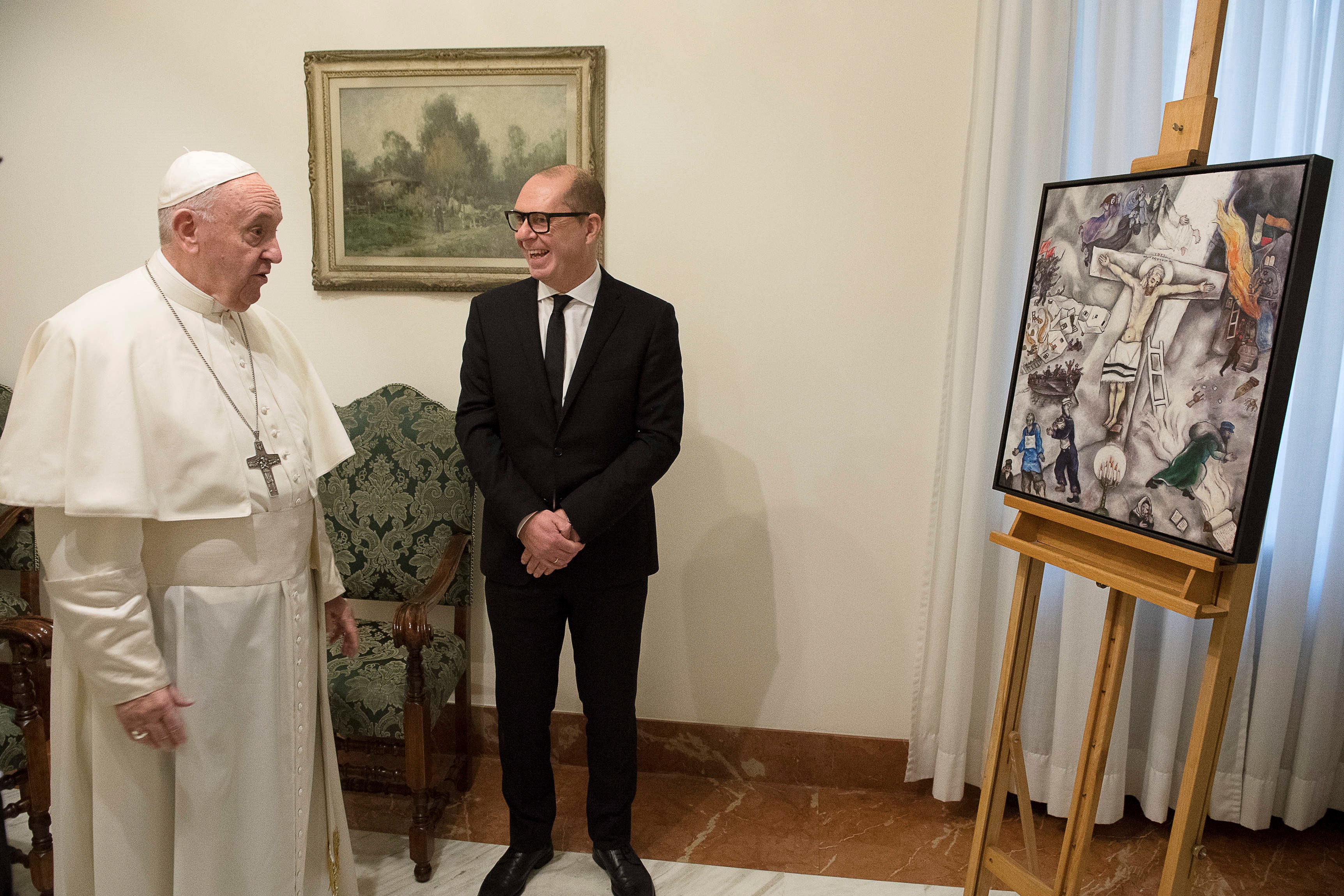 “Un emozione indescrivibile, sicuramente il momento della mia vita umana e professionale più importante, indimenticabile”. Con la voce rotta dall’emozione, Stefano Lazzari, maestro artigiano d’arte, titolare della Bottega Tifernate di Città di Castello, che ha brevettato una particolare tecnica, la «pictografia» che consente di realizzare copie di antichi capolavori (affreschi, dipinti su legno e su tela) identiche all'originale, grazie anche al ricorso di pittura e finitura analoghe a quelle antiche, racconta i momenti davvero unici trascorsi questa mattina in Vaticano a Casa Santa Marta, residenza di Papa Francesco. Davanti al Pontefice (che ieri ha compiuto 83 anni) ed altri stretti collaboratori, nonostante le mani tremolanti e i brividi di gioia, Lazzari ha sistemato in un angolo dell’abitazione più famosa e illustre al mondo una “copia” identica all’originale della “Crocifissione Bianca”, di Marc Chagall (1938, Olio su tela Chicago, Art Institute) portata a termine con certosina tecnica e attenzione nella sua bottega-laboratorio di Città di Castello dopo oltre sei mesi di lavoro. L’opera è stata ricreata lavorando con pigmenti naturali strato su strato, dipingendo i particolari con una lente d’ingrandimento poiché la sua dimensione è circa 2,5 volte più piccola dell’originale: cm 60x53,5. Il dipinto originale è stato realizzato nel 1938 quando Hitler e le sue truppe iniziavano la persecuzione sugli ebrei. Chagall, ha voluto racchiudere su una tela la sofferenza, attraverso l’uso di simboli e immagini. Il dipinto presenta al centro, in grande, la figura di Cristo crocifisso, preso come simbolo dell’ebraismo e, attorno a lui, scene di distruzione e persecuzione. “Il Santo Padre ha visto questo dipinto a Firenze in una mostra all’opera del Duomo e si è talmente innamorato della rappresentazione del dipinto e lo ha richiesto per poterlo avere all’interno della sua residenza. Noi quindi, fra incredulità e gioia immensa per essere stati scelti a realizzare una copia dell’opera originale ci siamo messi subito al lavoro e dopo oltre sei mesi lo abbiamo terminato ed oggi ho avuto l’onore di poterlo consegnare direttamente al Santo Padre”, ha detto, Stefano Lazzari, che tiene a precisare assieme alla sorella Francesca e a tutti i giovani collaboratori della “bottega”, che “l’ispirazione è stata facilitata dal luogo dove ogni giorno lavoriamo, Città di Castello, dove Piero della Francesca, Signorelli, Raffaello e Alberto Burri hanno lasciato segni indelebili”. La giornata memorabile dell’artigiano-artista umbro si è conclusa con la consegna a Papa Francesco di un volume sulla storia della Pinacoteca di Città di Castello e di un pregiato manufatto realizzato nel laboratorio della Tela Umbra, storico laboratorio tessile unico al mondo. Il sindaco di Citta’ di Castello, Luciano Bacchetta, per tramite del titolare della Bottega Tifernate ha “ringraziato il Santo Padre per aver consentito ad un illustre concittadino di mettere ancora in risalto la sua straordinaria capacità creativa ormai apprezzata in tutto il mondo, propria della migliore tradizione e storia dell’artigianato locale.” “Attraverso Lazzari – ha precisato Bacchetta – abbiamo rivolto al Santo Padre un caloroso invito a visitare la Mostra su Raffaello Sanzio che da ottobre del 2020 a gennaio del 2021 celebra i 500 anni dalla morte del grande maestro urbinate che proprio nella Pinacoteca comunale ha lasciato segni indelebili del suo genio”. “Il Pontefice – ha concluso Stefano Lazzari – ha ringraziato attraverso me, il sindaco e la comunità locale dove vivo e risiedo per l’opera realizzata e gli omaggi che esaltano le bellezze storico-artistiche: chissà se per la Mostra su Raffaello riuscirà a farci un regalo inaspettato con la sua eccezionale presenza?” Per il maestro artigiano di Citta’ di Castello, che nel 1995 ha fondato la Bottega Tifernate con la sorella Francesca ed il padre Romolo, composta da un team di giovani pittori, cesellatori, intagliatori, non è la prima volta di trovarsi di fronte ad “committente” a dir poco speciale, con una propria opera degna di attenzione e ammirazione. Nel mese di maggio dello scorso anno infatti Lazzari ha realizzato e consegnato al Pontefice, la copia di un Caravaggio, esposta sempre a Casa Santa Marta. Si tratta di un quadro che racchiude anche il significato del motto scelto dal Papa per il suo pontificato: «Miserando atque eligendo». La copia del quadro è stata realizzata su tela utilizzando le stesse tecniche e i colori ottenuti con gli stessi procedimenti seguiti da Caravaggio.
