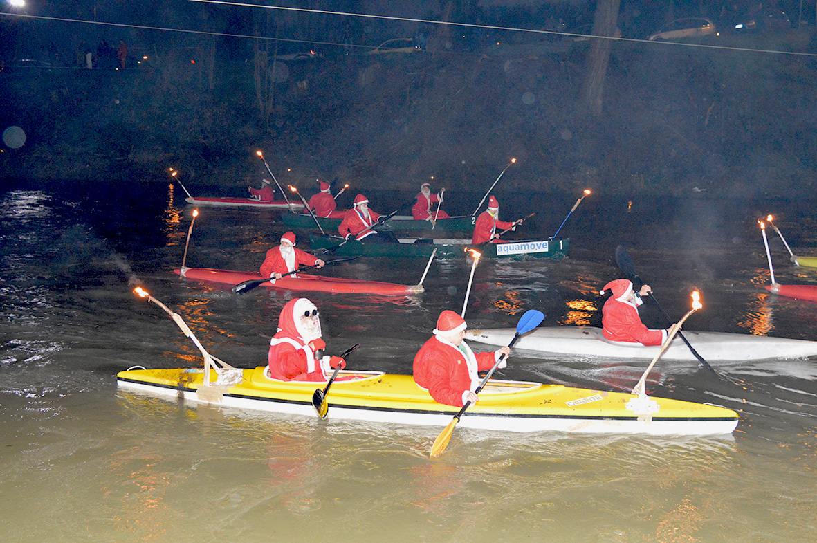 Puntuale, ormai da 40 anni, Babbo Natale è sceso a colpi di pagaia fra le sponde del fiume Tevere: una cornice di pubblico, in prevalenza famiglie con bambini al seguito, turisti, davvero imponente. Spettacolo unico “mozzafiato” a Città di Castello in provincia di Perugia per festeggiare il Natale in maniera davvero originale. 25 “Santa Claus” vestiti di tutto punto con tanto di barba bianca cappello e divisa rossa d’ordinanza hanno solcato nel pomeriggio le acque del fiume Tevere all’altezza del Ponte che attraversa la città in prossimità della sede del pluridecorato Canoa Club Città di Castello (dei campioni del mondo Mirko Spelli e Carlo Mercati) che da quasi 40 anni organizza questo evento straordinario e ricco di fascino per la gioia di grandi e soprattutto dei più piccoli. Luci, fuochi e fiaccole precedute da una discesa mattutina preparatoria della memorabile giornata caratterizzata da condizioni meteo favorevoli dopo i temporali e allagamenti dei giorni scorsi. E così nel pomeriggio canoe illuminate dalle torce, decine di candele di cera lungo il percorso fluviale, altri piccoli lumi trasportati dalla corrente sulle note di canzoni e brani natalizi e il commento puntuale dello speaker, Francesco Izzo, che ha scandito i vari momenti della giornata. E poi fuochi in prossimità delle sponde per riscaldare i numerosi turisti e visitatori che hanno deciso di prendere parte a questa manifestazione dopo il tradizionale pranzo di Natale. Appena è scesa l’oscurità i canoisti, travestiti da Babbo Natale hanno iniziato a percorrere le acque del fiume, per circa 800 metri a bordo delle loro canoe, in una cornice davvero scenografica, con il presepe pensile illuminato e i fuochi d’artificio a rendere ancora memorabile ed unica in Italia (senza dubbio la prima in assoluto) che dal 1981, da 39 anni, per volontà dell’allora Presidente del Canoa Club Città di Castello, Giancarlo Gildoni e di tutto il consiglio direttivo si tramanda ancora oggi all’insegna di tante presenze di cittadini e turisti. Qualcuno si è fermato sopra il ponte del Tevere, tanti lungo le sponde. Un vero e proprio bagno di folla per l'edizione 2019. Vin brulè, panettone, pandoro, caramelle, dolci e soprattutto tanti giocattoli per la gioia dei bambini hanno caratterizzato il contorno della kermesse che il Presidente del Canoa Club Città di Castello, Sandro Paoloni ha definito, “un evento che ormai è un appuntamento stabile per tutti e non solo e che grazie al comune di Città di Castello che ci sostiene sempre vorremmo rilanciare anche in versione turistica e di promozione del territorio, delle tradizioni locali.” Il sindaco, Luciano Bacchetta, a nome di tutta la giunta ha rinnovato ancora una volta, agli organizzatori e ai numerosi volontari che proprio il giorno Natale si dedicano ormai da quasi 40 anni ad allestire questa unica e sempre coinvolgente manifestazione, “i più sentiti ringraziamenti e attestati di stima nella consapevolezza di lavorare in sinergia anche per il futuro per valorizzare e potenziare ulteriormente questa iniziativa che travalica i confini regionali.”