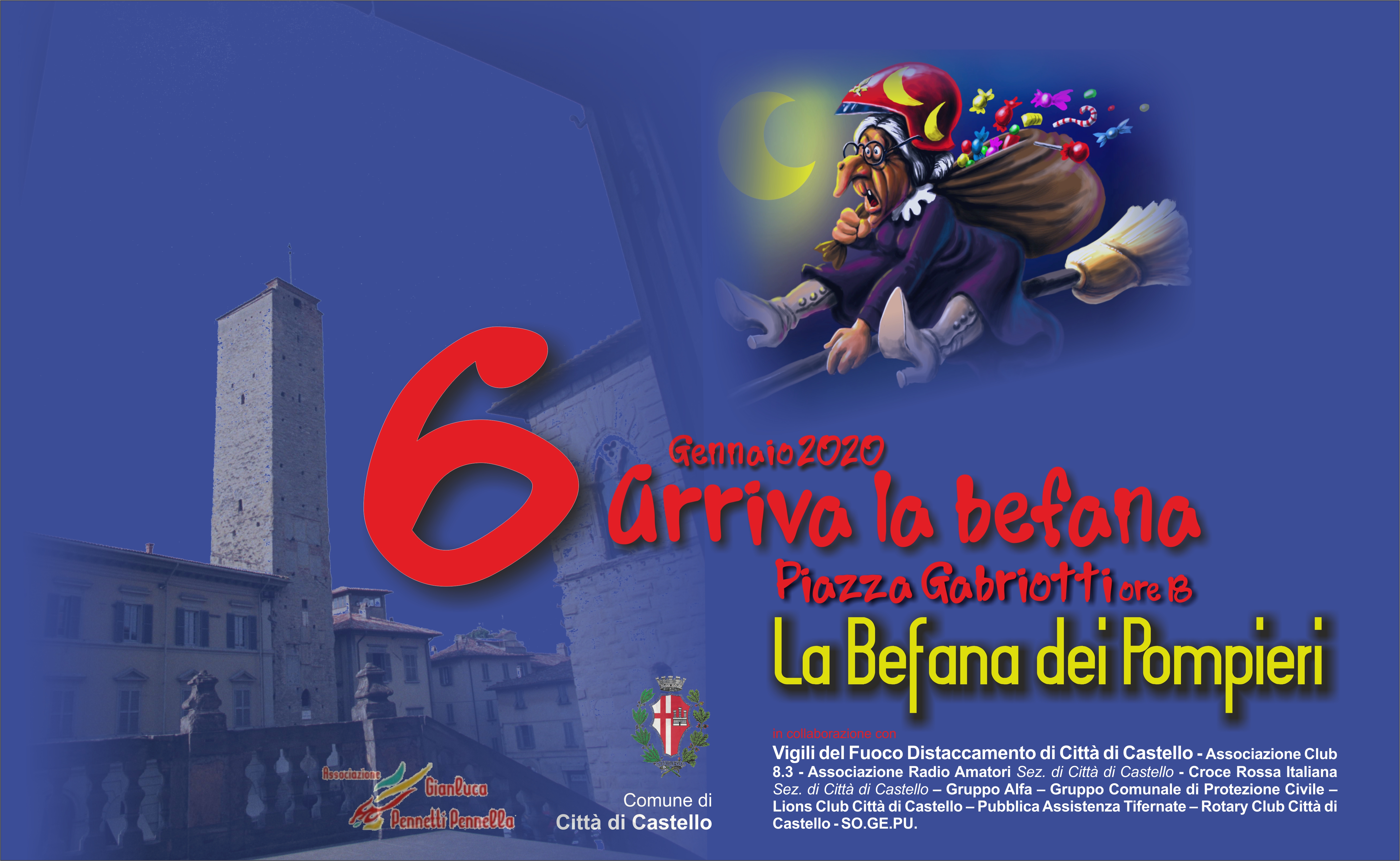 Per l’Epifania appuntamento confermato con la Befana dei Pompieri, che volerà nel cielo di Città di Castello per atterrare in piazza Gabriotti e dispensare sorrisi e dolci ai bambini. “Lunedì 6 gennaio si rinnova una delle più belle tradizioni della nostra città, che è stata tra le prime ad allestire la spettacolare rappresentazione dell’arrivo della Befana grazie alla collaborazione che i Vigili del Fuoco del distaccamento di Città di Castello offrono con entusiasmo, coraggio e professionalità”, annunciano il sindaco Luciano Bacchetta e l’assessore al Commercio e Turismo Riccardo Carletti, che invitano i tifernati a partecipare all’iniziativa. Nel ringraziare il comandante provinciale dei Vigili del Fuoco Michele Zappia e il capo distaccamento locale Giuseppe Gennatiempo, unitamente all’Associazione Gianluca Pennetti Pennella, Bacchetta e Carletti sottolineano “la riconoscenza per tutti coloro che daranno il proprio contributo alla riuscita della serata con generosità e senso di appartenenza alla comunità”. Nonostante il cantiere aperto nella residenza municipale per l’efficientamento termico della copertura, andrà in scena regolarmente l’abituale volo a 40 metri di altezza tra la torre civica e il campanile del Comune. La Befana dei Pompieri apparirà al pubblico alle ore 18.00, accompagnata dallo speaker Leonardo Caprini, che dal palco sistemato sotto la torre civica racconterà minuto per minuto le emozioni dell’esibizione. Una volta scesa a terra l’amata vecchietta regalerà ai bambini caramelle e abbracci affettuosi, insieme all’augurio di un sereno anno nuovo. Alle famiglie che vorranno assaporare fino in fondo la serata di festa, piazza Gabriotti offrirà dalle ore 17.30 l’appuntamento con “Aspettando la Befana”, l’intrattenimento per bambini con giochi e animazione. Al patrocinio del Comune e al protagonismo dei Vigili del Fuoco si legherà l’opera di volontariato di tante realtà del territorio: l’Associazione A.RI.RE (radioamatori Città di Castello); il Gruppo Alfa; il Gruppo Comunale di Protezione Civile; la Croce Rossa Italiana; la Pubblica Assistenza Tifernate; l’Associazione Club 8.3; Sogepu; il Lions Club Città di Castello; il Rotary Club Città di Castello; la Società Rionale Mattonata. Per consentire lo svolgimento in sicurezza dell’evento, il comando della Polizia Municipale ha emesso un’ordinanza che stabilisce dalle ore 16.00 alle ore 20.00 il divieto di sosta e fermata e il divieto di transito veicolare (compresi gli autorizzati, ma con eccezione per i mezzi di soccorso, di polizia e i mezzi tecnici per la manifestazione) su piazza Gabriotti e corso Cavour, con obbligo di svolta a destra su via del popolo verso via Plinio il Giovane. In via della Pendinella, inoltre, sarà istituito il doppio senso di marcia a senso unico alternato senza accesso su piazza Gabriotti.