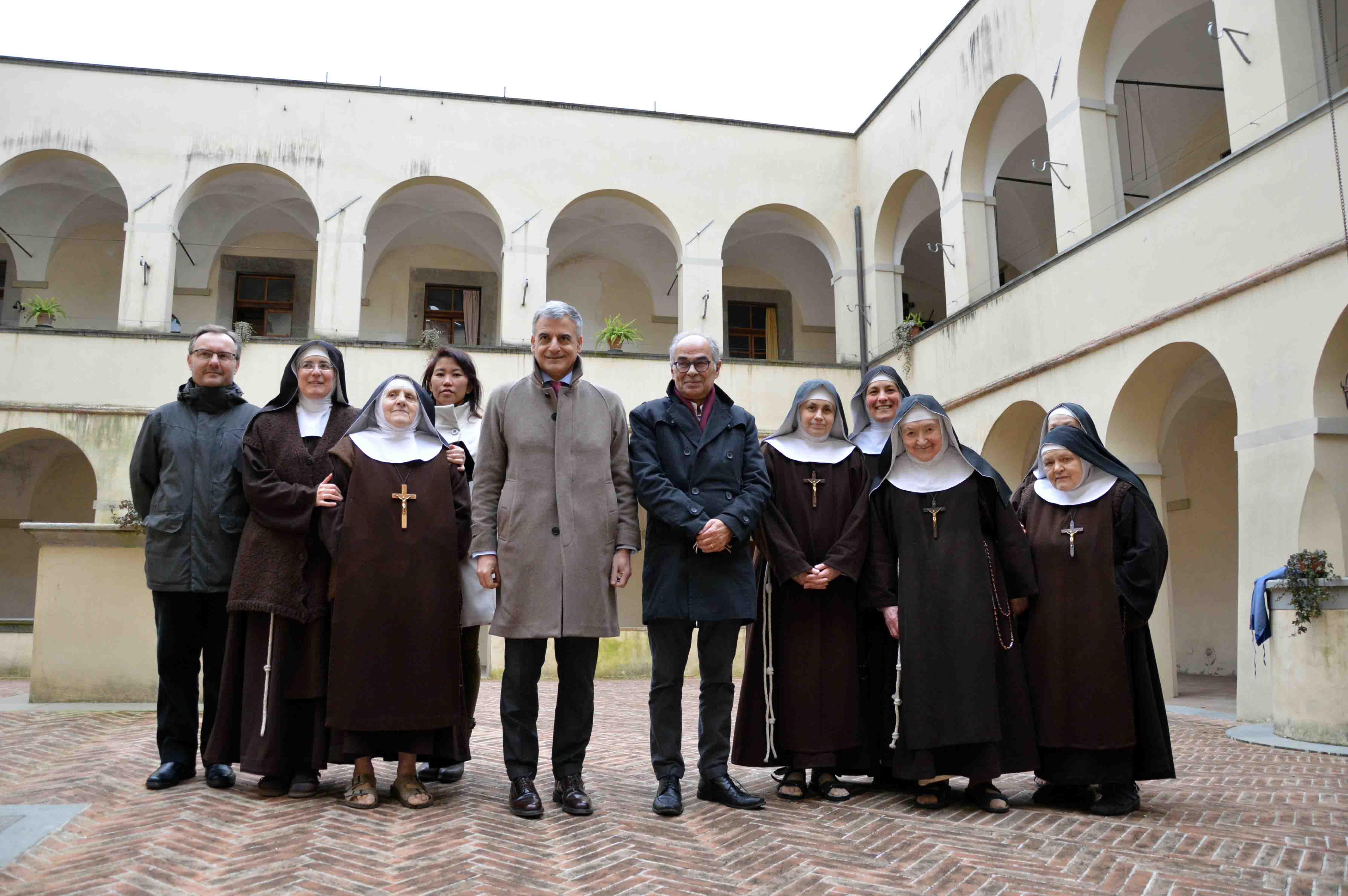 Per la prima volta in quasi 400 anni un prefetto e un sindaco hanno varcato insieme la soglia del monastero di clausura di Santa Veronica Giuliani a Città di Castello. E’ l’appuntamento con la storia di cui sono stati protagonisti stamattina il prefetto di Perugia Claudio Sgaraglia e il primo cittadino tifernate Luciano Bacchetta, che hanno fatto visita alle otto monache dell’ordine delle Clarisse Cappuccine guidate dalla badessa madre Giovanna. L’incontro era stato promesso dal rappresentante territoriale del Governo in occasione della recente visita alla ventesima Mostra di Arte Presepiale di Città di Castello, quando aveva manifestato la curiosità di conoscere le suore assurte alla notorietà internazionale sull’onda del clamore mediatico generato dalla notizia della pubblicazione del calendario di clausura che, per iniziativa dell’associazione Le Rose di Gerico, in dodici scatti ha ritratto per la prima volta i luoghi di preghiera del monastero di Santa Veronica Giuliani. Accolti dalle monache, sindaco e prefetto hanno visitato il monastero fondato nel 1643 da monsignor Giovanni Maria Cuccioli, un luogo aperto all’esterno sporadicamente in occasione della celebrazione della santa cui è dedicato e di pochissime altre ricorrenze, dove le religiose si dedicano a vita interamente contemplativa, secondo la regola di santa Chiara d’Assisi. Ad accompagnarli, insieme ai rappresentanti del Commissariato di Pubblica Sicurezza e della Polizia Municipale, c’erano il parroco di Santa Maria delle Grazie don Andrea Czortek, il direttore dell’ufficio diocesano per i Beni Culturali Ecclesiastici Gian Franco Scarabottini, il collaboratore parrocchiale di Santa Maria Maggiore don Nicola Testamigna e per l’associazione Le Rose di Gerico, che cura l’accoglienza dei pellegrini nei luoghi di Santa Veronica, la presidente Angelica Lombardo e Claudio Tomassucci. Nel chiostro dal quale si scorge la cella di Santa Veronica Giuliani le monache hanno raccontato la quotidianità della vita di clausura, testimoniando la propria vocazione, insieme alla riconoscenza per l’opportunità di incontrare i rappresentanti istituzionali, con i quali si sono intrattenute con particolare piacere, anche all’interno del piccolo museo che custodisce i ricordi di Santa Veronica e della beata Flórida Cèvoli. “Abbiamo incontrato monache di una simpatia e di una semplicità straordinarie, dalle quali dobbiamo prendere esempio per la capacità di vivere in prima persona e di trasmettere valori di unità e solidarietà, che per tutti dovrebbero essere di riferimento nella quotidianità, nel lavoro come nelle relazioni sociali”, ha dichiarato Sgaraglia, nel sottolineare con apprezzamento l’iniziativa editoriale della pubblicazione del calendario di clausura: “un’idea importante e geniale, dalla quale è venuto un contributo davvero rilevante a far conoscere ciò che di bello abbiamo in Umbria, un compito che spetta anche a noi come rappresentanti delle istituzioni pubbliche per sostenere il turismo e l’economia della provincia e della regione”. Sgaraglia è stato il primo prefetto in assoluto a entrare nel monastero, mentre il sindaco lo fa occasionalmente per le cerimonie religiose. “Questa di oggi è una bellissima opportunità di sottolineare la vicinanza e l’attenzione delle istituzioni pubbliche alla vita consacrata alla fede che conducono le monache di clausura di Santa Veronica ed è un viatico importante per rafforzare il legame profondo con la comunità di Città di Castello”, ha affermato Bacchetta, che ha ringraziato il prefetto “per la grande disponibilità che dimostra costantemente verso la nostra città, grazie alla quale abbiamo l’opportunità di esercitare un’azione sinergica sui temi della legalità e della sicurezza, ma anche di lavorare su progettualità importanti, come quella che riguarda la conservazione e il restauro delle chiese tifernati di proprietà dello Stato”. Dopo la visita al monastero, Sgaraglia ha infatti raggiunto la vicina chiesa della Madonna delle Grazie, di proprietà del Fondo Edifici di Culto (Fec), dove insieme al parroco don Czortek si è informato sui prossimi lavori di ristrutturazione della cappella e sulle esigenze di intervento che riguardano la pavimentazione e la tinteggiatura dell’edificio. “Con molta gioia continuiamo la tradizione religiosa del monastero e siamo onorate della visita del prefetto e del sindaco, perché è importante testimoniare la nostra scelta di vita”, ha commentato madre Giovanna, che ha puntualizzato: “noi siamo nella chiesa come testimonianza di sobrietà, di semplicità, di preghiera e, anche se oggi qui siamo meno di un tempo, la nostra forza è nella testimonianza di Dio, che siamo felici di continuare in tutte le occasioni e con tutte le possibilità che possiamo avere”. Con il sindaco Bacchetta e il prefetto Sgaraglia, la badessa del monastero ha rivissuto l’esperienza del calendario di clausura, intitolato “Laus Deo” come amava scrivere Santa Veronica Giuliani a conclusione delle lettere e delle pagine del suo diario, un’iniziativa senza precedenti per portare nelle case e nei luoghi di lavoro la conoscenza della santa, degli spazi più intimi del monastero e dei momenti di vita comunitaria delle suore. Realizzato dai fotografi Enrico Milanesi, Giuseppe Marsoner e Silvio Ficarra, il calendario ha fatto il giro del mondo, grazie alla collaborazione con la comunità delle Clarisse Cappuccine e il supporto di due aziende tifernati, Petruzzi Editore per la stampa e Cartoedit, con Simona Ciarabelli, per la confezione. Proprio lo stabilimento del cavalier Lucio Ciarabelli è stato così l’ultima tappa della visita del prefetto Sgaraglia, che ha voluto conoscere da vicino anche i processi produttivi che hanno portato alla realizzazione del calendario.