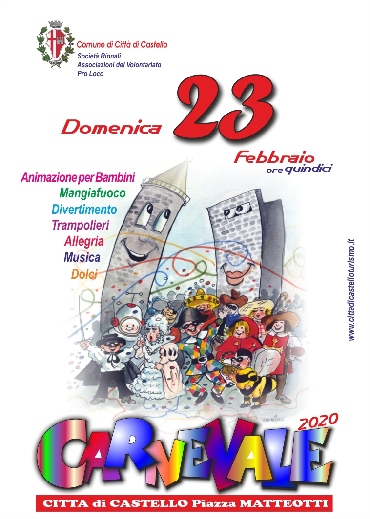 Grande fermento anche quest’anno per l’arrivo del Carnevale in Piazza, organizzato dall’Amministrazione comunale di Città di Castello insiema a società rionali, pro-loco e associazioni di volontariato domenica 23 febbraio 2020 a partire dalle ore 15.00. L’appuntamento è una tradizione per i bambini e per le famiglie e sarà riproposto con la formula di successo degli anni precedenti. Animazione dunque per le maschere e per il pubblico con mangiafuoco, trampolieri, musica, iniziative per i più piccoli grazie alla collaborazione con i soggetti del territorio, che per l’assessore al Turismo e Commercio Riccardo Carletti “sono un supporto imprescindibile per il programma e la gestione di un evento che coinvolge tantissime persone e che è un momento di grande festa in tutto il centro storico”.