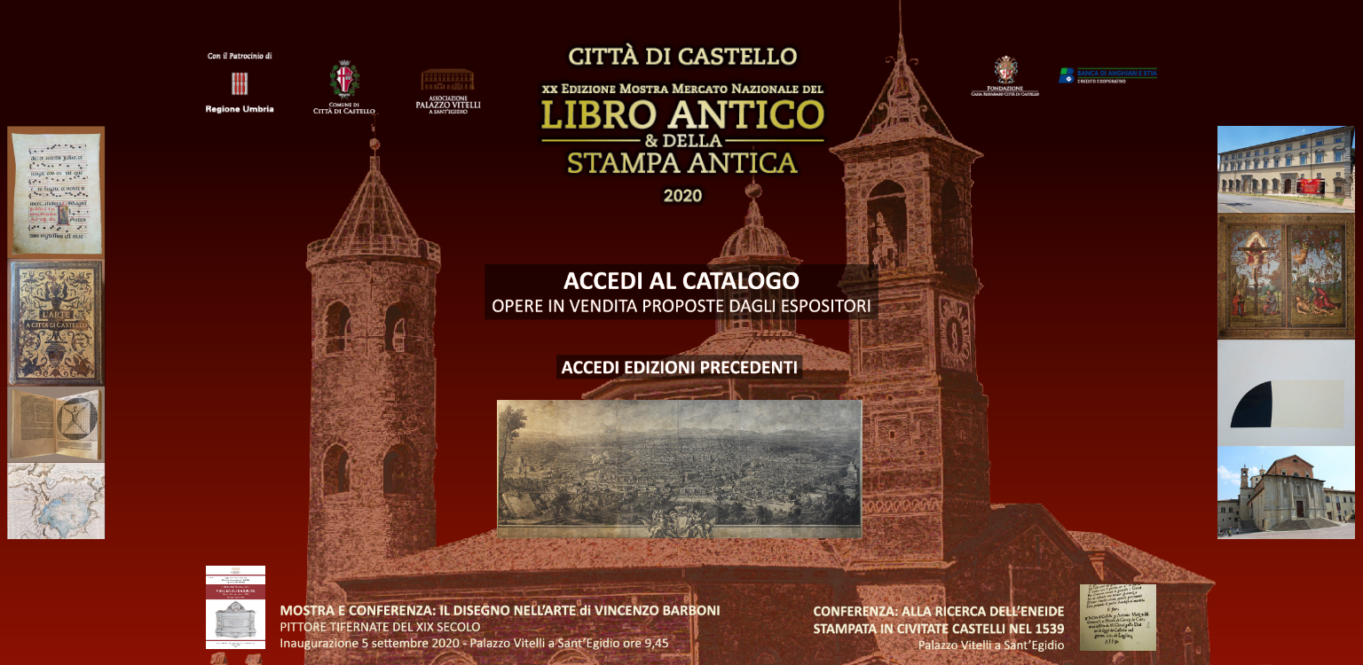 Sono già online da oggi le circa 400 opere rare inserite nel catalogo di vendita collettivo che dà veste virtuale alla XX Mostra Mercato Nazionale del Libro Antico e della Stampa Antica di Città di Castello, il primo evento di antiquariato librario a svolgersi sul web per le incertezze e le restrizioni dovute all’emergenza da Covid-19. Con un giorno di anticipo gli organizzatori, Comune e Associazione Palazzo Vitelli a Sant’Egidio con il coordinamento scientifico di Giancarlo Mezzetti, hanno aperto la vetrina multimediale consultabile sul portale internet della manifestazione (www.mostralibroantico.it) che offre l’opportunità ad esperti e appassionati di ammirare il meglio dell’offerta antiquaria dei 40 espositori abituali della rassegna, provenienti dall’Italia, dalla Francia, dall’Olanda e dalla Spagna. Schede descrittive e prezzi consentiranno agli interessati di approfondire la conoscenza delle opere disponibili sul catalogo e di procedere all’eventuale acquisto. Tra i pezzi di maggior valore, da segnalare un pregiato manoscritto d’ore della metà del 1400 con immagini miniate, composto da 74 carte e in vendita a 19 mila 500 euro, ma anche un prezioso libro di viaggi da Venezia a Costantinopoli del 1660, con 75 tavole, quotato 11 mila euro. Nelle pagine del catalogo trovano spazio anche un trattato di astronomia del 1643 realizzato da Francesco Maurolico, edizioni facsimilari di esemplari unici custoditi nei musei, una delle più belle vedute di Roma esistenti realizzata da Giuseppe Vasi nel 1765, carte geografiche XVI e XVII secolo finemente acquerellate, una rara collezione di stampe giapponesi e incisioni di antichi maestri, come Albrecht Dürer e Andrea Mantegna. Nei prossimi giorni il catalogo verrà pubblicato anche sui più importanti siti internet italiani ed esteri di settore, consentendo alla Mostra del Libro Antico e della Stampa Antica di proporsi comunque alla platea di cultori del genere che quest’anno non potranno darsi appuntamento a Città di Castello. Nell’ambito dell’edizione 2020 sarà promossa anche una giornata di studi: il 5 settembre saranno organizzati due eventi collaterali a Palazzo Vitelli a Sant’Egidio dopo l’inaugurazione ufficiale della 20^ edizione alle ore 9.45. A partire dalle ore si svolgerà 10.00 la conferenza dal titolo “Alla ricerca dell’Eneide stampata in Civitella Castelli nel 1539” con la presentazione della ristampa facsimilare dell’Editrice Pliniana (con il sostegno della Fondazione Cassa di Risparmio di Città di Castello) di una rarissima pubblicazione, “Il secondo di Vergilio in lingua volgare volto da Hippolito De’ Medici cardinale” impressa in Città di Castello da Antonio Mazochi Cremonese e Nicolo de’ Gucci da Cortona nel 1539. Dalle ore 11.30 si terranno la presentazione e l’illustrazione di un saggio originale di un pittore tifernate del XIX secolo poco conosciuto come Vincenzo Barboni, di cui saranno esposti oltre 50 disegni originali e inediti in una mostra curata da Estela Nisi. Relatori dei due appuntamenti saranno, rispettivamente, Giovanna Zaganelli, direttore del Dipartimento di Scienze Umane e Sociali dell'Università per Stranieri di Perugia, che ha curato con Sarah Bonciarelli l’edizione critica e di commento all’opera di Virgilio, e il presidente dell’associazione Palazzo Vitelli a Sant’Egidio Fabio Nisi.