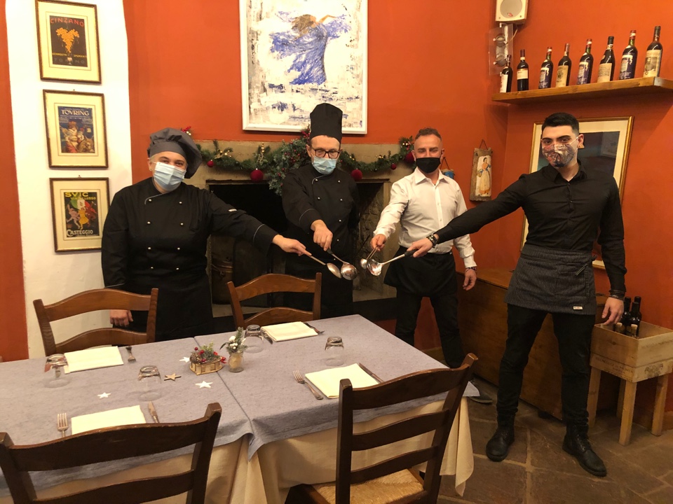 L’unione fa la forza anche in cucina. Belle storie di “resilienza” e speranza al tempo del Covid. Quattro ristoratori di Città di Castello, titolari di locali storici del cuore cittadino, invece che piangersi addosso, reclamare giustamente i propri diritti e “ristori” e chiudere i battenti per mancanza clienti a causa delle restrizioni e norme previste dai vari decreti e regolamenti, hanno deciso di costituire per un periodo “prova” fino all’Epifania, un’unica attività ed iniziare a servire succulenti piatti all’ora di pranzo nel ristorante, dei quattro, con maggiori posti a tavola e possibilità di adeguato distanziamento e sicurezza per i clienti. Una novità assoluta di “mutua assistenza” culinaria destinata a fare scuola e ad essere presa come esempio di determinazione e voglia di andare avanti nonostante tutte le difficoltà. Da oggi, Giacomo Brunetti, Dimitri Boriosi, Sandro Castellani e Sara Bastianioni, hanno deciso di incrociare i “mestoli” in segno di sfida per affrontare una prova importante e rimettersi ai fornelli insieme per queste festività no-stop fino all’Epifania. Il ristorante Accademia-Hostaria di Giacomo Brunelli, in via del Modello, fra la cattedrale, il palazzo comunale, a pochi passi dalla Pinacoteca (che custodisce i gioielli di Raffaello e Signorelli), Palazzo Albizzini (scrigno dei tesori del grande maestro Alberto Burri) è diventato per necessità il locale di tutti anche degli altri tre colleghi (titolari di trattorie e ristoranti nel salotto buono della città tutti nel raggio di 300 metri distanza) che nel frattempo hanno abbassato le saracinesche ed hanno messo su casa e bottega in quel locale del collega che offre spazi più ampi. Due di loro in cucina a preparare piatti della tradizione umbra (cappelletti in brodo, tagliatelle al tartufo bianco, arrosti vari e dolci di tradizione in vista del Natale) con tanto di cappello e divisa d’ordinanza e mascherina nel rispetto delle norme sanitarie anti-Covid19, e gli altri due colleghi di avventura pronti ad improvvisarsi camerieri di sala ed accogliere i clienti che potranno prenotare via mail o telefono un posto a tavola in sicurezza. “Non avevamo altra soluzione, chiudere o prolungare l’agonia post-lockdown, attendere invano ristori insufficienti o inesistenti o tentare come abbiamo fatto di unire le forze e dare vita ad un’unica attività fino all’Epifania nel locale più grande per capienza e maggiore possibilità di garantire distanziamento a norma di legge” – hanno dichiarato con orgoglio e determinazione, Giacomo, Dimitri, Sandro e Sara affiancato da giovani collaboratori e familiari. “Fra noi non c’è mai stata rivalità anzi, abbiamo sempre collaborato prima di questa emergenza del Covid e subito dopo cercato di restare uniti ed andare avanti con la speranza che prima o poi ne usciremo fuori da questo incubo e torneremo nei nostri locali come tutti gli altri ristoratori della citta’ a servire piatti della tradizione umbra e a promuovere la nostra bellissima città, la sua arte, la sua storia”. “Fino all’Epifania, a pranzo saremo aperti tutti i giorni, Natale, Capodanno, primo dell’anno prossimo compreso e chissà – concludono i quattro “moschettieri-ristoratori” – proseguiremo anche oltre questo periodo un esperienza unica che sta unendo e cimentando sempre di più amicizia e amore per il nostro lavoro”. Una iniziativa unica che potrebbe far scuola a livello nazionale definita dal sindaco, Luciano Bacchetta e dall’assessore al Commercio e Turismo, Riccardo Carletti, “uno straordinario esempio di volontà, determinazione e resilienza e amore per la citta’ e le sue tradizioni messa in atto da persone che si sono rimboccate le maniche ed hanno deciso di unire le forze. I ristoratori, come i titolari di esercizi pubblici al pari di tante altre categorie produttive sono state colpite pesantemente dalla pandemia e attendono segnali di sostegno concreti dal governo in termini di ristori ed aiuti. Questa iniziativa ne siamo sicuri servirà ad attirare ancora di più l’attenzione su questi settori. Bravi davvero, le istituzioni sono con voi: da Città di Castello un bel segnale, una bella storia, che in futuro potrebbe ripetersi anche per promuovere tutti assieme in unico grande ristorante della città le prelibatezze gastronomiche locali”, hanno concluso il sindaco e l’assessore. La notizia era stata anticipata nei giorni scorsi dal “Corriere dell’Umbria” ed oggi prende il via ufficialmente. “Noi siamo qui – hanno rilanciato i quattro ristoratori – pronti a servire ed accogliere i clienti. Non molliamo”. A tenere a battesimo il varo di questa inedita alleanza ai fornelli, un esperto di prelibatezze agro-alimentari, Saverio Bianconi, imprenditore della lavorazione e commercializzazione di tartufi con la sua maxi-affettatrice (la più grande del mondo) scovata per caso in un mercatino dell’antiquariato ed ora pezzo pregiato del suo personale museo delle tradizioni: ”avanti ragazzi siamo tutti con voi e il tartufo sarà la vostra riscossa”.