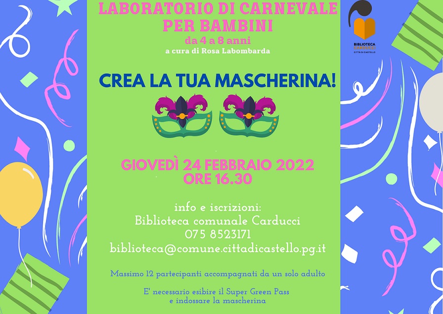 un laboratorio di Carnevale dedicato alle maschere. A curare l’iniziativa dal titolo “Crea la tua mascherina!” sarà Rosa Labombarda, che aiuterà i bambini a realizzare le maschere dei personaggi più famosi del Carnevale.