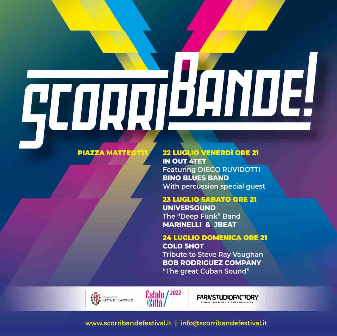 Domani Venerdì 22 Luglio nel centro storico in piazza Matteotti, prendera’ il via “Scorribande Festival”, tre giorni di musica con sei band che si alterneranno sul palco principale. Cominceranno la tromba di Diego Ruvidotti, seguito dal Blues dei Bino Blues Band. Sabato 23 Luglio il palco ospiterà l'elettro funk degli Universound e il beat jazz di Marinelli & jbeat. Domenica 24 Luglio gran finale con Cold Shot, tribute band di Stevie Ray Vaughan e a seguire Bob Rodriguez and the Great Cuban Sound. Il festival “SCORRIBANDE!” nasce dalla collaborazione tra Alberto Fabi e Marco Sarti che ne cura la direzione artistica è un multikulti festival che prevede incursioni musicali e letterarie di viaggio ed un contest per gruppi emergenti che si svilupperà a partire dal mese di Ottobre. Si tratta dell’edizione zero e il Festival si concentrerà nelle giornate del 22, 23 e 24 Luglio. Sviluppato per l’estate in città ed in collaborazione con l’Assessorato alla cultura di Città di Castello si pone l’idea di riportare la musica di livello nel centro cittadino coinvolgendo sia le piazze che i locali. “SCORRIBANDE!” abbraccia ogni genere musicale dal pop al blues, dal rockal jazz. Inizio concerti ore 21.30. Ingresso gratuito. Patrocinio del comune di Città di Castello, Estate in Città 2022. www.scorribandefestival.it