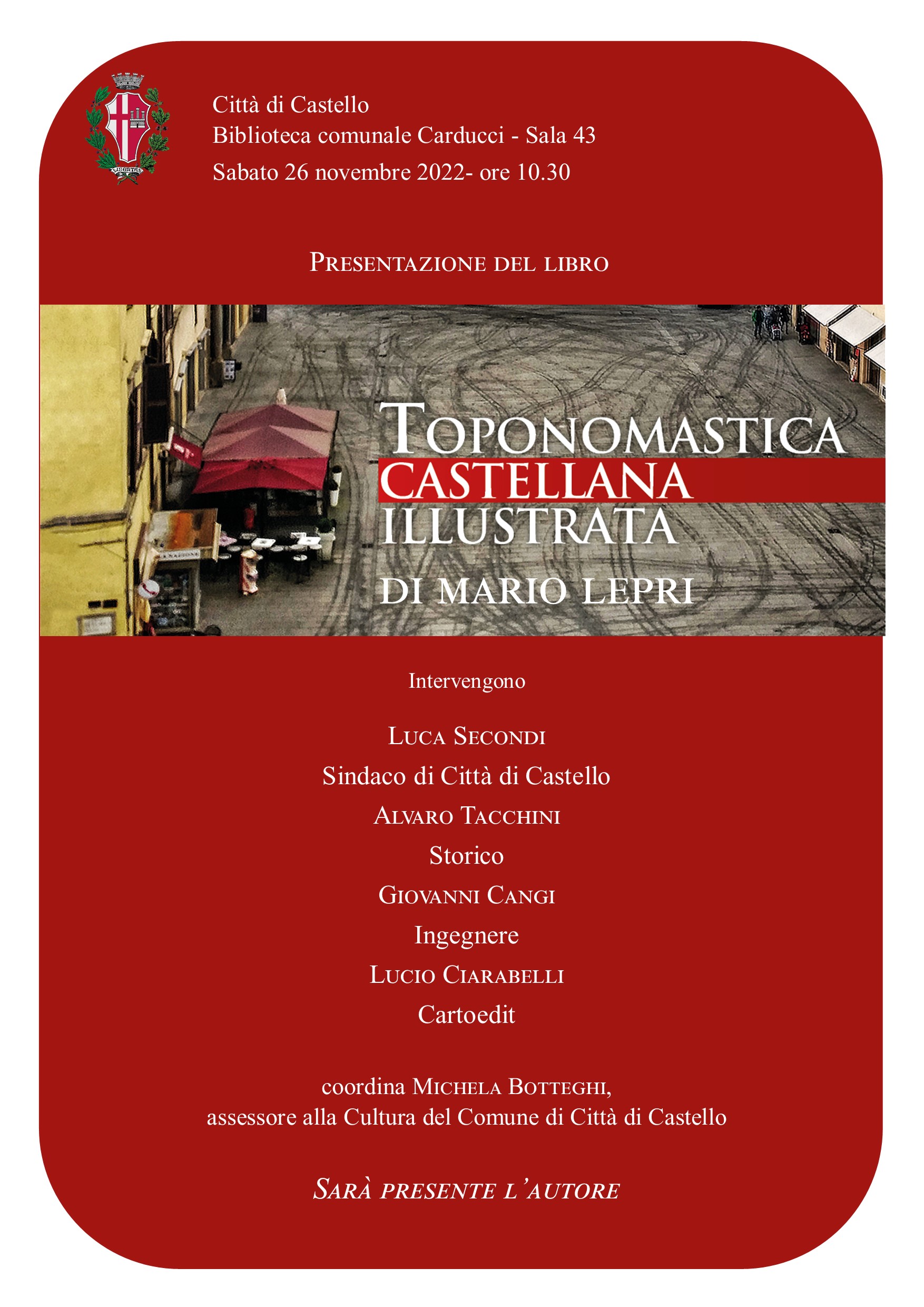 Sabato 26 novembre ore 10,30 in biblioteca "Carducci" sala 43 presentazione del volume, "Toponomastica castellana illustrata", (257 pag, Cartoedit), di Mario Lepri, raffinato fotografo e scrittore tifernate.