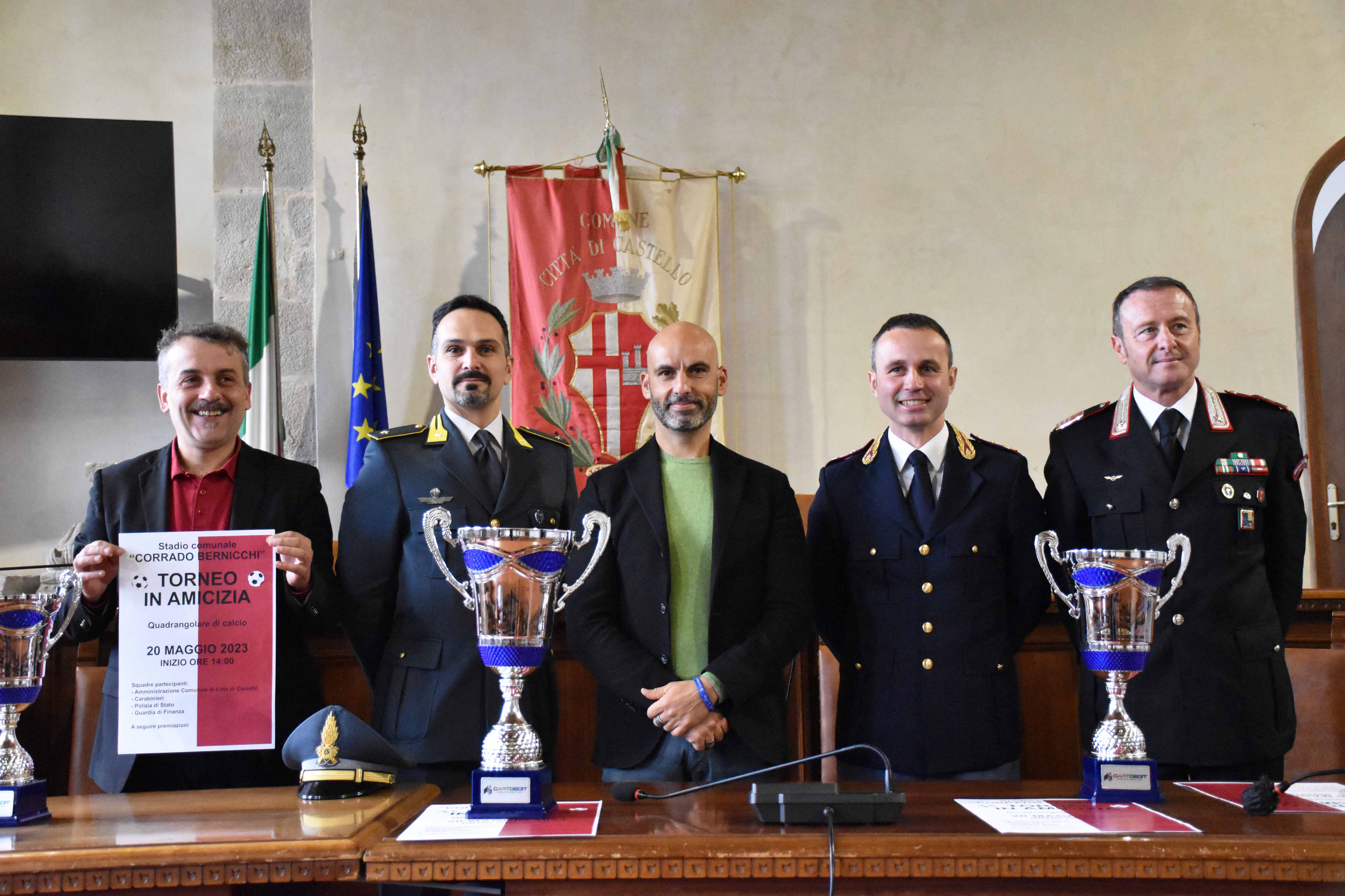 Ogni giorno in prima linea al servizio della città, tutori della legge e amministratori comunali saranno insieme anche nel nome dello sport, del calcio in particolare, passione che unisce tutti e che, con il secondo “Torneo in Amicizia” in programma venerdì 16 giugno alle ore 15.00 allo stadio comunale Corrado Bernicchi con ingresso libero, permetterà di condividere anche momenti di divertimento, oltre ai doveri di tutela della legalità e della sicurezza nell’esercizio dei rispettivi compiti istituzionali. Con la partecipazione della Guardia di Finanza, che si aggiungerà alle selezioni dei Carabinieri e della Polizia di Stato già protagoniste l’anno scorso insieme alla rappresentativa del Comune, quest’anno andrà in scena un quadrangolare inedito, nel quale nessuno ci starà a perdere e la vittoria sarà contesa fino all’ultimo calcio al pallone. Lo spirito di sana competizione che circonda l’evento è stato percepibile nella conferenza stampa di presentazione del torneo, nella quale il sindaco Luca Secondi e l’assessore allo Sport Riccardo Carletti, che saranno tra i primi a schierarsi in campo con la divisa dell’amministrazione comunale, hanno sottolineato l’amicizia e la voglia di stare insieme che caratterizza l’iniziativa. “Un modo che piace a tutti per coltivare, anche al di là delle responsabilità e dei compiti che ci vedono quotidianamente impegnati, le relazioni umane che sono alla base di un lavoro al servizio della comunità di Città di Castello che viene assicurato ogni giorno con grande spirito di collaborazione e sintonia”, hanno spiegato Secondi e Carletti, nel presentare l’evento insieme al comandante della stazione dei Carabinieri di Città di Castello Fabrizio Capalti, al vicedirigente del Commissariato di Pubblica Sicurezza di Città di Castello Dario Lemmi e al comandante della tenenza della Guardia di Finanza di Città di Castello Daniele Maggioni. Anche i rappresentanti delle forze dell’ordine hanno sottolineato la condivisione dello spirito dell’iniziativa e il piacere di ritrovarsi insieme in un contesto sportivo che è ideale per favorire la conoscenza reciproca e la sintonia, valori aggiunti nell’esercizio delle rispettive responsabilità nei confronti della collettività. Alla partita è preannunciata la partecipazione del questore di Perugia Giuseppe Bellassai, che già l’anno scorso fu tra i protagonisti in campo con la maglia numero 10 della Polizia di Stato. Grande curiosità accompagna la composizione delle squadre, nella quale sia l’amministrazione comunale che le forze dell’ordine cercheranno di selezionare le forze migliori per cercare di vincere il torneo. Il sorteggio che si è volto a margine della conferenza stampa ha stabilito gli accoppiamenti delle partite che decreteranno le due finaliste: i Carabinieri giocheranno con la Guardia di Finanza, mentre la Polizia di Stato se la vedrà con la rappresentativa del Comune. Alla cerimonia di proclamazione della selezione vincitrice parteciperanno anche Marco Brozzi e Lorenzo Giornelli di Ceramiche Noi, la cooperativa tifernate simbolo internazionale della resilienza, che ha realizzato piatti speciali per occasione. La presenza dell’azienda, che un mese fa nell’ambito della manifestazione “Buongiorno Ceramica” fu protagonista di una gara di solidarietà insieme ai maestri ceramisti locali in favore di Faenza, si lega anche alla finalità benefica del Torneo in Amicizia: nell’ambito della manifestazione saranno infatti raccolte le donazioni libere dei giocatori in campo, del pubblico in tribuna e di chiunque voglia dare il proprio contributo. I proventi saranno devoluti in favore delle popolazioni alluvionate dell’Emilia Romagna, in particolare di Cesena, realtà con la quale da decenni Città di Castello intreccia rapporti economici e commerciali, ma anche sportivi, grazie alla stretta e consolidata sinergia nel segno dell’equitazione tra Ippodromo del Savio e Mostra Nazionale del Cavallo. A concludere il torneo sarà l’immancabile “terzo tempo” nel segno del piacere della tavola, con una conviviale che raccoglierà tutti i protagonisti della serata nella club house dello stadio Bernicchi.