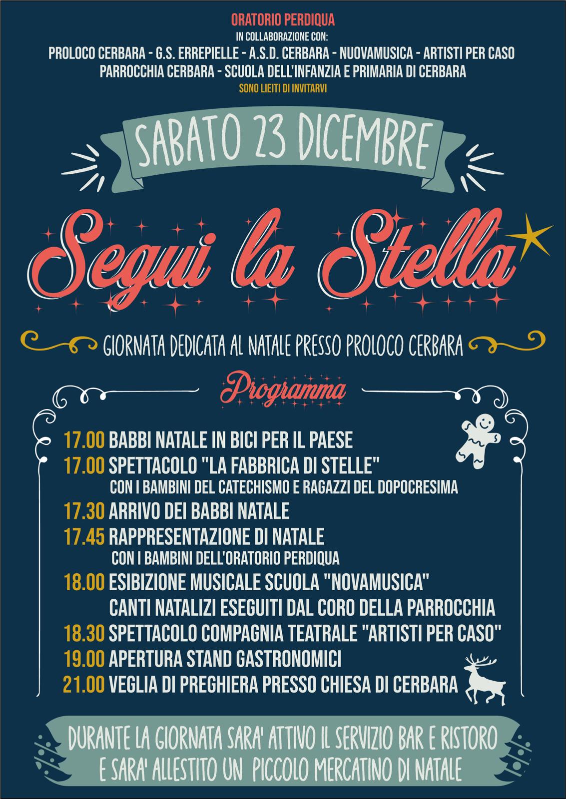 A Cerbara il Natale si festeggia davvero tutti insieme, con le associazioni del territorio e la parrocchia riunite per regalare a grandi e piccini un pomeriggio di allegria e divertimento. Sabato 23 dicembre la pro loco della frazione tifernate si trasformerà a partire dalle 17.00 in un villaggio incantato nel segno di Babbo Natale e delle tradizioni più belle delle festività, con spettacoli, esibizioni e l’immancabile appuntamento con la gastronomia tipica. “Segui la stella” è il titolo di un cartellone di eventi pensato per vivere un momento di ritrovo ispirato alla magia del Natale e trascorrere ore spensierate e in compagnia. Ad aprire il programma poco prima delle ore 17.00 saranno i Babbi Natale in bicicletta, che gireranno per vie e piazze di Cerbara per donare sorrisi e buonumore, invitando tutti a raggiungere la sede della Pro Loco, dove alle 17.00 andrà in scena lo spettacolo dei bambini del catechismo e dei ragazzi del dopocresima intitolato “La fabbrica di stelle”. Alle 17.30 appuntamento con i Babbi Natale che arriveranno per fare festa con i bambini. A seguire, alle ore 17.45, sarà la volta dei piccoli dell’oratorio Perdiqua, che reciteranno nella rappresentazione di Natale. Gli allievi della scuola Novamusica suoneranno a partire dalle 18.00 accompagnando i canti natalizi del coro della parrocchia e gli spettacoli continueranno con la rappresentazione teatrale della compagnia “Artisti per caso”, alle ore 18.30. Con l’avvicinarsi dell’ora di cena, alle ore 19.00, spazio al buon cibo con gli stand gastronomici che daranno la possibilità di gustare la buona cucina dei volontari della Pro Loco. A concludere la serata sarà la veglia di preghiera nella chiesa di Cerbara, un appuntamento con la spiritualità del Natale e con gli auspici di serenità e pace che caratterizzano il periodo delle festività. Per tutta la giornata sarà a disposizione un servizio di bar e ristoro e quanti arriveranno alla Pro Loco per assistere agli spettacoli e alle esibizioni in programma avranno anche la possibilità di acquistare gli ultimi doni da mettere sotto l’albero di Natale in un originale mercatino allestito dagli abitanti della frazione. “Il protagonismo dei territori, la voglia di fare delle tante comunità di Città di Castello, è un prezioso valore aggiunto del cartellone di Natale in città”, osserva l’assessore al Commercio e al Turismo Letizia Guerri, che sottolinea come “tutti gli eventi che ci accompagneranno nel periodo delle festività diano il senso di una città viva e accogliente, nella quale trovare molti motivi per stare insieme, divertirsi e vivere serenamente l’atmosfera del Natale”. L’assessore coglie l’occasione per ringraziare l'oratorio Perdiqua, la Pro Loco di Cerbara, il Gruppo Sportivo Errepielle, l’ASD Cerbara, Novamusica, la compagnia Artisti per caso, la parrocchia di Cerbara, le scuole dell’infanzia e primaria della frazione, “per la bella collaborazione con cui contribuiranno a offrire un’occasione in più a tifernati e turisti per passare i giorni di festa a Città di Castello”.