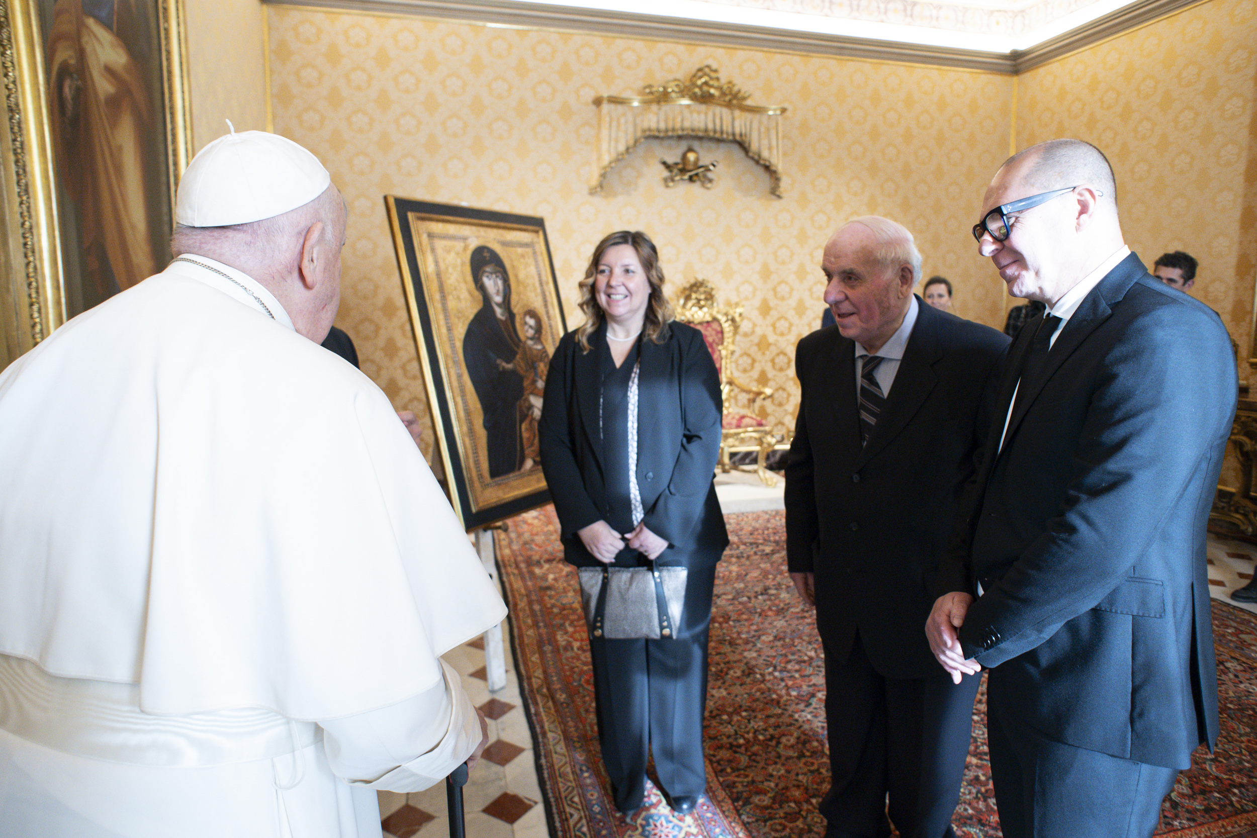 La Salus Populi Romani per Papa Francesco firmata dalla Bottega Tifernate: è la terza opera in pochi anni realizzata per il Santo Padre a Città di Castello dallo staff del maestro Stefano Lazzari che assieme alla sorella Francesca e il padre Romolo gestisce il laboratorio artistico unico al mondo specializzato nella riproduzione di qualsiasi opera su supporto originario grazie ad una tecnica, “Pictografia”, brevettata. Ieri, in Vaticano durante l’udienza ai membri del Consiglio di amministrazione e del Comitato scientifico della Fondazione memorie audiovisive del cattolicesimo (Mac), l’opera, l’Icona Salus Populi Romani è stata donata a Papa Francesco da monsignor, Dario Edoardo Viganò, presidente della Fondazione Mac, che ha illustrato le motivazioni del prezioso e significativo dono. “Prima e al ritorno da ogni viaggio, il Santo Padre si reca nella basilica di Santa Maria Maggiore per una preghiera di fronte alla Madonna. Il suo desiderio, già manifestato pubblicamente, è quello di essere sepolto nella cappella Paolina di Santa Maria Maggiore, per stare per sempre vicino alla Madonna che si dice sia stata dipinta da San Luca. Così, grazie al maestro Stefano Lazzari e a tutto lo staff della Bottega Tifernate, abbiamo pensato di far realizzare la copia esatta dell’opera così che la possa vedere ogni giorno”, ha concluso Viganò. Grande emozione anche nelle parole pronunciate dal maestro Lazzari durante il breve e memorabile momento di incontro con il Santo Padre accanto all’opera realizzata. “Il Papa ha già due nostre opere nella sua residenza Casa Santa Marta, che abbiamo realizzato e consegnato in questi ultimi anni – ha dichiarato con orgoglio Stefano Lazzari - eppure, ricreare il dipinto della Salus Populi Romani, così amato da Papa Francesco tanto da aver espresso la volontà di farsi seppellire al suo fianco, è un’emozione indescrivibile. Abbiamo lavorato affinché lui possa vivere tutto l’amore e il pathos che prova di fronte all’originale. Oggi è stata per noi un’altra giornata straordinaria che non dimenticheremo”. La Salus Populi Romani è un’opera molto amata da Papa Francesco. La lavorazione, in “pictografia” su tavola, riproduce fedelmente i passaggi della pittura a “regola d’arte”. Le figure, così come lo sfondo, sono state ricreate in ogni minimo particolare con l’ausilio di una lente d’ingrandimento. La doratura, in oro zecchino 24 kt. è stata applicata come nell’originale restaurato così da conferire un impatto estetico molto vicino al vero. Un lavoro durato mesi e che ha coinvolto tutte le maestranze della Bottega Tifernate. La giornata memorabile dell’artigiano-artista umbro e della sua famiglia si è conclusa con la consegna a Papa Francesco di un volume sulla storia della Pinacoteca di Città di Castello e del suo maestro simbolo, Raffaello e di un pregiato manufatto realizzato nel laboratorio della Tela Umbra, storico laboratorio tessile unico al mondo nella lavorazione del lino. Il sindaco di Citta’ di Castello, Luca Secondi, per tramite del titolare della Bottega Tifernate ha “ringraziato il Santo Padre per aver consentito ad un illustre concittadino di mettere ancora in risalto la sua eccezionale capacità creativa ormai apprezzata in tutto il mondo, propria della migliore tradizione e storia dell’artigianato locale.” “Attraverso Lazzari – ha precisato Secondi – abbiamo rivolto al Santo Padre un caloroso invito a visitare la nostra città, i suoi musei, chiese ed edifici di culto che custodiscono la storia e l’arte di secoli”. Per il maestro artigiano di Citta’ di Castello, che nel 1995 ha fondato la Bottega Tifernate con la sorella Francesca ed il padre Romolo, composta da un team di giovani pittori, cesellatori, intagliatori, non è la prima volta di trovarsi di fronte ad “committente” a dir poco speciale, con una propria opera degna di attenzione e ammirazione. Nel mese di maggio del 2018 ha infatti realizzato e consegnato al Pontefice, la copia di un Caravaggio, esposta a Casa Santa Marta ed un anno dopo nel dicembre 2019 una “copia” identica all’originale della “Crocifissione Bianca”, di Marc Chagall (1938, Olio su tela Chicago, Art Institute) portata a termine con certosina tecnica e attenzione nella sua bottega-laboratorio di Città di Castello dopo oltre sei mesi di lavoro. Costituita nel mese di marzo 2023 la Fondazione MAC - Memorie Audiovisive del Cattolicesimo nasce per rispondere all'urgenza culturale del recupero, della preservazione e della valorizzazione del patrimonio storico audiovisivo e di quello documentale ad esso collegato, relativo al cattolicesimo. Le direttrici di lavoro principali sono: la preservazione e l’accessibilità (incentivando progetti di restauro, anche digitale, digitalizzazione dei materiali d’archivio, la valorizzazione di quelli già digitalizzate attraverso la messa a disposizione di uno spazio comune di condivisione dei risultati) e la ricaduta culturale, accademica ed educativa. Fondazione MAC Memorie Audiovisive del Cattolicesimo