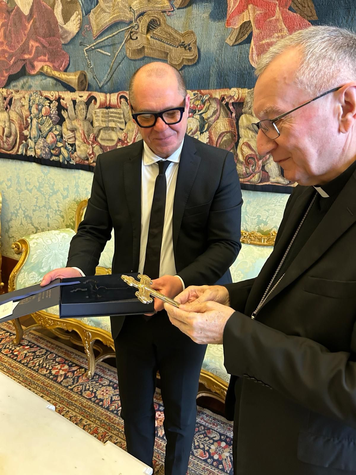 La «Croce del Giubileo», porta la firma della Bottega Tifernate ed in particolare del maestro Stefano Lazzari che ha realizzato il “bozzetto” e seguito ogni fase del progetto. Si tratta di un Crocifisso bifacciale, 18x13,7 cm in ottone finito in galvanica oro antico disegnato e concepito da Lazzari, su commissione della Edizioni San Paolo e realizzato in 1999 esemplari tutti numerati. “ L’ho visto diversi anni fa in una chiesa della provincia di Siena era un crocifisso del 1100 di rara bellezza che mi è rimasto impresso nella mente”, ha dichiarato con un pizzico di commozione e soddisfazione questa mattina il maestro Lazzari nel corso della cerimonia di consegna della “prova d’autore” al cardinale Pietro Parolin segretario di Stato della Santa Sede. La Croce ha due facce, con i simboli e i valori legati al tema del pellegrinaggio giubilare, che ha come motto « Pellegrini di Speranza », per accompagnare e celebrare l’Anno Santo del 2025. Fronte. È rappresentato il Cristo sì morto, ma non sofferente, felice di aver donato la sua vita per l’umanità. In alto, la sigla in lingua latina « INRI » che significa Iesus Nazarenus Rex Iudaeorum, che si traduce letteralmente in « Gesù nazareno re dei Giudei ». Ai lati sono rappresentati san Pietro e san Paolo, anch’essi autentici pellegrini di speranza, perché inviati dal Signore per portare nel mondo la sua Parola. In basso, le chiavi incrociate, che simboleggiano le chiavi affidate all’Apostolo Pietro. Verso. Il retro della Croce rappresenta in primo piano il Pellegrino. Non un Pellegrino qualunque, ma Gesù Cristo, che cammina con la Chiesa da 2000 anni, per la salvezza dell’umanità. L’angelo che assiste e segue il cammino del pellegrino, tiene in mano un nastro con l’iscrizione latina IVBILAEUM A.D. 2025 a testimoniare quanto sia importante che questo evento giubilare possa diventare per il mondo un autentico anno di grazia. In alto è rappresentato lo Stemma Paolino (il libro della Parola e la spada di san Paolo) a ricordo dei committenti, mentre in basso, la cupola di San Pietro è la meta « simbolica » del cammino del pellegrino. “Un’emozione fortissima, con questa opera abbiamo realizzato un sogno che da anni avevamo nel cassetto: essere qui oggi in Vaticano con il cardinale Parolin è davvero un sogno”, ha detto Lazzari, subito dopo la breve ma sentita cerimonia di consegna del crocifisso. Per il maestro artigiano di Citta’ di Castello, che nel 1995 ha fondato la Bottega Tifernate (leader a livello mondiale nella riproduzione di opere d’arte) con la sorella Francesca ed il padre Romolo, composta da un team di giovani pittori, cesellatori, intagliatori, non è la prima volta di trovarsi di fronte ad “committente” a dir poco speciale, con una propria opera degna di attenzione e ammirazione. Nel mese di maggio del 2018 ha infatti realizzato e consegnato al Pontefice, la copia di un Caravaggio, esposta a Casa Santa Marta ed un anno dopo nel dicembre 2019 una “copia” identica all’originale della “Crocifissione Bianca”, di Marc Chagall (1938, Olio su tela Chicago, Art Institute) portata a termine con certosina tecnica e attenzione nella sua bottega-laboratorio di Città di Castello dopo oltre sei mesi di lavoro. Lo scorso gennaio infine sempre per il Santo Padre ha realizzato “La Salus Populi Romani”. Il cardinale Parolin nel congratularsi con Lazzari ha definito il crocifisso, “una bellissima interpretazione del pellegrino, un crocifisso che comunica speranza”. “Ha visto nella sua forma irregolare della croce la forma del tronco di un albero e lo ha associato all’albero della vita”, ha dichiarato Lazzari. Il sindaco di Citta’ di Castello, Luca Secondi, per tramite del titolare della Bottega Tifernate ha “ringraziato il Cardinale Parolin, per aver consentito ad un illustre concittadino di mettere ancora in risalto la sua eccezionale capacità creativa ormai apprezzata in tutto il mondo, propria della migliore tradizione e storia dell’artigianato locale, dei suoi musei, chiese ed edifici di culto che custodiscono l’arte di secoli”.