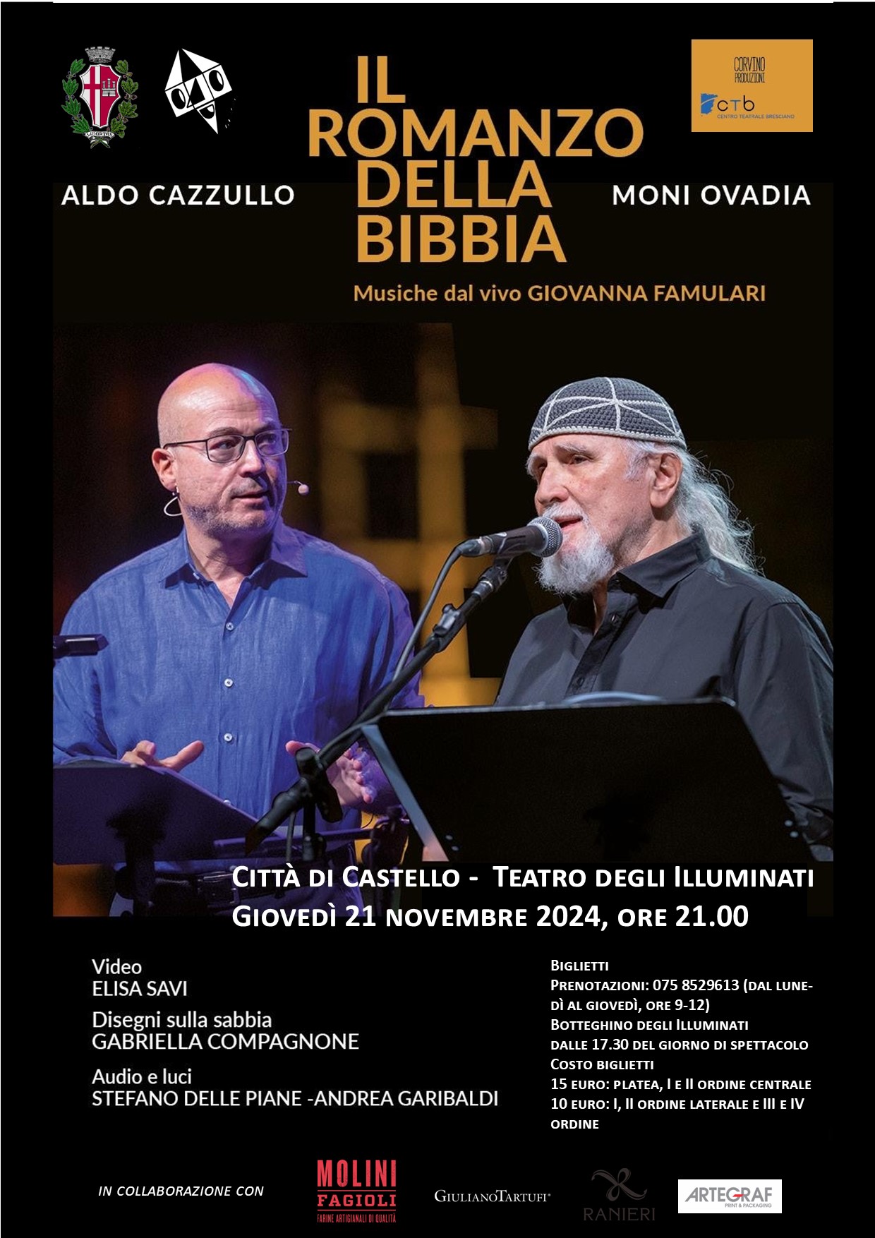 Aldo Cazzullo e Moni Ovadia tornano a Città di Castello con lo spettacolo, “Il romanzo della bibbia”, unica tappa umbra del 2024 in programma Giovedi 21 Novembre alle ore 21 al Teatro degli Illuminati. Progetto artistico-culturale promosso dal comune di Città di Castello e Cooperativa “Il Poliedro”, in collaborazione con sponsor che ne hanno consentito la realizzazione. Si tratta di una storia narrata a due voci quella del giornalista-scrittore e autore televisivo di programmi di successo, Aldo Cazzullo che racconta e l’attore, regista e musicista, Moni Ovadia che lo accompagna con letture, interventi e canti nel ruolo di Dio. Le musiche, dal sacro al contemporaneo, sono a cura di Giovanna Famulari, artista e musicista eclettica. Video, Elisa Salvi, disegni sulla sabbia di Gabriella Compagnone, audio e luci di Stefano delle Piane e Andrea Garibaldi: Corvino Produzioni e Centro Teatrale Bresciano. Il racconto toccherà alcuni degli episodi e dei personaggi più noti dell’Antico Testamento: dalla Creazione a Sodoma e Gomorra, da Adamo ed Eva all’Arca di Noè, da Abramo fino alla profezia di Isaia che preannuncia e lascia intravedere l’arrivo del Messia. C’è una cosa che rimane sempre uguale: la trama. Il sugo di tutta la storia. Il romanzo della Bibbia. La grande vicenda degli uomini vissuti sotto lo sguardo di Dio, da Adamo fino ai nostri padri, le origini della nostra cultura. Sullo sfondo le spettacolari testimonianze che queste storie hanno lasciato nelle arti visive, vere fonti di ispirazione nei secoli dei più grandi artisti. “Una iniziativa di grande valore culturale. Non è la prima volta che Aldo Cazzullo insieme ad altri artisti presenta nella nostra città, libri o eventi teatrali, sempre di straordinario interesse. Questo progetto teatrale di grande successo in tutta Italia sarà senza dubbio apprezzato anche dal pubblico tifernate e non solo”, hanno dichiarato il sindaco, l’assessore alla Cultura e la Presidente di “Poliedro”, Alessandra Garavani, nel ringraziare gli sponsor che hanno consentito la realizzazione del progetto culturale e teatrale. Il 24 settembre è uscito "IL DIO DEI NOSTRI PADRI. Il Grande Romanzo della Bibbia", nuovo libro di Aldo Cazzullo - ed. HarperCollins - da cui è tratto lo spettacolo teatrale "IL ROMANZO DELLA BIBBIA". Apertura botteghino Giovedi 21 Novembre alle ore 19,30: info e prenotazioni, dal lunedi al giovedi dalle ore 9 alle ore 12,( entro mercoledi 20 novembre), tel. 075- 8529613. Costo biglietti: Posti, platea/palco I,II, III ordine 15 euro. Posti palco I, II, III ordine laterale quart’ordine 10 euro.