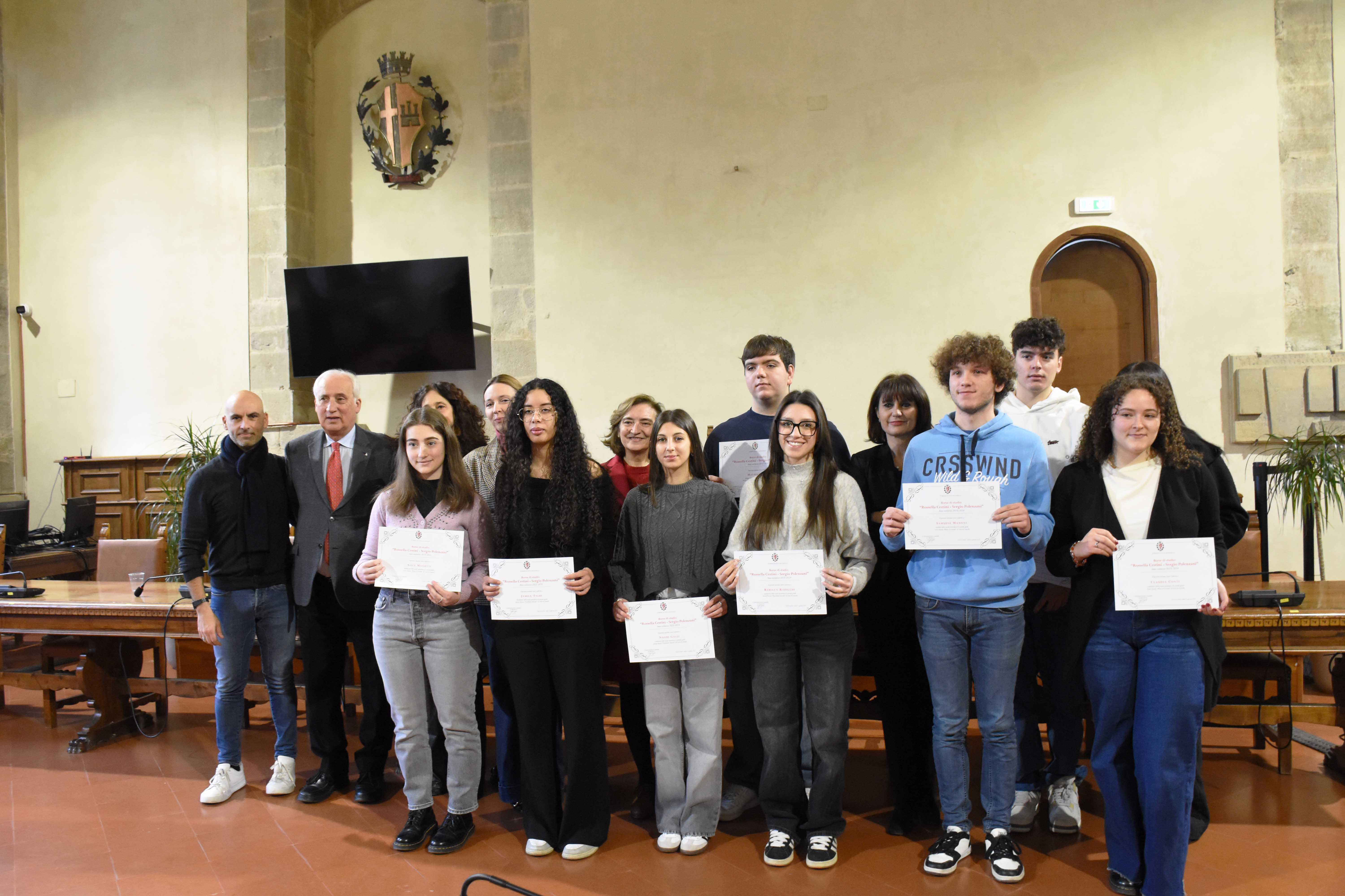 Merito ed esempio. Sono state le parole d’ordine della cerimonia di consegna delle 10 borse di studio da 1.000 euro ciascuna intitolate a Rossella Cestini e Sergio Polenziani, con cui stamattina l’amministrazione comunale di Città di Castello ha premiato gli studenti tifernati più meritevoli tra i diplomati che nell’anno scolastico 2023-2024 hanno concluso il proprio percorso di studi negli istituti superiori pubblici e paritari del territorio. I riconoscimenti sono stati a attribuiti a Jamila Talbi, Naomi Galli, Mattia Savini, Rebecca Radicchi e Gregorio Carlini del Polo Tecnico Franchetti-Salviani di Città di Castello; Lucrezia Pieracci, Claudia Conti, Samuele Manoni e Alice Massetti del Liceo Statale Plinio il Giovane di Città di Castello; Arianna Arcaleni del Campus Leonardo da Vinci di Umbertide. “Con le borse di studio Cestini-Polenzani l’amministrazione comunale vuole dire ai giovani che il merito conta nella nostra società e viene riconosciuto pubblicamente dalla massima istituzione della città, come contributo prezioso a costruire una comunità migliore, dove venga dato il giusto valore al talento e alle competenze curati con serietà e responsabilità”, hanno dichiarato stamattina il sindaco Luca Secondi e l’assessore ai Servizi Educativi Letizia Guerri, sottolineando il fatto significativo che sia stato scelto di attribuire i riconoscimenti “a coloro che hanno avuto la media dei voti migliore negli ultimi due anni di scuola, dimostrando con questo continuità e convinzione, oltre che bravura, nel loro impegno scolastico”. “Un impegno negli studi – hanno detto - che vogliamo portino ancora avanti e che per questo incentiviamo con il contributo economico che abbiamo voluto confermare pienamente anche quest’anno”. “Queste borse di studio ci permettono, però – hanno aggiunto Secondi e Guerri – anche di ricordare come meritano due figure come quella di Rossella Cestini e Sergio Polenzani per l’esempio che ancora oggi sono in grado di offrire ai giovani e alla nostra comunità: entrambi hanno fatto dello spirito di servizio, dell’impegno serio e appassionato per la scuola e per i giovani obiettivi di una vita vissuta pienamente e intensamente, pensando al bene della nostra città”. Con commozione palpabile gli amministratori tifernati, accompagnati dalla dirigente comunale di settore Giuliana Zerbato con Cristina Consigli e Camilla Manenti dell’Ufficio Scuola, si sono rivolti agli studenti presenti nella sala del consiglio comunale insieme ai propri genitori e ai dirigenti scolastici per invitarli ad approfondire la conoscenza dei due personaggi nel nome dei quali sarebbero stati premiati e a prendere spunto da ciò che hanno dimostrato. Ad aiutarli a cogliere gli aspetti salienti dell’esperienza di vita si cui sono stati protagonisti, sono stati in prima battuta i familiari di Rossella e Sergio. “Per mio padre l’impegno nella scuola, a sostegno della crescita dei giovani, è stata una missione, che ha anteposto ad altre opportunità che avrebbe potuto scegliere di avere”, ha detto la figlia Francesca Polenzani. “Pensate di fare dello studio, dell’impegno serio per costruire competenze e cultura il faro della vostra vita – ha aggiunto - è ciò in cui credeva mio padre e che ha insegnato ai suoi studenti”. A far quasi sentire in aula la vitalità di Cestini è stato il marito Claudio Tomassucci. “Mia moglie era una combattente, aveva uno spirito e una forza incrollabili quando c’era da battagliare per la scuola, per garantire opportunità migliori ai giovani, un po’ come si trova a fare oggi, con la stessa caparbietà, l’assessore Guerri”, ha affermato. “La passione con cui prendeva a cuore il suo impegno per la città, per i giovani, per le persone più fragili, sono un esempio che grazie a queste borse è ancora vivo”, ha puntualizzato Tomassucci, che insieme a Francesca Polenzani ha ringraziato l’amministrazione comunale per aver legato al nome dei propri congiunti una così importante iniziativa che premia il merito degli studenti. L’invito a conoscere ciò che hanno saputo fare Cestini e Polenzani, come “prezioso tesoro da portare con sé nella vita”, soprattutto per “i saldi principi che hanno animato sempre il loro agire”, sono stati rimarcati dalla dirigente scolastica del Liceo Statale Plinio il Giovane, Marta Boriosi, e dalla dirigente scolastica del Polo Tecnico Franchetti-Salviani e dell’Istituto di Istruzione Superiore Patrizi Baldelli Cavallotti, Valeria Vaccari, che hanno offerto un ricordo sentito e commosso dei due personaggi.
