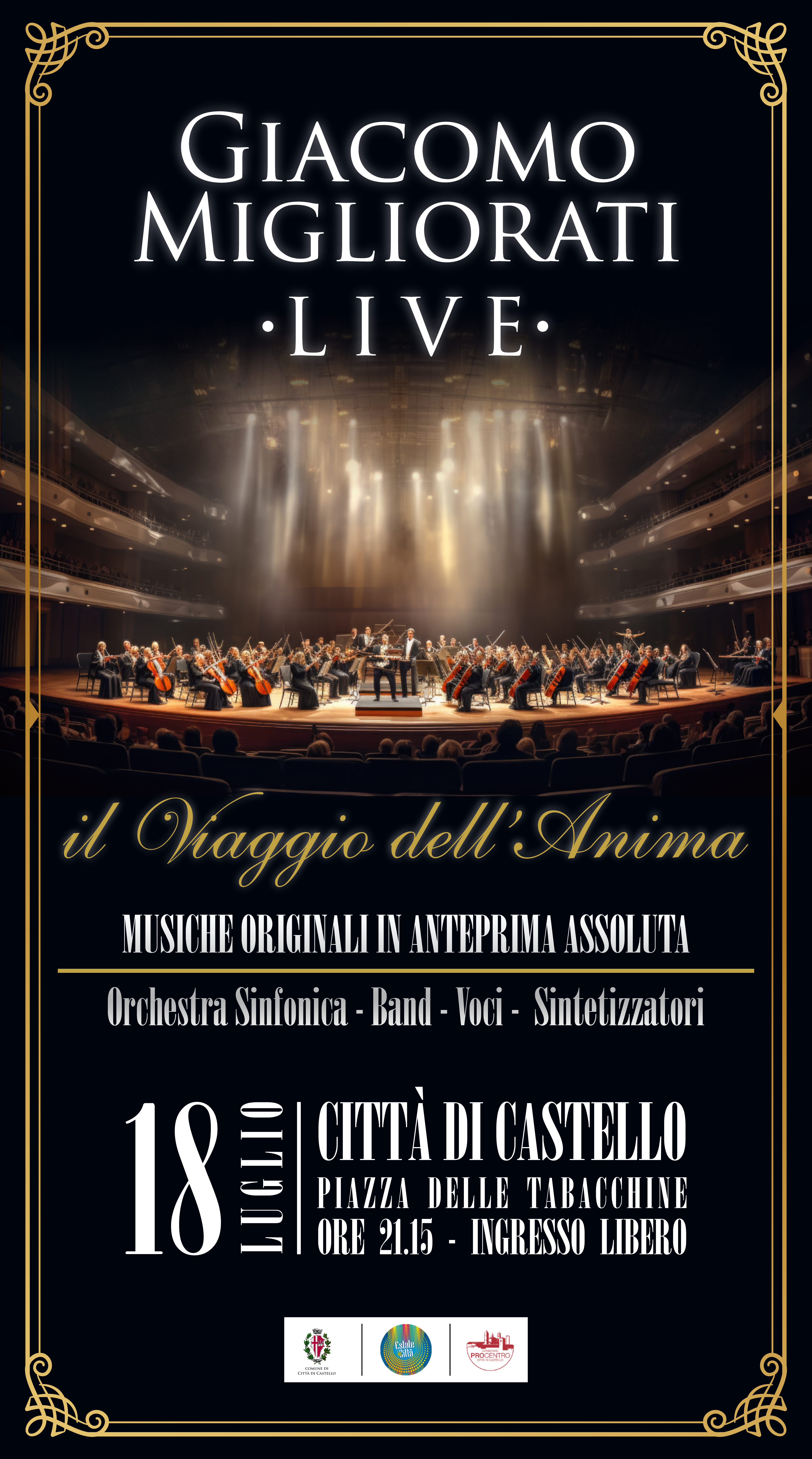 Città di Castello sarà la “tappa zero” di questo grande progetto, nato con impegno e condivisione, che verrà presentato in forma totalmente gratuita con l’intento di restituire alla comunità un’esperienza culturale autentica, ed unica nel suo genere. Sul palco, insieme al maestro Migliorati alla direzione ed alle tastiere, una formazione di alto livello, composta da alcuni fra i migliori ed affermati musicisti del territorio (ospite anche il maestro Fulvio Falleri) che si uniranno ad un’orchestra sinfonica di oltre 25 elementi. Scelte decisamente originali sono state fatte dal compositore anche dal lato vocale. Da menzionare le cantanti, Benedetta Sabatini (contralto) e Sara Peli (soprano) che condurranno la serata ed interpreteranno i brani con uno stile originale ed intenso, usando la voce unicamente come strumento, senza l’uso della parola. “Il concerto promette di essere un appuntamento ricco di emozione – hanno dichiarato il sindaco Luca Secondi e l’assessore al Turismo e Commercio, Letizia Guerri - frutto di passione, studio e collaborazione tra artisti e professionisti che hanno creduto nella visione dell’ambizioso progetto, a partire dal maestro Migliorati”. Organico previsto: Giacomo Migliorati, direzione, tastiere e sintetizzatori