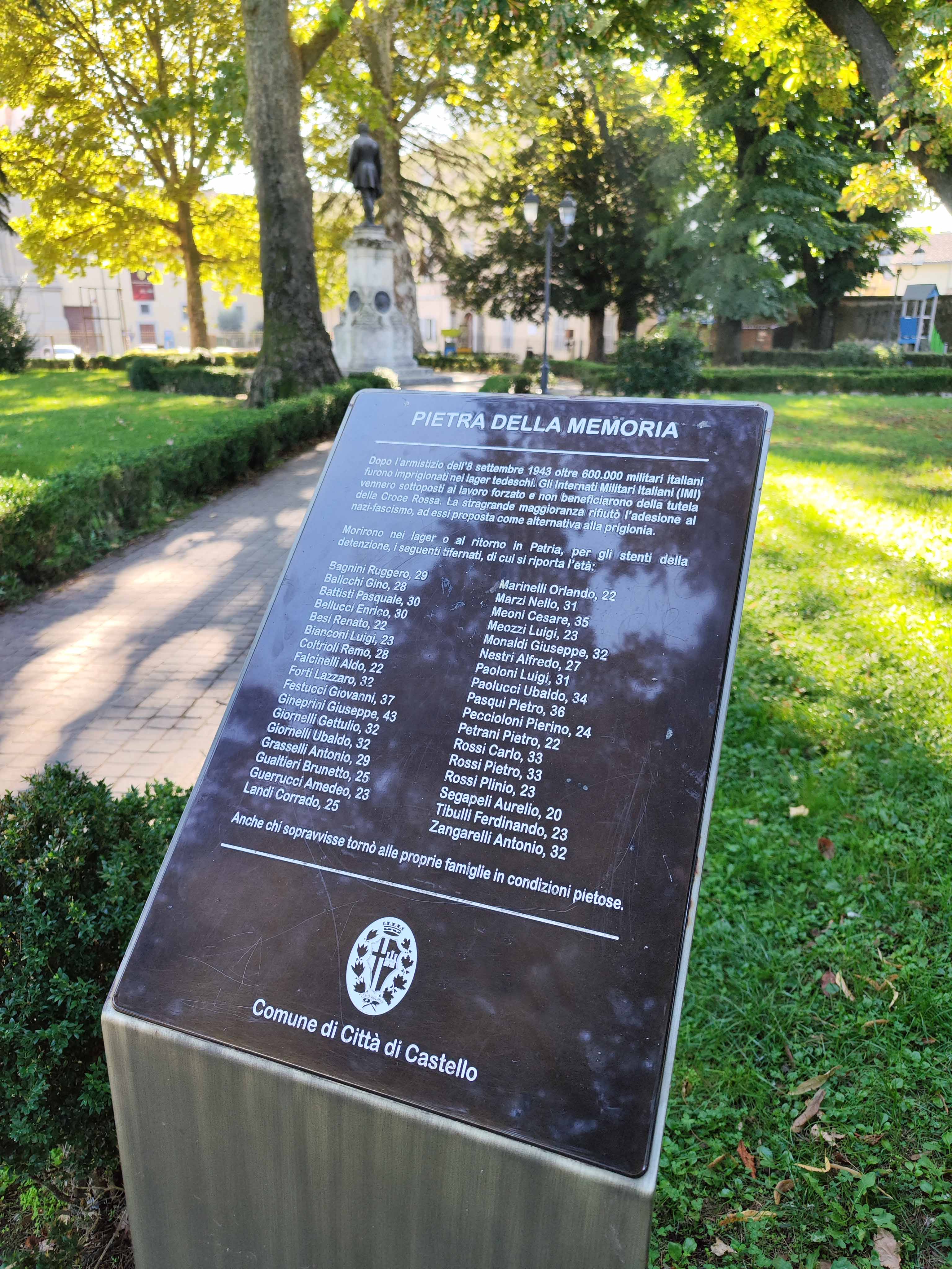 “Ricordare una delle vicende simbolo della Resistenza come quella dei militari italiani internati nei campi di concentramento dopo l’armistizio dell’8 settembre 1943 e dare dignità a questi uomini, attraverso una celebrazione pubblica che aiuta a conservare la memoria di quanti hanno pagato l’opposizione al nazifascismo con umiliazioni, sofferenze e anche con il sacrificio della vita, è un dovere civico fondamentale che è stato sottolineato meritoriamente con la legge che ha istituito la giornata del 20 settembre. Un dovere civico che vogliamo onorare oggi, pensando che sia importante ricordare e farlo insieme. Per questo rivolgiamo un sentito abbraccio alle famiglie dei 555 tifernati che furono protagonisti di questa drammatica pagina della nostra storia, tra i quali rammentiamo con particolare commozione i 34 concittadini che morirono nei lager o al ritorno in patria a causa delle conseguenze della detenzione, i cui nomi sono scolpiti nella pietra della memoria che si trova nei giardini del Cassero”. E’ il messaggio con cui il sindaco Luca Secondi e l’assessore alla Cultura Michela Botteghi sottolineano a nome dell’amministrazione comunale valore e significato della prima Giornata degli Internati italiani nei campi di concentramento tedeschi durante la seconda Guerra mondiale, che è stata istituita dalla legge n.6 del 13 gennaio 2025 e si celebra in tutta Italia oggi, sabato 20 settembre. “Scegliendo di rifiutare l’arruolamento nell’esercito tedesco o in quello di Salò dopo l’armistizio – osservano Secondi e Botteghi - i militari italiani che poi furono internati nei campi di prigionia e nei campi di lavoro coatto in Germania, privati dello status di prigionieri di guerra e quindi dei diritti garantiti dalla Convenzione di Ginevra del 1929 con la conseguente esclusione dai servizi assistenziali della Croce Rossa, offrirono un esempio fulgido di rispetto per l’onore della patria, di fede negli ideali di libertà, di democrazia e di pace, che per lungo tempo è rimasto nell’ombra e che invece fa parte a pieno titolo della lotta della Resistenza, che non fu solo armata”. Sindaco e assessore alla Cultura esprimono “riconoscenza e vicinanza a tutti coloro che a Città di Castello hanno aiutato a tenere accesa la luce della memoria su questa pagina di storia che ha lasciato una ferita indelebile anche nella comunità tifernate”, ricordando l’impegno dell’Istituto di Storia Politica e Sociale Venanzio Gabriotti, dell’ANPI, dell’Associazione Famiglie Caduti e Dispersi in Guerra, dell’associazione Mutilati ed Invalidi di Guerra, di Trestina Per la Pace, in prima linea per l’80° anniversario della Liberazione di Città di Castello celebrato nel 2024, e di tutte le altre associazioni combattentistiche e della memoria che offrono il loro prezioso contributo”. “Un movimento cittadino vivo e prezioso, che ha voglia di fare e partecipare, verso il quale ci sentiamo responsabilizzati e che continueremo ad affiancare al meglio delle nostre possibilità per custodire la memoria e farne dono alle nuove generazioni”, concludono Secondi e Botteghi. La pietra della memoria collocata ai giardini del Cassero nel 2021 per espressa volontà del consiglio comunale di Città di Castello ricorda il sacrificio di 34 Internati Militari Italiani (IMI) tifernati: Ruggero Bagnini; Gino Balicchi; Pasquale Battisti; Enrico Bellucci; Renato Besi; Luigi Bianconi; Remo Coltrioli; Aldo Falcinelli; Lazzaro Forti; Giovanni Festucci; Giuseppe Gineprini; Gettulio Giornelli; Ubaldo Giornelli; Antonio Grasselli; Brunetto Gualtieri; Amedeo Guerrucci; Corrado Landi; Orlando Marinelli; Nello Marzi; Cesare Meoni; Luigi Meozzi; Giuseppe Monaldi; Alfredo Nestri; Luigi Paoloni; Ubaldo Paolucci; Pietro Pasqui; Pierino Peccioloni; Pietro Petrani; Carlo Rossi; Pietro Rossi; Plinio Rossi; Aurelio Segapeli; Ferdinando Tibulli; Antonio Zangarelli.