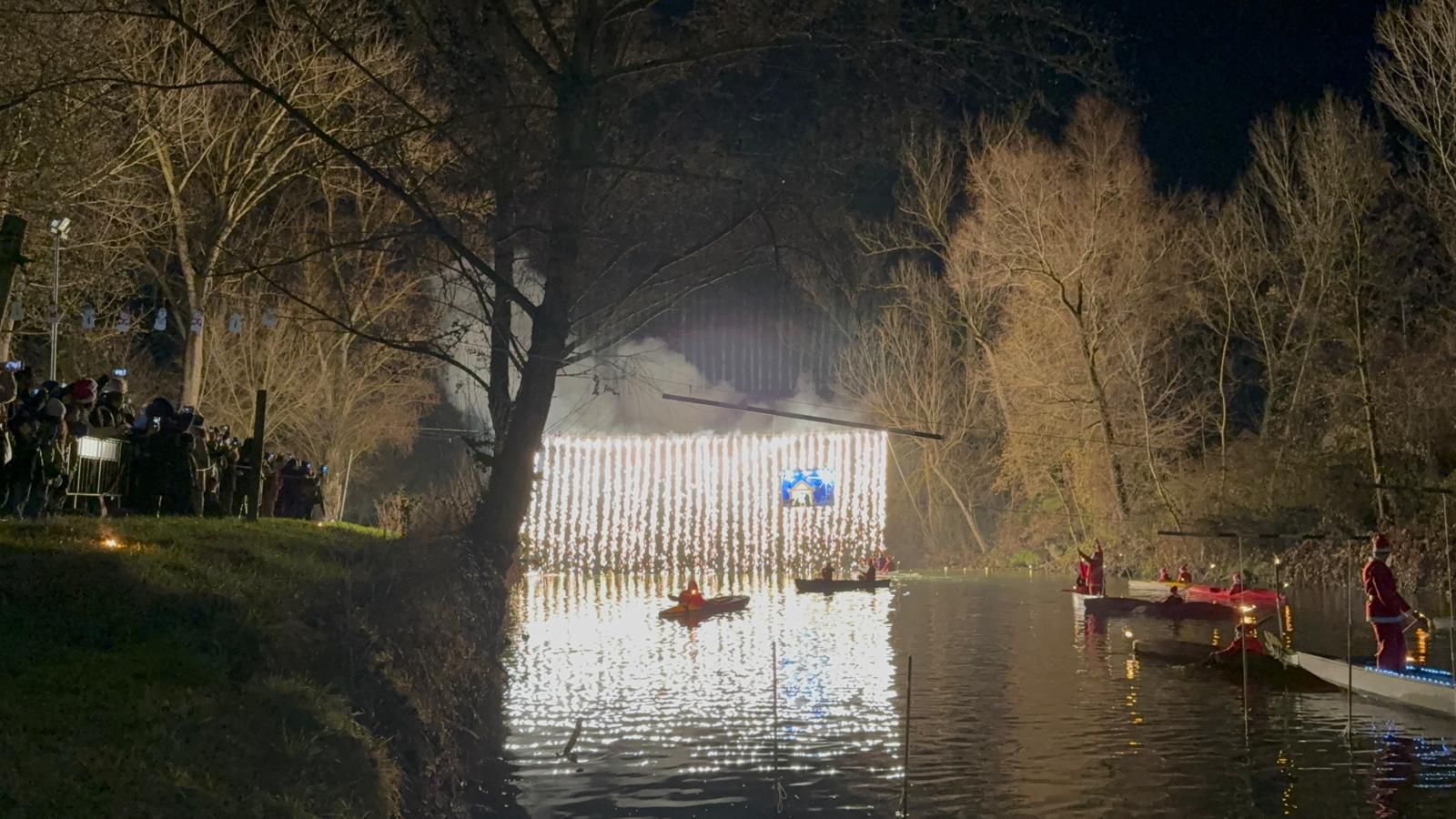 Le canoe al posto delle renne, una cascata di luci, musica e tanta allegria. Quello che è andato in scena questo pomeriggio a Città di Castello è stato un Natale a dir poco originale, unico nel suo genere che da 45 anni si ripete con successo. Un vero esercito di Babbo Natale, circa 30, è sceso a colpi di pagaia fra le sponde del fiume Tevere. Ad attenderlo una cornice di pubblico straordinaria, come non si era mai vista, in prevalenza famiglie con bambini al seguito, turisti, che hanno promosso a pieni voti un evento che ormai appartiene alla storia delle festività in Italia. Spettacolo “mozzafiato” per festeggiare il Natale in maniera davvero originale. Trenta “Santa Claus” vestiti di tutto punto con barba bianca cappello e divisa rossa d’ordinanza hanno solcato nel pomeriggio le acque del fiume Tevere all’altezza del Ponte che attraversa la città in prossimità della sede del pluridecorato Canoa Club Città di Castello (dei campioni del mondo Mirko Spelli e Carlo Mercati) che da 45 anni organizza questa manifestazione. Appena è calata l’oscurità i canoisti, travestiti da Babbo Natale hanno iniziato a percorrere le acque del fiume, per circa 800 metri a bordo delle loro canoe, avvolti da una cornice scenografica straordinaria, con il presepe pensile illuminato, lo spettacolo dei fuochi d’artificio (Armeria Bruschetti in collaborazione con Piros fuochi artificiali, fuochino, Fabio Costa) concluso con la suggestiva cascata di luci sull’acqua e la musica dei “Paguro Bernardo” a rendere ancora memorabile il pomeriggio di Natale secondo tradizione. In tanti si sono goduti lo spettacolo da sopra il ponte del Tevere, altri, famiglie con bambini e turisti lungo le sponde. È stato un vero e proprio bagno di folla. E poi fuochi in prossimità delle sponde per riscaldare i numerosi turisti e visitatori che hanno deciso di prendere parte a questa manifestazione dopo il tradizionale pranzo di Natale. L'evento di Natale rappresenta il modo migliore scelto dagli organizzatori del Canoa Club, affiancati dal comune di Città di Castello, per porgere gli auguri per le festività ai propri soci, ai cittadini e numerosi turisti presenti città. Una straordinaria occasione per trascorrere alcune ore del pomeriggio di Natale immersi in una atmosfera magica a contatto con la natura sulle sponde del fiume Tevere a poca distanza dalle bellezze storico-artistiche della Pinacoteca Comunale, culla del Rinascimento, degli Ex Seccatoi, Musei Burri con le opere di uno dei più grandi maestri contemporanei e della Mostra Internazionale di Arte Presepiale (fino al 6 gennaio 2026) che nella cripta del Duomo propone una vetrina esclusiva di circa 170 opere provenienti da tutta Italia e dal mondo. “Con orgoglio e rinnovato slancio abbiamo vissuto un altro bellissimo Natale secondo tradizione, con qualche novità per rendere un evento ereditato dai fondatori e dirigenti del nostro glorioso club, divenuto negli anni un appuntamento irrinunciabile e unico a livello nazionale”, ha dichiarato Nicola Landi, presidente del Canoa Club Città di Castello, nel ringraziare tutti coloro che lo hanno reso possibile a partire dagli atleti, dirigenti e soci del canoa club e l’amministrazione comunale, che ha voluto inserire questa nostra manifestazione negli eventi natalizi. “Il Natale in canoa è una meraviglia che appartiene all’Italia – hanno detto il sindaco, Luca Secondi e gli assessori, Riccardo Carletti, Letizia Guerri, Benedetta Calagreti e Michela Botteghi – che si ripropone dopo oltre 45 anni con lo spettacolo di luci e colori e torna a lanciare un messaggio di speranza al paese: una manifestazione unica nel suo genere divenuta negli anni uno dei simboli di questa giornata. Ne siamo orgogliosi”.