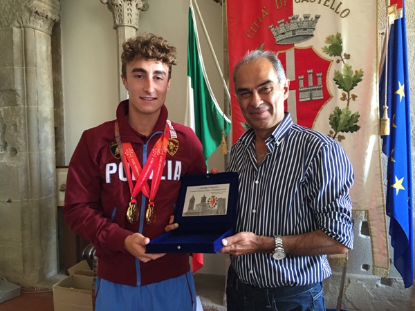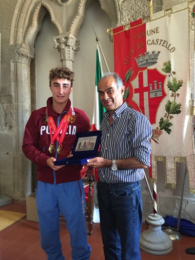 Anche il sindaco di Città di Castello Luciano Bacchetta si è complimentato con il giovane tifernate Andrea vescovi, campione del mondo juniores in carica, per la medaglia d’oro conquistata nella specialità double trap in occasione delle Universiadi dell’Umbria. Il double trap, doppia trappola, è un fucile da caccia sport di tiro con cui si deve centrare a distanza e rompere un disco di argilla. Nel consegnare una targa ricordo dell’importante successo sportivo, il sindaco ha parlato di Andrea Vescovi come “di un orgoglio per la città che lo visto crescere e di un esempio per tanti suoi coetanei. Inseguendo una passione, hai trovato anche una via per realizzarti e un senso da dare ai sacrifici e alle rinunce che le scelte implicanoo, concedendo in cambio la soddisfazione delle tante medaglie che puoi metterti collo” e con le quali Andrea, accompagnato dalla famiglia, si è fatto fotografare.(Allegate foto)