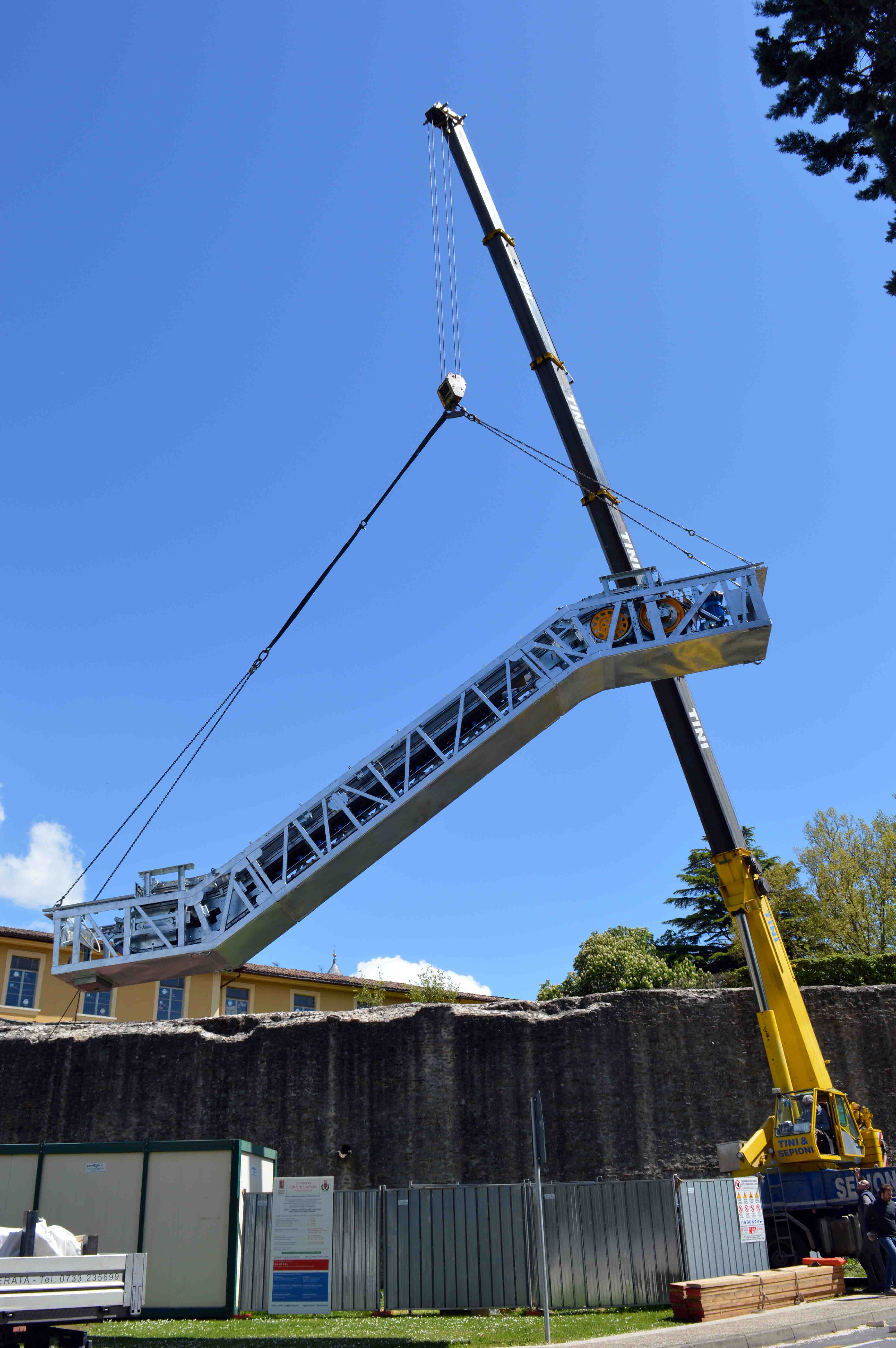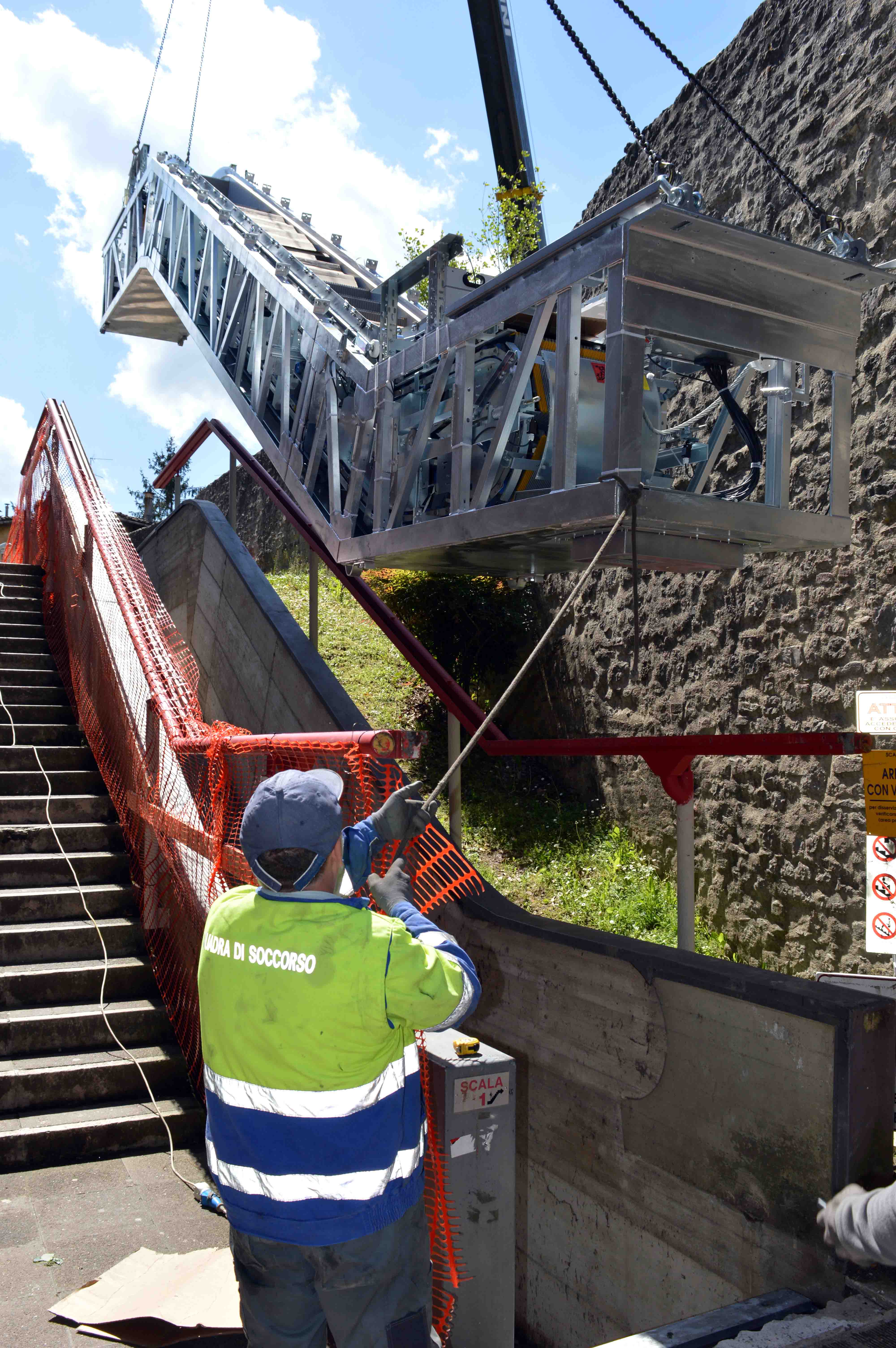 Con il posizionamento della seconda rampa, completato nel primo pomeriggio di ieri, è partito il conto alla rovescia per la riapertura delle scale mobili del Cassero, che avverrà una volta effettuato il collaudo finale da parte dell’Ufficio Speciale Trasporti a Impianti Fissi (USTIF), l’organo periferico del Ministero delle Infrastrutture e dei Trasporti deputato al rilascio del nullaosta all'entrata in servizio dei sistemi di trasporto realizzati ex novo o ammodernati. Perfezionate le spettacolari operazioni di insediamento delle rampe, che per due giorni hanno calamitato l’attenzione dei tifernati con le suggestive immagini dello scavalcamento del bastione del Cassero da parte delle strutture meccanizzate del peso di circa 80 tonnellate sollevate da una autogru, l’ITAL MS di Porto San Giorgio, azienda vincitrice dell’appalto per l’installazione del sistema, procederà sotto il monitoraggio dei tecnici del Comune al completamento del montaggio delle strutture e alla verifica del corretto funzionamento dei meccanismi. A ultimare l’intervento sarà l’installazione delle nuove coperture, che saranno dotate di una moderna illuminazione con luci a led, di telecamere a circuito chiuso per la sorveglianza dell’utilizzo del percorso meccanizzato e di un nuovo sistema audio, più moderno e potente. Terminate queste operazioni, l’impianto sarà pronto per il collaudo da parte dell’Ustif. Rispondenti in tutto alle normative in materia, le nuove scale mobili sono quanto di più moderno metta a disposizione la tecnologia per sistemi di questo genere, con alcune caratteristiche che segnano un miglioramento della funzionalità e della sicurezza dell’impianto. Realizzate in acciaio inox con gradini in lega di alluminio pressofuso, le rampe saranno in grado di trasportare 3.600 persone all’ora, con un sistema di assistenza alla salita e alla discesa che agevolerà gli utenti e renderà più sicuro l’accesso e la fuoriuscita alle scale mobili. Grazie alla erogazione costante di corrente elettrica, il sistema avrà anche un consumo energetico più contenuto che in passato e alla riduzione dei costi di esercizio concorreranno anche le luci a led, più economiche rispetto alle vecchie lampade. Le operazioni di completamento del montaggio delle scale mobili concluderanno il primo lotto, aggiudicato per 176 mila 912,87 euro più Iva, del progetto di riqualificazione dei percorsi pedonali del bastione del Cassero. Con il secondo lotto si procederà alla ristrutturazione della pavimentazione delle scale in muratura e dei pianerottoli del tratto servito dalle scale mobili e per la sistemazione del parcheggio per persone diversamente abili e della viabilità di Pomerio Rodolfo Siviero. Complessivamente l’investimento sostenuto dall’amministrazione comunale di Città di Castello, con il cofinanziamento al 50 per cento della Regione dell’Umbria, sarà di 400 mila euro. I lavori di allestimento delle scale mobili, attualmente rivestite con teli impermeabili per proteggerle dagli agenti atmosferici, comporteranno l’interdizione completa al passaggio dei pedoni lungo il percorso che collega piazzale Ferri con i guardini del Cassero, che è già stata disposta da stamattina, come avvenuto in precedenza in occasione dello smontaggio delle vecchie scale mobili. I percorsi alternativi, da e per piazza Gabriotti, prevedono il passaggio lungo via Antimo Marchesani e via Cacciatori del Tevere, dal lato di piazzale Ferri, e lungo Pomerio Rodolfo Siviero, dal lato del parcheggio Raniero Collesi a Porta Prato.