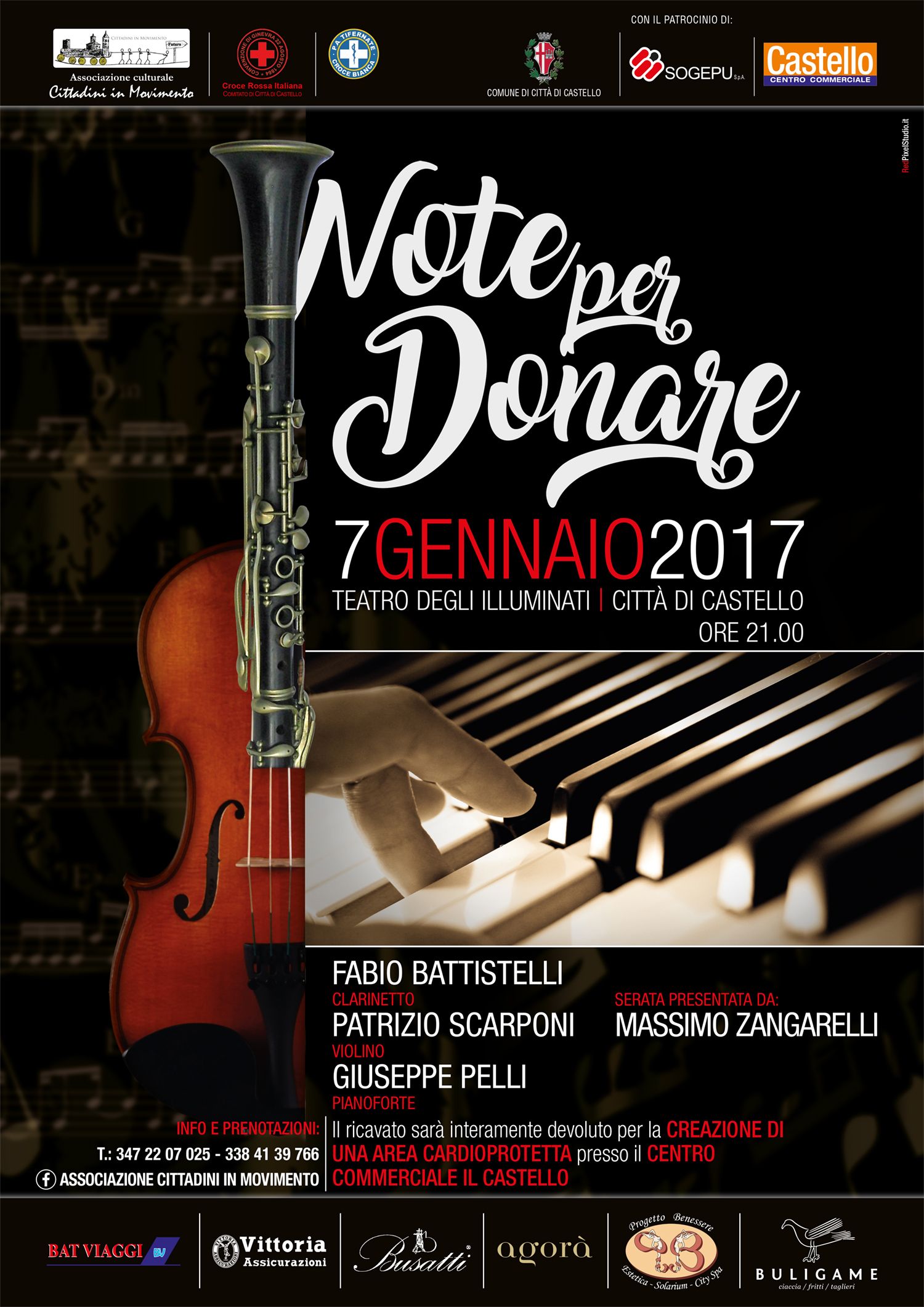 Creare zone cardioprotette dotate di un defibrillatore anche nei luoghi dello svago e dello shopping di Città di Castello, dove si concentrano tantissime persone. E’ l’obiettivo del terzo appuntamento con la prevenzione 2016/17 dell’associazione culturale “Cittadini in Movimento”, che punta a sensibilizzare la comunità locale con un gesto concreto: la donazione di un defibrillatore al Centro Commerciale “Castello”, che per estensione rappresenta il principale punto di aggregazione indoor del territorio comunale. L’acquisto del dispositivo salvavita, primo passo di un progetto che prevede anche la formazione del personale al lavoro nella struttura commerciale, sarà finanziato con i proventi del concerto dal titolo “Note per donare”, in programma sabato 7 gennaio, alle ore 21.00, al Teatro degli Illuminati. L’associazione “Cittadini in Movimento” organizzerà l’evento in collaborazione con il Comitato tifernate della Croce Rossa Italiana e la Pubblica Assistenza Tifernate-Croce Bianca, con il patrocinio del Comune, di Sogepu e del Centro Commerciale “Castello”. La serata, presentata dal giornalista Massimo Zangarelli, vedrà esibirsi tre musicisti di fama internazionale come il clarinettista tifernate Fabio Battistelli, il violinista Patrizio Scarponi e il pianista Giuseppe Pelli, che eseguiranno brani di Rossini, Verdi, Chopin, Beethoven, Kreisler, Massenet, Brahms e Paganini. Per informazioni e prenotazioni è possibile rivolgersi ai numeri di telefono 347.2207025 e 338.4139766 o contattare l’associazione “Cittadini in Movimento” attraverso Facebook.