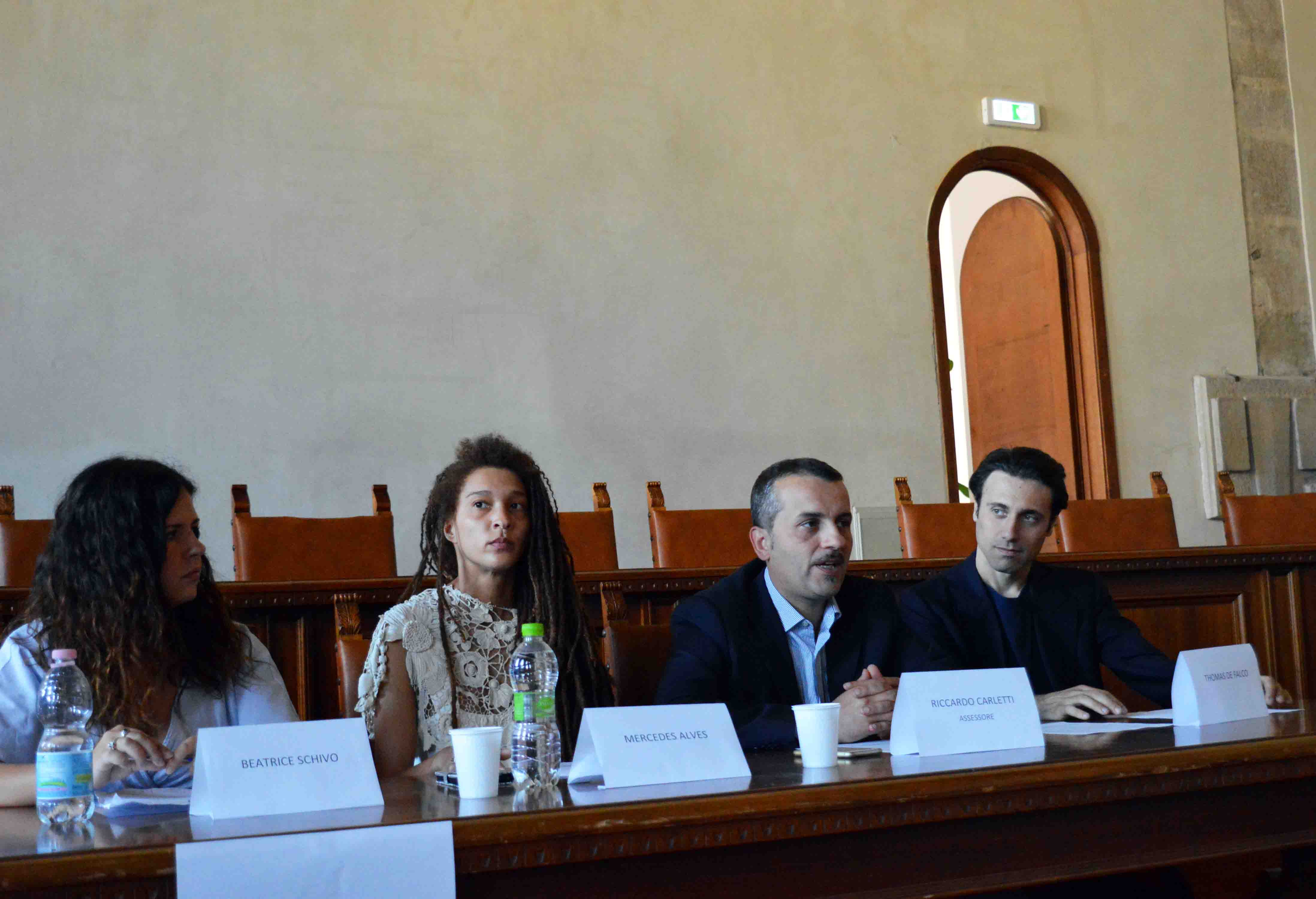 Nel dettaglio tra i due imponenti pilastri ottagonali che sostengono le volte dell’atrio, si troveranno due soggetti, un uomo e una donna. Alla donna, la performer Merceds Alves, presente in conferenza stampa, saranno collegati lunghi wrapping che dai capelli si prolungheranno verso l’alto dell’architettura, mentre dalle mani e dalle braccia del soggetto maschile si estenderà una grande radice di scultura tessile sulla pavimentazione dell’atrio. I due performer, inizialmente rigorosamente immobili e ad occhi chiusi, si muoveranno impercettibilmente nello spazio scultoreo, congiungersi tramite i wrapping all’antica architettura. Questa materia tessile, che dà corpo all’installazione, è protagonista fondamentale della performance e mezzo che l’artista usa per “dare vita e parola alla materia”. In questo lavoro De Falco affronta il tema dell’incomunicabilità, intesa nel suo significato più universale. La performance sarà accompagnata da Tiziana Fiorucci al sax, Alessio Pigolotti alla chitarra, Alessia Martinelli al vibrafono.