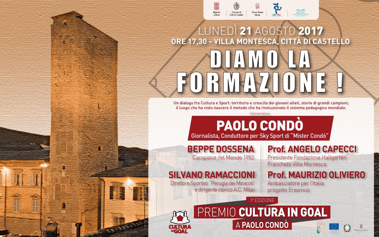 “Grazie a ‘Cultura in Goal’ Città di Castello sarà sede di un inedito e originale incontro tra cultura e sport, che avrà l’azzeccata caratteristica di mettere insieme un patrimonio di straordinario valore come quello del metodo Montessori e personaggi simbolo del mondo del calcio in un interessantissimo confronto con esperti della formazione accademica, che valorizzerà una volta di più Villa Montesca come contenitore ideale per eventi di alto profilo”. Il vice sindaco con delega alla Cultura Michele Bettarelli e l’assessore allo Sport Massimo Massetti presentano così l’appuntamento di lunedì 21 agosto a Villa Montesca, dove dalle ore 17:30 si terrà l’evento dal titolo “Diamo la Formazione!”, un dialogo fra cultura e sport che vedrà la partecipazione del giornalista di Sky Paolo Condò, ex prestigiosa firma della Gazzetta dello Sport, unico professionista italiano nella giura del Pallone d’Oro e recente vincitore del Premio Internazionale di Ischia per il giornalista sportivo dell’anno; di Silvano Ramaccioni, storico direttore sportivo del Perugia e team manager del Milan; di Beppe Dossena, campione del mondo nel 1982; del presidente della Fondazione Hallgarten Franchetti Villa Montesca Angelo Capecci e di Maurizio Oliviero, ambasciatore del progetto Erasmus per l’Italia. L’iniziativa, appuntamento clou del programma 2017 di “Cultura in Goal”, sarà promossa sotto la regia di Letizia Guerri di Group Tevere Servizi con il patrocinio dell’Associazione Italiana Calciatori, della Regione Umbria e del Comune di Città di Castello, e offrirà un terreno di incontro inesplorato al rapporto tra il mondo della cultura e dello sport, attraverso le storie di grandi campioni, del legame fra territorio e crescita dei giovani che saranno raccontate da Condò in un confronto di esperienze con Ramaccioni e Dossena, cui Capecci e Oliviero legheranno il tema della formazione, ripercorrendo, rispettivamente, le tappe della nascita del metodo Montessori e dell'esperienza universitaria legata ai progetti Erasmus. “Nell’anno del centenario della morte del barone Lepoldo Franchetti questa iniziativa ci permette di allargare in maniera davvero interessante i confini di una esperienza culturale unica come quella del metodo Montessori – osserva Bettarelli - affrontando il tema dell’educazione e della formazione dei giovani nella prospettiva dello sport e dei legami con il territorio, con la possibilità di trarre dalle prestigiose personalità che saranno ospiti a Città di Castello interessanti spunti per sviluppare nuove esperienze in questi contesti”. Nell’ambito dell’iniziativa verrà assegnato a Paolo Condò il “Premio Cultura in Goal”, che in collaborazione con l’Associazione Italiana Calciatori e il Comune di Città di Castello da quest’anno sarà sempre conferito nel capoluogo tifernate per sottolineare l’operato di chi, attraverso il proprio lavoro in ambito nazionale e internazionale, sa unire l’amore per il calcio e per la cultura. “Il patrocinio dell’Associazione Italiana Calciatori per questo premio – evidenzia Massetti - è motivo di grande gratificazione per la nostra città, che avrà l’opportunità di divenire punto di riferimento per i personaggi più importanti del mondo del calcio e per un modo di interpretare le vicende di questo sport lontano dagli stereotipi e più attento alle dimensioni culturali e sociali che gli sono connaturate per tradizione”.
