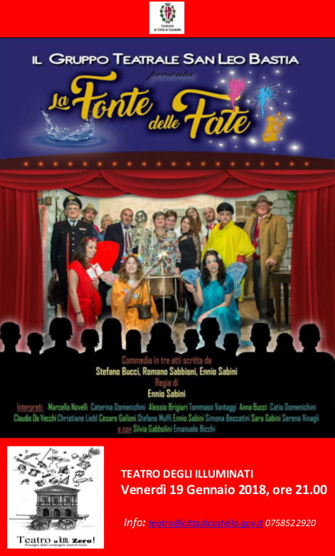 Con lo spettacolo del Gruppo Teatrale San Leo Bastia dal titolo “La fonte delle fate” si apre venerdì 19 gennaio la rassegna “Teatro a km zero”, promossa dall’amministrazione comunale in collaborazione con le compagnie tifernati. Alle ore 21.00 al Teatro degli Illuminati andrà in scena l’esilarante commedia in tre atti scritta da Romano Sabbioni, Stefano Bucci e da Ennio Sabini, che è anche regista della rappresentazione. Sul palco saliranno Marcello Novelli, Caterina Domenichini, Alessio Brigiari, Tommaso Vantaggi, Anna Bucci, Catia Domenichini, Claudio De Vecchi, Cristiane Liebl, Cesare Galloni, Stefano Muffi, Ennio Sabini, Simona Beccatini, Sara Sabini, Serena Vinagli, Silvia Gabbolini ed Emanuele Bicchi. Per informazioni è possibile contattare il Servizio Cultura al numero 075.8522920 o all’indirizzo di posta elettronica teatro@cittadicastello.gov.it. Il botteghino del Teatro degli Illuminati sarà aperto per la vendita dei biglietti, al costo unitario di 5 euro, dalle ore 19.00 di venerdì 19 gennaio.