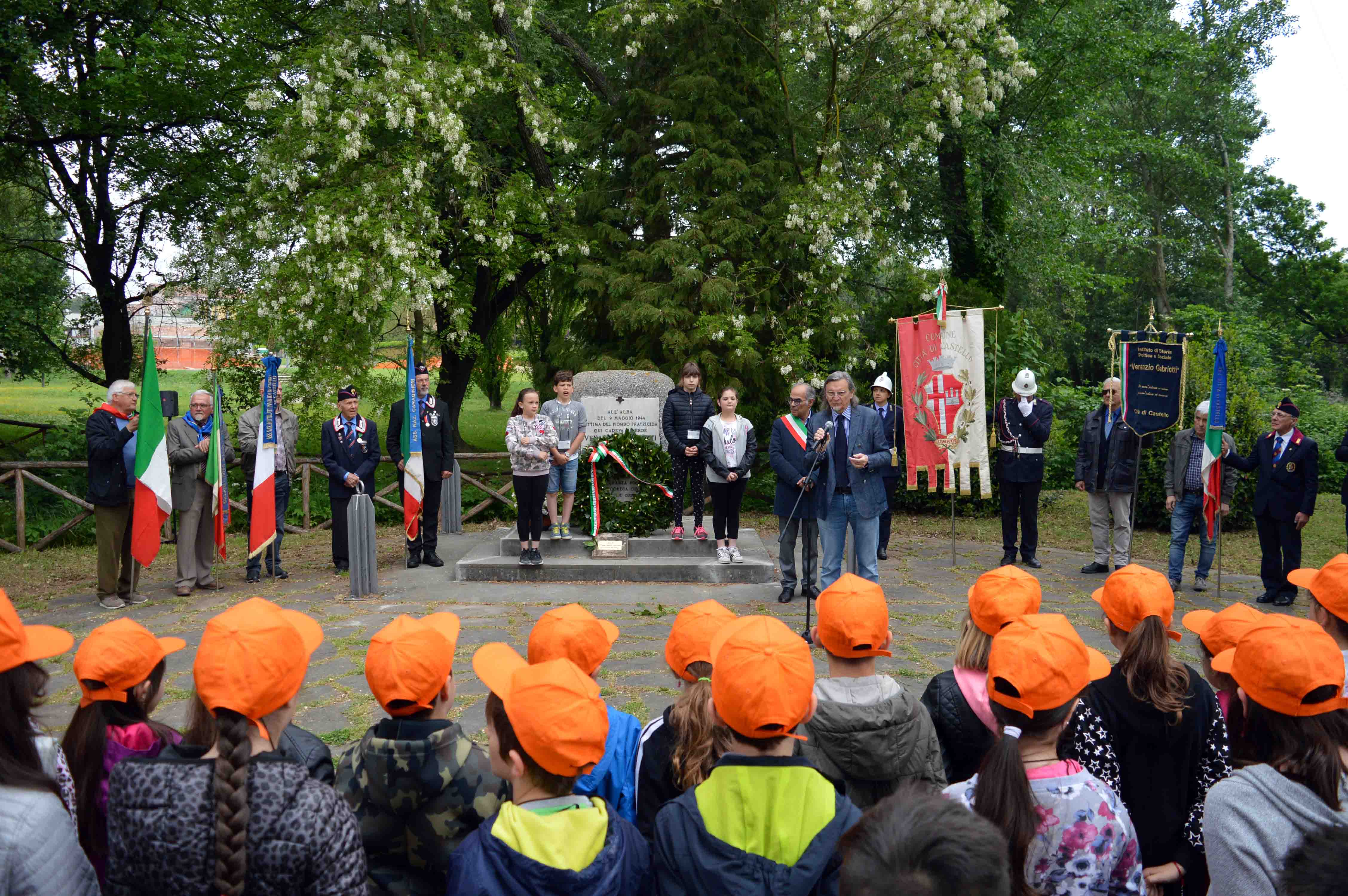 Autorità, scuole e cittadini alle celebrazioni organizzate a Città di Castello per il 74°anniversario della fucilazione di Venanzio Gabriotti, ucciso da un plotone di fascisti all’alba del 9 maggio 1944 sul greto della Scatorbia, dove ogni anni si tiene la commemorazione e da dove oggi il sindaco tifernate Luciano Bacchetta ha voluto ringraziare l’anonimo benefattore che ha restaurato a sue spese il cippo in memoria dell’eroe: “E’ un gesto che ci aiuta a trasmettere ai giovani e anche ai bambini quanto siano importanti i principi per i quali Gabriotti è morto ed altri hanno combattuto. Oggi più che mai è indispensabile far comprendere che quei valori non sono né caduti in disuso né scontati, affinché anche loro capiscano che questo paese si fonda sui principi per cui tante generazioni si sono spese. Oggi più che mai dobbiamo non indulgere nella retorica perché gli ideali di libertà, uguaglianza, tolleranza, non siano banalizzati. Ad esempio la festa della Liberazione è la Festa della Liberazione non della libertà generica. La Resistenza, nella quale ci sono stati anche episodi negativi, fu portatrice dei principi su cui si fonda la nostra repubblica”. L’iniziativa ufficiale è stata aperta dalla messa officiata da don Giuseppe Tanzi, presso il Cimitero monumentale, a cui hanno partecipato l’assessore regionale Fernanda Cecchini, il vicesindaco Michele Bettarelli, il presidente del consiglio comunale Vincenzo Tofanelli, i consiglieri comunali Vincenzo Bucci, Vittorio Massetti, gli assessori, Massimo Massetti e Rossella Cestini, il presidente dell’Istituto di storia politica e sociale Venanzio Gabriotti, Alvaro Tacchini, che ha organizzato la manifestazione con il Comune e Anpi, rappresentata dalla presidente Anna Maria Pacciarini, le forze dell’ordine e le associazioni combattentistiche. A seguire il corteo si è trasferito presso il greto di Scatorbia dove il coro degli alunni delle scuole del Secondo Circolo La Tina accompagnati dalla dirigente e dalle maestre hanno eseguito canti in tema. Domani alle 9.30 nel consiglio comunale le celebrazioni proseguiranno con la premiazione del concorso indetto per le scuole dall’Istituto di Storia Politica e Sociale “Venanzio Gabriotti” sul tema “La nascita delle nuove tecnologie ha trasformato profondamente i modi della comunicazione. Ripercorrete gli ultimi decenni dell'epoca attuale, mettendo in evidenza come nel nostro territorio sono cambiati i mezzi e i modi usati per comunicare notizie, pensieri ed emozioni”. I canti saranno eseguiti dai cori dei bambini del Primo Circolo “San Filippo”. Sabato 12 maggio alle 10.30 presso l’Officina della Lana del Centro di formazione “G.O. Bufalini” le manifestazioni si concluderanno con la presentazione del Quaderno dell’Istituto “Gli ultimi giorni di Venanzio Gabriotti” di Alvaro Tacchini. Interverrà il presidente di ISUC Mario Tosti, che patrocina le iniziative insieme alla Regione Umbria. Il libro di Tacchini porta a compimento una lunga ricerca sugli eventi tra il 2 e il 9 maggio 1944, con gli ultimi episodi dell'attività antifascista clandestina di Gabriotti, il suo arresto, la detenzione, il processo sommario e la fucilazione. L'acquisizione di documentazione finora inedita, prodotta nelle vicende processuali del dopoguerra, e di ulteriori testimonianze e documenti d'archivio ha permesso di ricostruire i fatti con grande dettaglio e di definire con maggiore chiarezza il ruolo svolto dai vari protagonisti e le responsabilità di chi provocò la morte di Gabriotti.