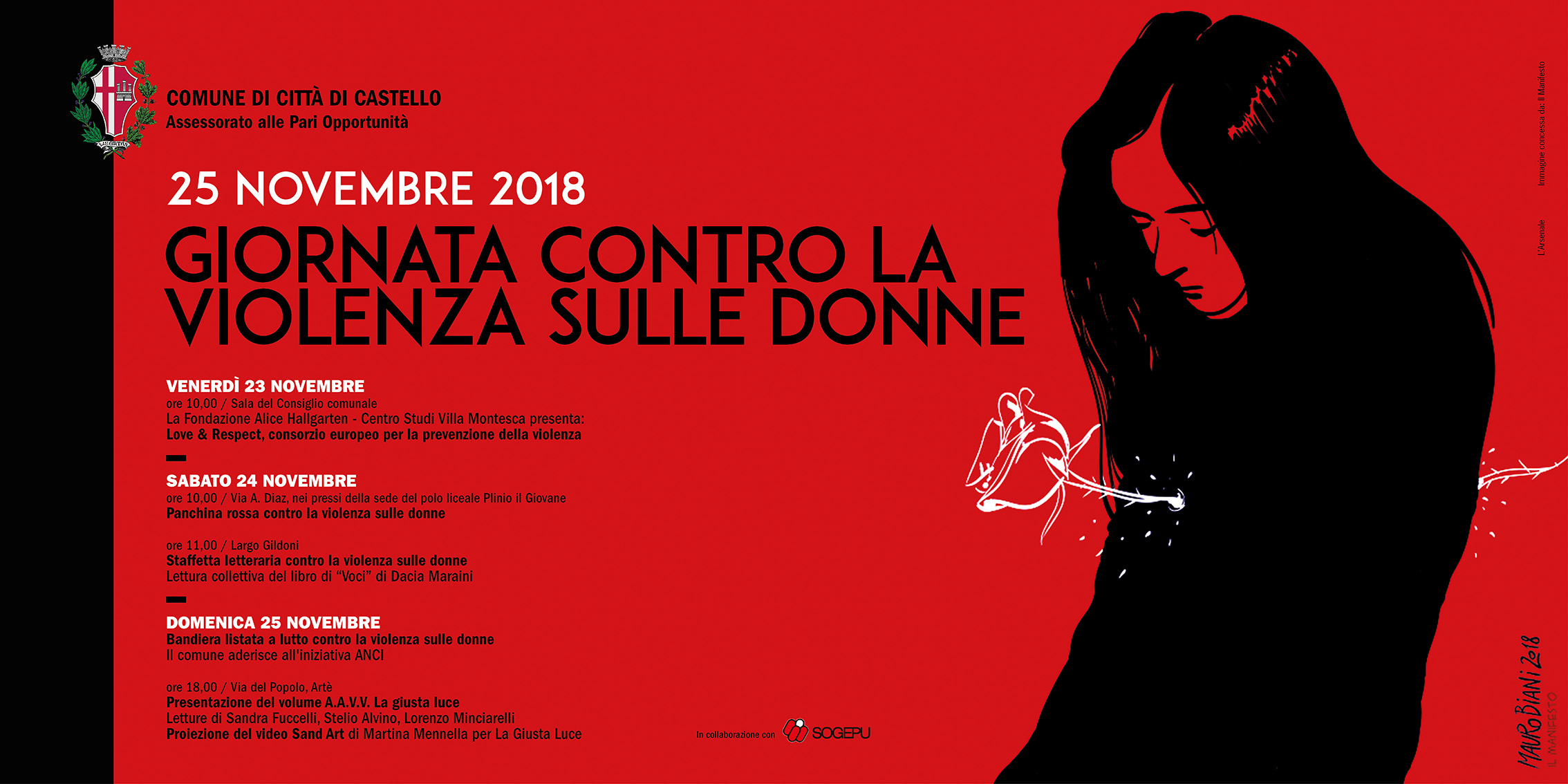 E’ stata scelta l’immagine con cui l’artista e vignettista Mauro Biani ha reso omaggio a Desirée Mariottini, la ragazza al centro di un tragico e crudele omicidio, sulle colonne del quotidiano Il Manifesto: la Giornata contro la violenza sulle donne a Città di Castello avrà questa icona e sarà esposta accanto ad un luogo simbolico della cultura e della civiltà cittadina come Palazzo Vitelli a Sant’Egidio, a memoria di tutte le vittime di femminicidio ed in generale di violenza di genere. La ricorrenza sarà scandita e preceduta da molti eventi che sono stati illustrati dall’assessore alle Pari Opportunità Luciana Bassini e dall’assessore alle Politiche educative Rossella Cestini a partire dal progetto europeo della Fondazione Hallgarten Franchetti - Centro studi Villa Montesca “Love and Respect”, descritto dal presidente dell’organismo Angelo Capecci, come “un dispositivo tra reale e virtuale che vuole sensibilizzare i giovani contro il fenomeno della violenza di genere e mettere in rete le varie esperienze grazie ai social network”. Il progetto sarà presentato nella Sala del Consiglio comunale venerdì 23 novembre alle ore 10,00. Sabato 24 alle 10,00 i ragazzi del polo liceale Plinio il giovane dipingeranno di rosso la panchina lungo via A.Diaz prima dell’ingresso alla scuola, “un altro simbolo per puntare i riflettori su un fenomeno che solo la prevenzione può debellare dalle nostre società, cambiando la cultura delle relazioni tra uomini e donne” ha aggiunto la Bassini per la quale “i simboli sono molto importanti ma è arrivato il momento di un soggetto che lavori quotidianamente su questi temi ed è l’obiettivo che di diamo nell’andare verso il 25 Novembre. Faccio un appello a tutte le componenti della società, stakeholder, categorie, professionisti, singolo cittadini, artisti, scuole, medici, istituzioni … perché partecipino alla staffetta letteraria contro la violenza sulle donne che si terrà sabato 24 novembre 2018 alle 11.00 a Largo Gildoni. Una lettura pubblica del libro “Voci” di Dacia Maraini, scelto dai docenti e dai ragazzi del polo tecnico Franchetti-Salviati come esempio di scrittura che promuove una cultura di rispetto verso la donna. Spesso si lamentano i pochi margini che gli uomini hanno di partecipare ad iniziative contro la violenza di genere, una sorta di esclusione. La formula della staffetta, oltre ad essere aperta a tutti perché si tratta di leggere qualche paragrafo, permette di coinvolgere anche gli uomini e noi speriamo che siano tanti ad aderire perché anche questo sarebbe un simbolo che le cose stanno cambiando”. Domenica 25 Novembre , giornata della ricorrenza, il Comune di Città di Castello ha aderito all’iniziativa nazionale Anci per listare a lutto la bandiera e nel pomeriggio ad Artè, in via del Popolo, alle 18.00, verrà presentato il libro collettivo “La Giusta luce” dell’associazione Scrivi per bene, i cui proventi sono destinati ad una casa di accoglienza per donne in difficoltà. “Giovani e scuole sono in prima linea perché il lavoro più proficuo sarà quello che riusciamo a compiere sulle nuove generazioni” sottolinea l’assessore Cestini “anche in questo caso l’attenzione e la disponibilità delle scuole è stata alta, confermando un patto educativo che dovremmo rendere sempre più condiviso con le famiglie”.