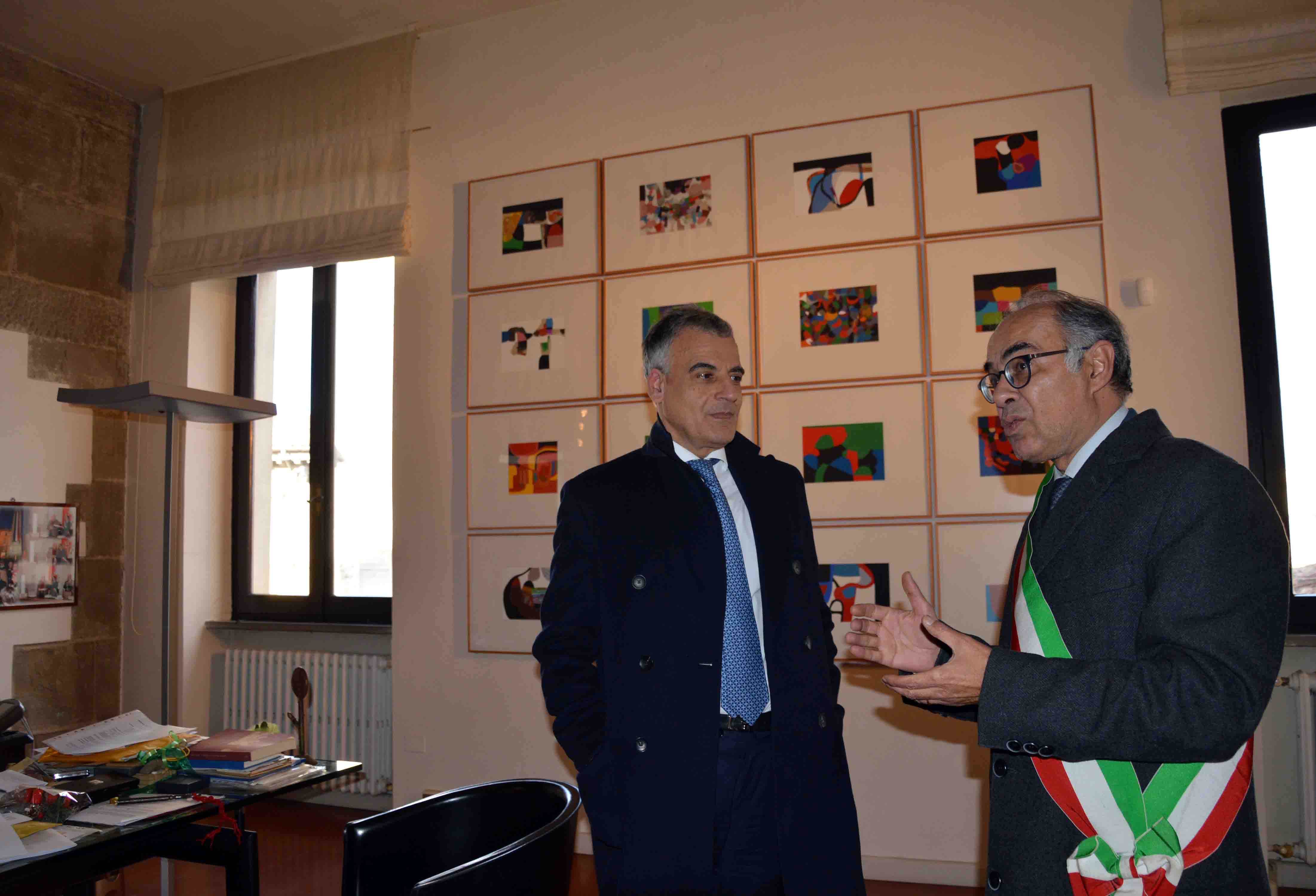 Questa mattina il Prefetto di Perugia, Claudio Sgaraglia, è stato ricevuto dal sindaco, Luciano Bacchetta, nella residenza municipale per una visita di cortesia. Nel corso dell’incontro che si è svolto presso la sala, “Peppino Impastato”, alla presenza dei membri della giunta, dei rappresentanti delle forze dell’ordine, del Comandante del Corpo di Polizia Municipale, il sindaco, nel ringraziare il Prefetto per la gradita e significativa visita, a nome di tutta la comunità locale, ha sottolineato “la fattiva e importante collaborazione che si è instaurata fin dal suo insediamento nel mese di luglio dello scorso anno”. “Ho avuto modo, come sindaco e presidente della Provincia di Perugia di apprezzarne le qualità umane e professionali e attraverso le forze dell’ordine l’agire quotidiano sotto il suo alto coordinamento”. “La collaborazione con lo Stato, rappresentato oggi dal Signor Prefetto è un atto giusto, doveroso e fondamentale. Per quello di nostra competenza – ha concluso Bacchetta - siamo dunque a disposizione per garantire la sicurezza e il bene delle persone, il controllo del territorio e la corretta applicazione di leggi e norme dello Stato.” “Ringrazio io il sindaco per l’accoglienza e per questo incontro. Ho avuto modo di conoscerlo nella doppia veste di sindaco e presidente della Provincia per la questione relativa alla strada Apecchiese e fin da subito si è aperto con il sindaco oltre che un rapporto di collaborazione anche di grande cordialità e simpatia. Questo è uno fra i comuni più importanti della provincia, mi fa piacere essere qui e sentire che è tutto sotto controllo sul versante della sicurezza. Sono aperto ad ascoltare i problemi che ci sono nel territorio, di questa comunità e di tutte le comunità. Il compito del prefetto credo che sia proprio quello di cercare di capire, di farsi interprete delle problematiche e di poterle risolvere se possibile ovviamente attraverso la collaborazione di tutte le istituzioni. Con il sindaco e presidente della provincia, Luciano Bacchetta – ha concluso Sgaraglia - abbiamo già dato prova di poter risolvere i vari problemi.” Al termine dell’incontro, il sindaco Bacchetta ha consegnato al Prefetto di Perugia, Sgaraglia, un volume sulla storia della Pinacoteca Comunale, un prezioso manufatto della Tela Umbra ed una riproduzione della Madonna delle Grazie (affresco) realizzato dalla Bottega Artigiana Tifernate di Stefano Lazzari presente in sala. Subito dopo il Prefetto di Perugia accompagnato dal sindaco, si è recato nella vicina cripta della Cattedrale dove è in corso di svolgimento la 19esima edizione della Mostra Internazionale di Arte Presepiale di Città di Castello in programma fino a domenica 6 gennaio. Ad accoglierlo il presidente dell'Associazione Amici del presepio "Gualtiero Angelini" di Città di Castello, Lucio Ciarabelli, assieme ad altri rappresentanti dell’associazione e al parroco della cattedrale, don Alberto Gildoni. Il Prefetto di Perugia ha espresso parole di forte apprezzamento “per la vastità e qualità preziosa delle opere esposte soffermandosi vicino a quelle realizzate dai maestri della grande scuola napoletana e a quelli umbri in particolare delle zone di Cascia e Valnerina colpiti dal terremoto.”