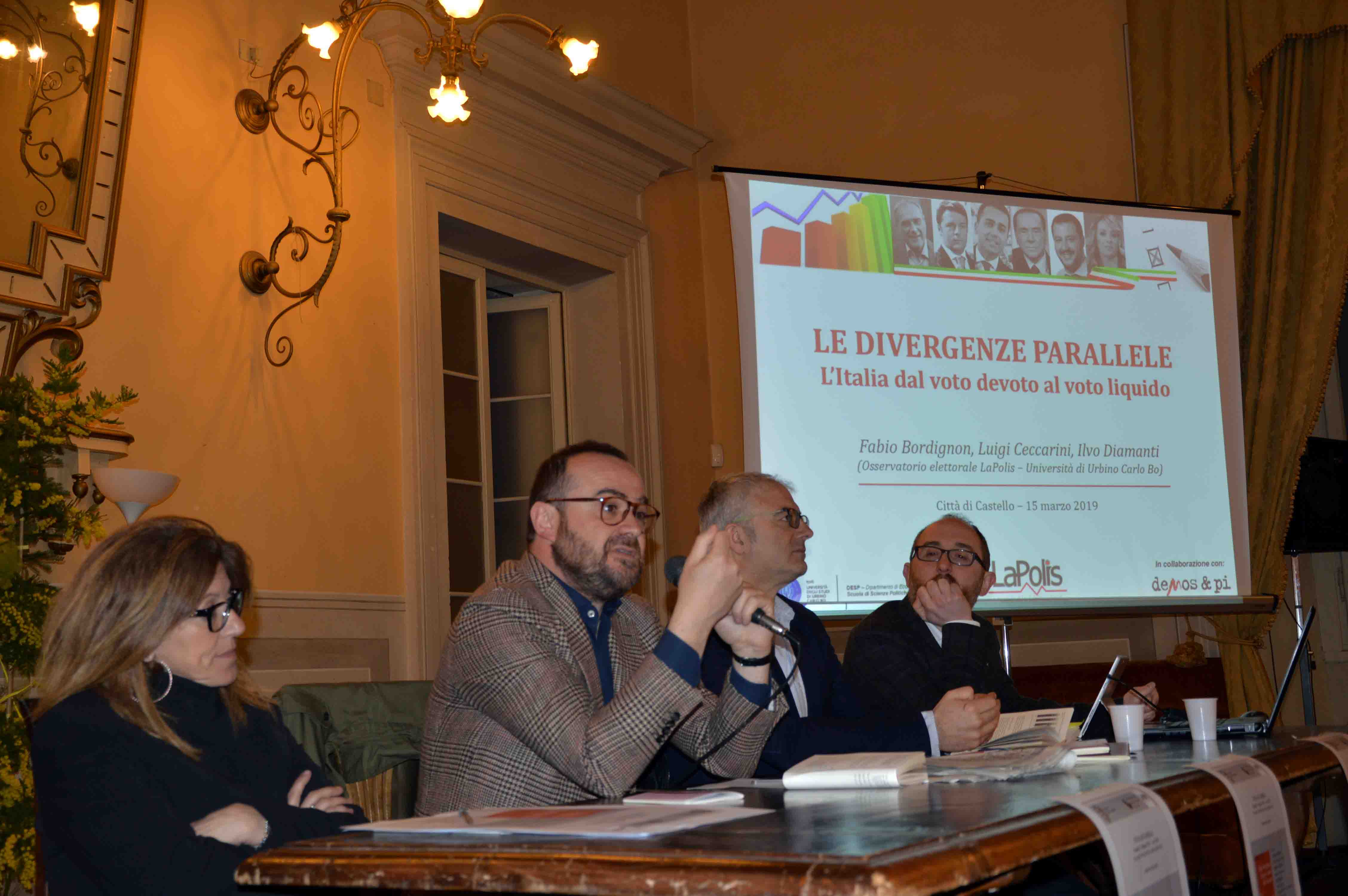 A poche settimane dall’entrata in vigore della par condicio che accompagnerà il paese verso le consultazioni europee e le amministrative, l’Ordine dei Giornalisti dell’Umbria con la collaborazione e l’ospitalità dell’Amministrazione comunale di Città di Castello, ha presentato il libro, edito dalla Laterza, “Divergenze parallele” dei docenti universitari, ricercatori di La Polis e dell’osservatorio elettorale di Demos Pi, Fabio Bordignon, Luigi Ceccarini ed Ilvo Diamanti, la cui specificità è aver investigato con lo strumento del sondaggio e del questionario, le scelte degli italiani in occasione delle elezioni politiche dello scorso 4 marzo, per il rinnovo del Parlamento italiano. Insieme a loro, Marco Mazzoni, tifernate e docente di Sociologia dei processi culturali comunicativi dell’Università di Perugia che ha introdotto il concetto di climi di opinione, cioè di percezioni diffuse, che diventano orientamenti concreti e condizionano il comportamento dell’elettore in un frangente storico in cui non esistono più le appartenenze ed il voto è liquido. Bordignon e Ceccarelli a partire dalla mutazione antropologica e geografica che ha cancellato le colorazioni classe, bianche e rosse delle zone elettorale, hanno mostrato, sondaggi alla mano, come “le scelte siano fatte sempre più a ridosso della cabina elettorale e come a volte la decisione di fare la croce su questo o quel simbolo intervenga mentre si ha la scheda e la matita copiativa in mano”. Queste dinamiche, secondo i relatori, agiranno anche in occasione delle europee di maggio e delle molte consultazioni amministrative per il rinnovo dei comuni, previste nella prossima primavera. Più specificatamente dedicato al pubblico dei giornalisti, per i quali l’iniziativa era valevole nell’ambito dell’obbligo formativo, i relatori hanno approfondito lo strumento del sondaggio come modo per interrogare la pubblica opinione e sfatato alcuni luoghi comuni come ad esempio la prevalenza della rete su tv, che è invece ancora il mass media su cui gli italiani si informano di più o la divaricazione tra comportamento on line e off line. Per l’Amministrazione comunale è intervenuto in apertura dei lavori, il vicesindaco e assessore alla Cultura Michele Bettarelli, il quale ha ribadito “l’importanza di avere una stampa libera e qualificata in tempi di fake news e post verità in tutti gli ambiti dell’attività giornalistica. Anche a livello locale il presidio di corrispondenti che conoscono il territorio è fondamentale per un’informazione che non sia troppo ripiegata sulle fonti ma si muova con autonomia. Nel breve periodo e per sostenere un momento doloroso di trasformazione tecnologica che sta interessando tutti i mass media, come comune, abbiamo scelto di introdurre nel prossimo bilancio, un’esenzione del 50 per cento sulla Tari per le edicole con destinazione esclusiva, rivenditori dunque che lavorano su questo canale di informazione, ancora, a quanto dicono i dati, tra i più consultati e autorevoli, specialmente come veicoli di formazione delle scelte politico-elettorali”. (Allegata foto)