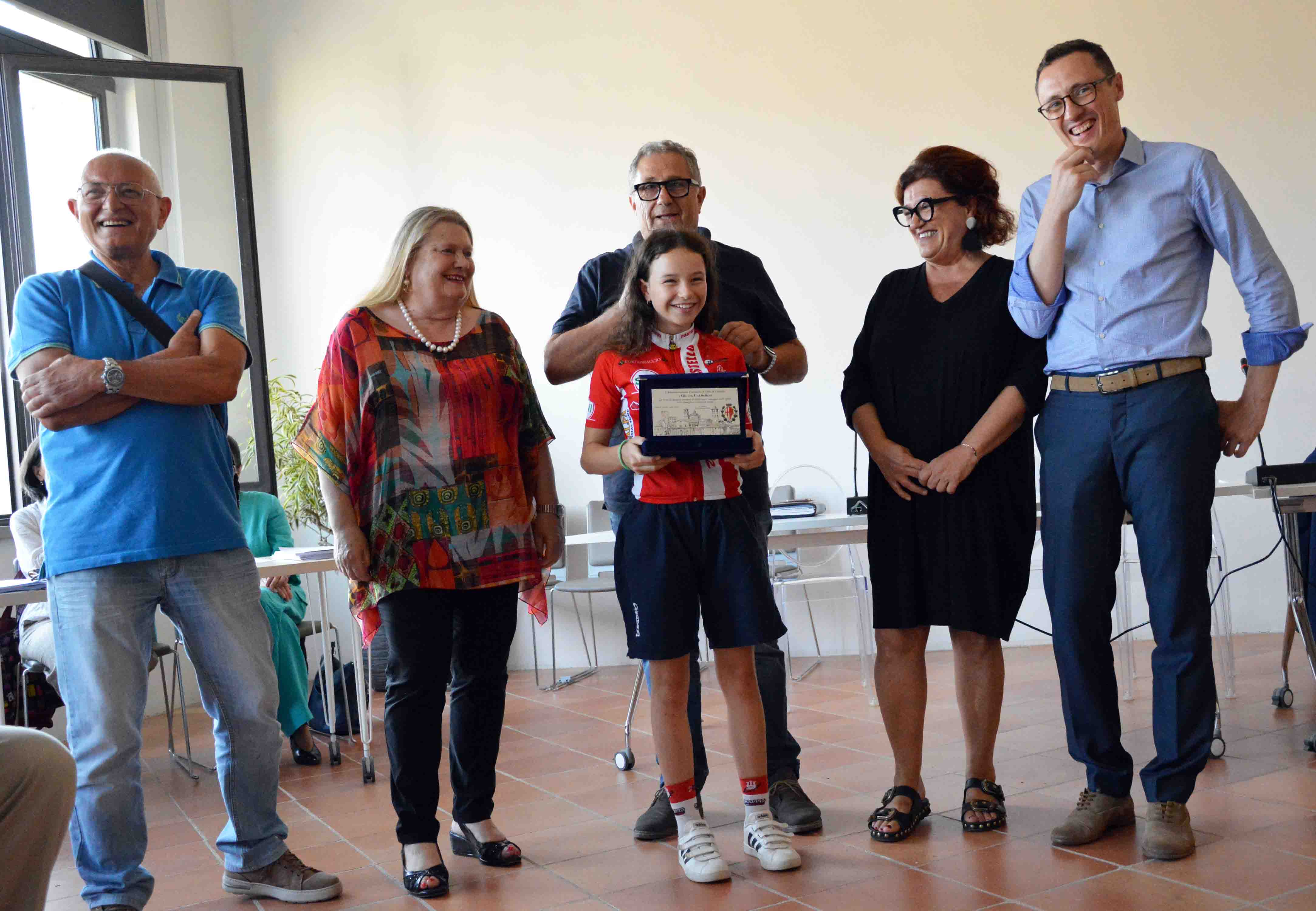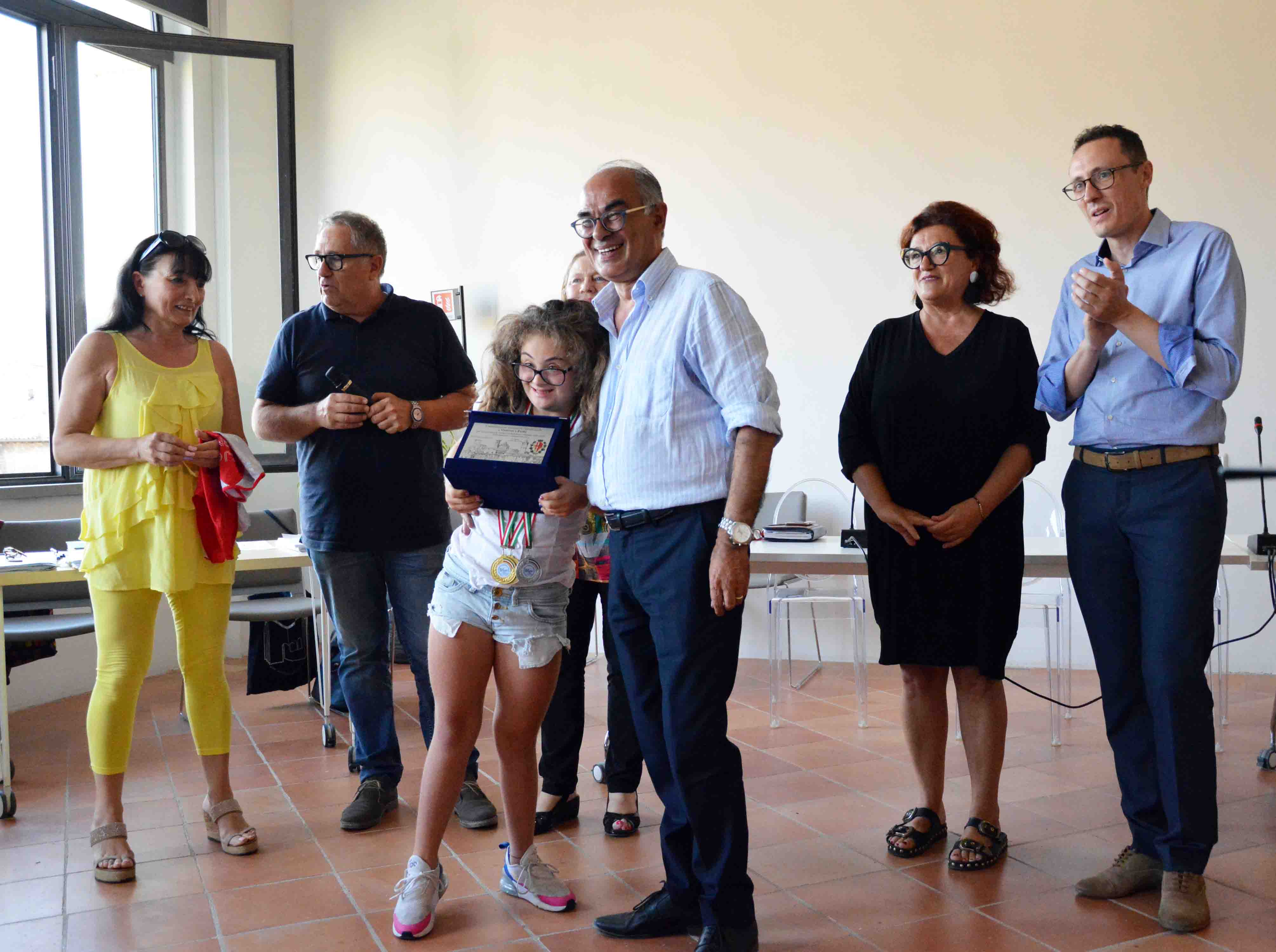 “Abbiamo scelto la giornata del consiglio comunale, convocato in una sede inedita che è divenuta simbolo per la nostra città come la nuova biblioteca Carducci, per sottolineare ancora di più la vicinanza e l’ammirazione della comunità tifernate e delle sue istituzioni nei confronti di due giovanissime sportive come Giulia e Veronica, che, con bravura, impegno e sacrifici, hanno raggiunto importanti obiettivi di rilievo nazionale, rendendoci davvero orgogliosi”. E’ il senso che l’assessore allo Sport Massimo Massetti dà alla cerimonia di premiazione che si è tenuta lunedì scorso nella sala conferenze della biblioteca comunale Carducci prima dell’inizio della seduta del consiglio comunale aperto sulle barriere architettoniche. Nell’occasione l’assessore Massetti, insieme al sindaco Luciano Bacchetta, al vice sindaco Michele Bettarelli e ai componenti della giunta, ha consegnato alla ciclista Giulia Calderini, dell’Unione Ciclistica Città di Castello, e alla ginnasta Veronica Fiori, del Centro Judo Ginnastica Tifernate, due targhe per premiare “lo straordinario esempio di dedizione e impegno nello sport, nella famiglia e nella comunità locale”. Con i suoi 11 anni Giulia Calderini è risultata la migliore ciclista under 13 in Italia nella specialità Sprint velocità nella gara nazionale nella categoria G6 femminile che si è disputata nel 33° Meeting Nazionale Giovanissimi di Matera, sotto l’egida della Federazione Ciclistica Italiana. A 12 anni Veronica Fiori è stata la mattatrice di “Ginnastica in Festa”, la manifestazione organizzata nell’ambito dei Campionati Italiani Silver della FGI (Campionato Italiano FISDIR) a Rimini, dove ha vinto tre medaglie d’oro ed una d’argento nelle specialità della trave, del volteggio, delle parallele e del corpo libero. Circondate dall’affetto dei familiari, degli amici, dei dirigenti, dei tecnici e dei compagni con cui si allenano durante l’anno, Giulia e Veronica hanno ricevuto l’applauso e il simbolico abbraccio di tutti i componenti del consiglio comunale. “In una città dello sport come la nostra registriamo quasi settimanalmente le prestazioni straordinarie e i risultati prestigiosi dei nostri atleti impegnati in competizioni nazionali e internazionali, verso i quali come amministrazione comunale sentiamo il dovere, oltre che il piacere, di tributare il riconoscimento pubblico che meritano”, puntualizza Massetti nel rivolgere “un sincero plauso all’Unione Ciclistica Città di Castello del presidente Patrizio Braganti e al Centro Judo Ginnastica Tifernate guidato dalla famiglia Mariotti per la passione e la professionalità con cui lavorano per portare ad alti livelli i nostri giovani”. Prossimamente l’amministrazione comunale premierà anche il ginnasta Gianpietro Zanchi, che ai Campionati Italiani Silver di Rimini ha conquistato la medaglia d’oro al volteggio.