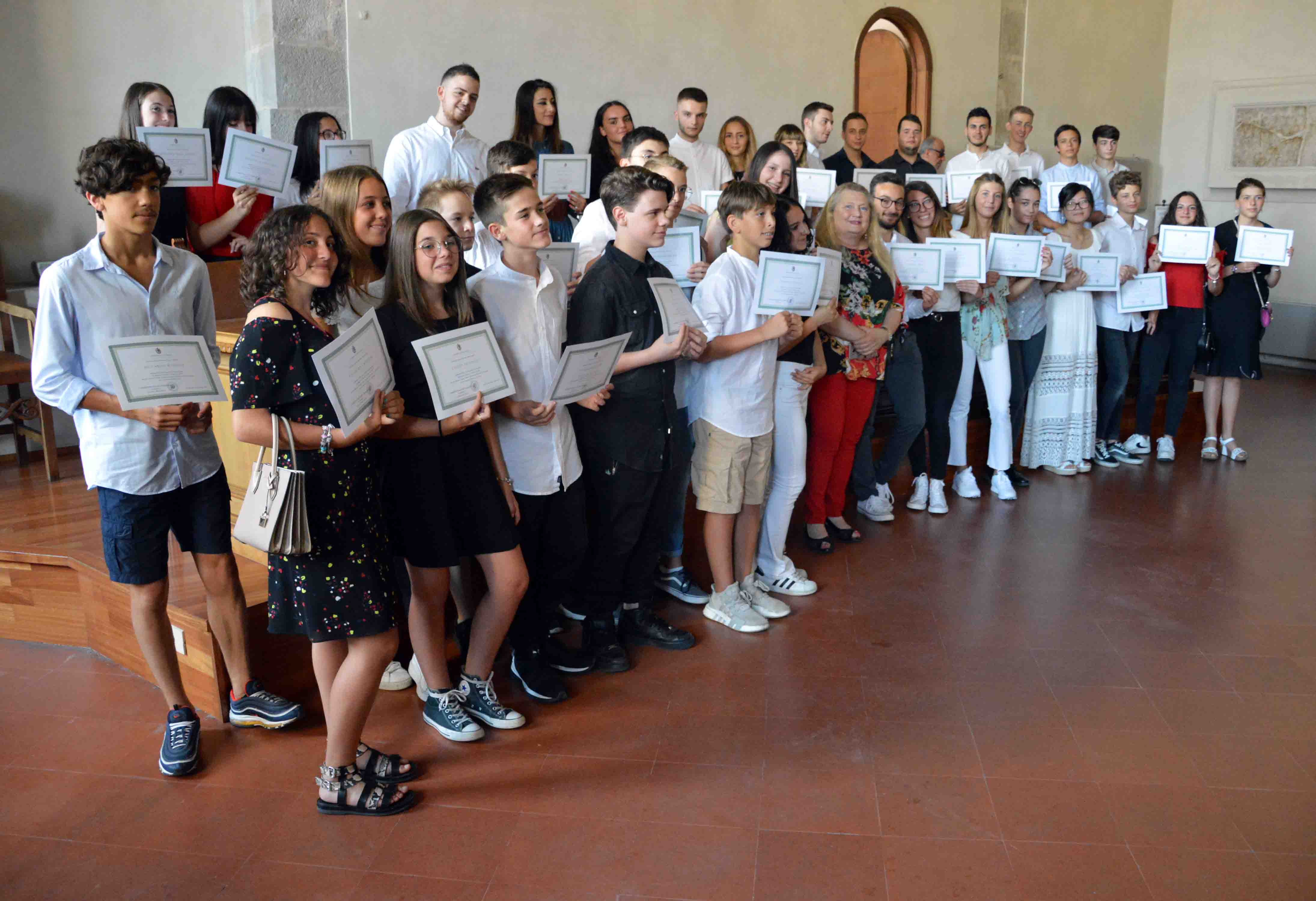 Sono 83 gli studenti tifernati che hanno superato gli esami di terza media e di maturità con il massimo dei voti e per il secondo anno l’Amministrazione comunale ha voluto sottolineare questo risultato di questi ragazzi con un diploma di merito consegnato durante una cerimonia nella sala del consiglio comunale. “Ci complimentiamo con questi giovani, che hanno preso seriamente l’impegno scolastico e sono stati ripagati da una valutazione lusinghiera del loro percorso. Non è una pregiudiziale per costruire la propria strada personale e professionale ma di certo è un buon inizio per affrontare le sfide del futuro” ha detto l’assessore ai Servizi educativi Rossella Cestini, che insieme al sindaco Luciano Bacchetta ha consegnato i diplomi. Alla manifestazione hanno partecipato il dirigente del polo liceale Plinio il Giovane Eva Bambagiotti, il dirigente della scuola Alighieri-Pascoli e per l’istituto Cavallotti-Patrizi-Baldelli Giovanni Granci. Per la Scuola superiore di primo grado Alighieri-Pascoli gli studenti che hanno superato l’esame di terza media con il massimo dei voti sono Emma Bombardiere, Giulia Gentiletti, Gaia Negri, Edoardo Aquilani, Jamila Talbi, Stefano Alunno, Lorenzo Ascani, Giacomo Castori, Davide Cuccarini, Tommaso Giunti, Angelica Mastrangeli, Celeste Piccinelli, Augusto Calafiori, Elisabetta Mandrelli, Caterina Manfucci, Margherita Rosmini, Edoardo Conti, Eleonora Crocioni, Luca Boriosi, Elvira Burani, Angelica Cenciarini, Alessio Compagnucci, Tommaso Locchi, Edoardo Sambuchi, Edoardo Veschi, Filippo Gragnoli, Paolo Bastianelli, Tommaso Mearelli, Caterina Mori, Michele Polenzani, Laura Fiorucci, Riccardo Mancini, Alice Massetti, Eleonora Tafani Alunno. Per la scuola media San Francesco di Sales Matilde Bigotti e Giuseppe Acquisti. Per l’istituto Alberto Burri di Trestina Anna Bei, Matilde Bianchini, Elisa Cartini, Tommaso Ceccagnoli, Sofia Ciabatti, Claudia Conti, Cristiana Maestri, Linda Pesce, Lucrezia Pieracci, Giulia Piermarini, Cecilia Squarcetti. Per la scuola media Leonardo da Vinci di San Giustino Ilaria Nanni , Lucia Rossi, Alessandro Reali. Gli studenti tifernati che hanno conseguito la maturità con il massimo dei voti sono per il Liceo Internazionale San Francesco di Sales Sofia Pedetti, per il polo tecnico Franchetti-Salviani Marco Birchmeier, Federico Buoncompagni, Luca Migliorati, Gregorio Rossi, Alessio Sabatino, Irene Giombini, Gregorio Capaccioni, Alessandro Merlini, Davide Urbani, Angela Hu Fan Wei. Per l’istituto Patrizi-Baldelli-Cavallotti Jacopo Gragnoli, Matteo Manfucci, Giorgia De Santi, Michele Merli. Per il liceo Plinio il giovane Giulia Novello, Giosuè Banconi, Agnese Pauselli, Matteo De Sanctis, Beatrice Pecorari, Edoardo Fioroni, Martino Rossi, Lucia Testadura, Leonardo Provincia, Alessandro Urbanelli, Federico Valorosi, Marta Mencagli, Federico Zambri, Sofia Migliacci. Per il liceo Città di Piero di Sansepolcro Giulia Santinelli, per il Campus Leonardo da Vinci di Umbertide Annalisa Rubini, Silvia Belli, Vasile Antonio Chirila. Tanti applausi per tutti ed 87 da parte delle famiglie, degli amici e dei conoscenti che hanno riempito la Sala del Consiglio. Le foto di tutti i premiati saranno pubblicate su questo sito e sulla pagina FB del comune di Città di Castello. (In aqllegato foto di gruppo)