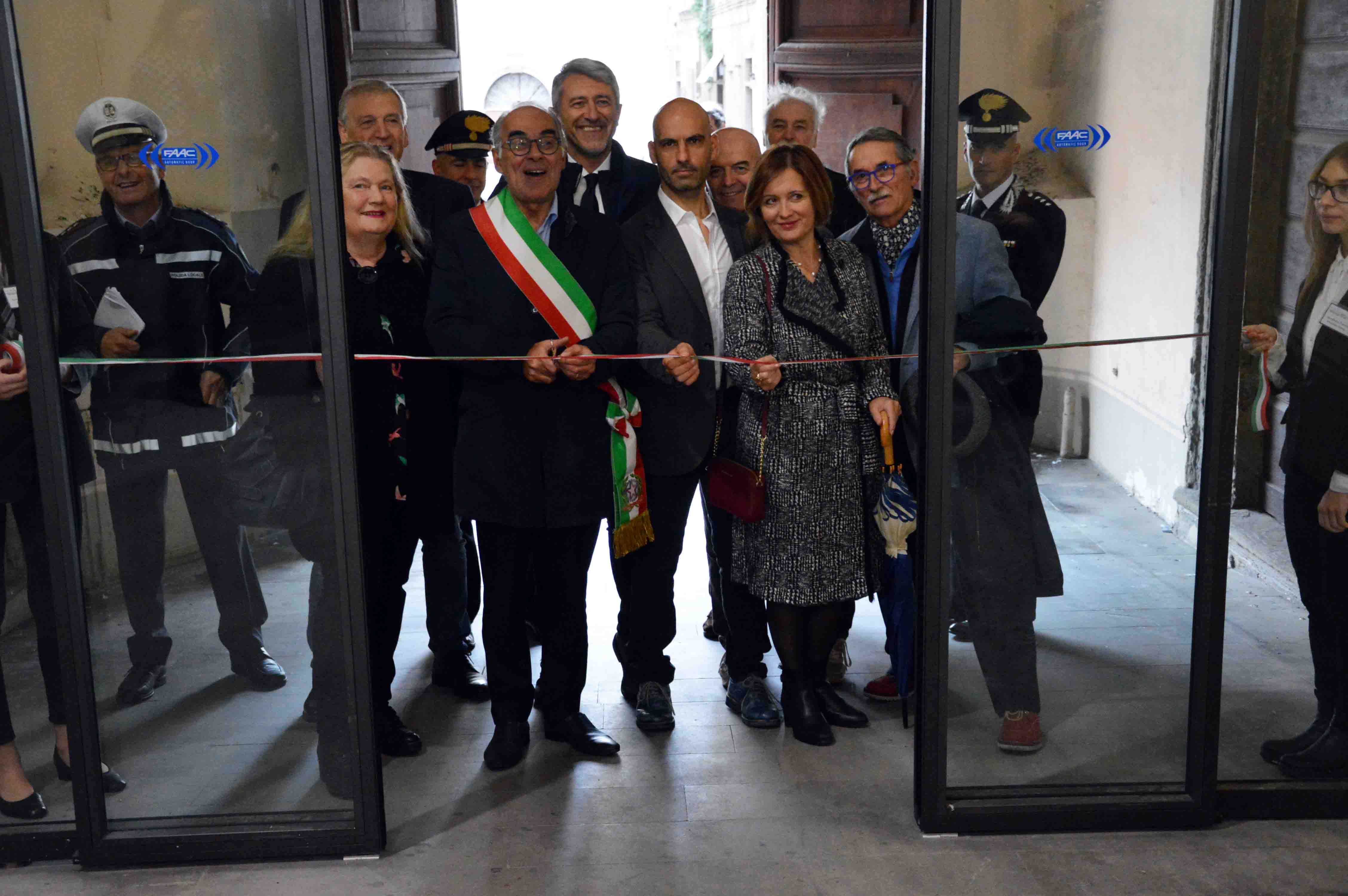 “Con l’inaugurazione dei lavori di restyling di palazzo Bufalini e del loggiato Gildoni teniamo fede a un impegno preso con la cittadinanza per il miglioramento estetico e funzionale di un luogo di riferimento importante del centro storico, che con le nuove porte a vetro, il rinnovamento dell’impianto illuminazione e l’ascensore viene valorizzato appieno dal punto di vista del comfort e dell’accessibilità, a beneficio dell’utilizzo per eventi e per l’attività dell’associazionismo”. Il sindaco Luciano Bacchetta e l’assessore ai Lavori Pubblici Luca Secondi hanno commentato così la cerimonia pubblica di stamattina, con cui sono stati presentati alla città gli interventi di riqualificazione compiuti a palazzo Bufalini per un investimento complessivo di 176 mila euro finanziato dal Gal Alta Umbria, rappresentato nell’occasione dalla presidente Giuliana Falaschi. Alla presenza di componenti della giunta, consiglieri comunali, provinciali e regionali e autorità civili e militari, Bacchetta e Secondi hanno evidenziato con soddisfazione il conseguimento dell’obiettivo dell’abbattimento delle barriere architettoniche ottenuto con l’installazione dell’ascensore, “che consentirà la piena fruibilità dello spazio espositivo del quadrilatero e del Circolo degli Illuminati, nel solco di un’attenzione prioritaria dell’amministrazione comunale alle esigenze di mobilità della popolazione, da quelle di chi si sposta utilizzando carrozzelle per condizioni di handicap o invalidità, a quelle di chi si muove con passeggini per i bambini”. A ulteriore completamento dell’intervento, lunedì 4 novembre verrà dato il via al cantiere per i lavori di adeguamento alle norme antincendio dell’area espositiva del quadrilatero, con un ulteriore investimento di circa 45 mila euro. Con l’intervento di restyling dell’immobile, a piano terra sono state installate tre porte in vetro apribili a spinta dall’interno, due verso la piazzetta di via Bufalini e una verso il loggiato della banca, e due grandi porte scorrevoli in vetro, una verso piazza Matteotti e l’altra verso via Mazzini. Le vetrate antisfondamento sono fisse nella parte alta delle arcate e apribili nella parte bassa, anche completamente all’occorrenza, per facilitare le manutenzioni. I lavori di riqualificazione sono stati completati da un intervento di tinteggiatura delle pareti e di sistemazione della pavimentazione, cui è seguita la completa sostituzione dell’impianto di illuminazione esistente, mediante l’installazione di nuove lampade a led ad alta efficienza. Per il montaggio dell’ascensore, che può trasportare fino a sei individui e può essere utilizzato senza difficoltà da persone con sussidi su ruota, è stato sfruttato il locale già predisposto all’interno della palazzina di via Mazzini adiacente a palazzo Bufalini. L’accesso esterno all’ascensore sarà in via Mazzini, mentre dall’interno il passaggio si trova nel locale adiacente l’ufficio della Polizia Municipale.