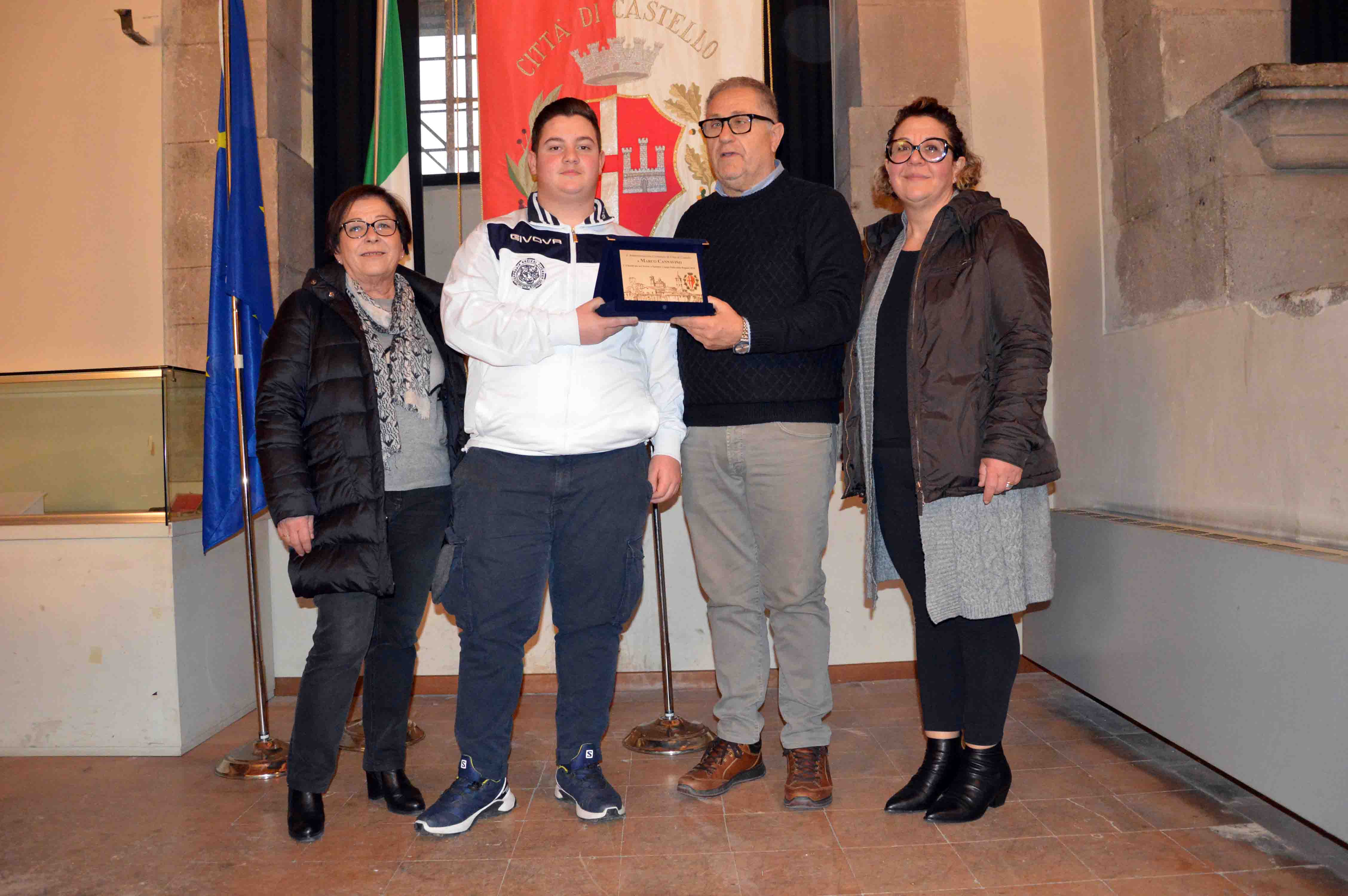 “Con impegno e serietà al servizio di un talento davvero promettente, Marco Cannavino ha portato Città di Castello alla massima ribalta nazionale in uno sport difficile e affascinante come il tiro con l’arco, che nel nostro territorio vanta un’antica tradizione grazie alla storica Compagnia degli Arcieri Tifernum, con i suoi quarant’anni di attività”. E’ così che l’assessore allo Sport Massimo Massetti ha sottolineato l’impresa sportiva del 15enne Marco Cannavino nella cerimonia con cui l’amministrazione comunale lo ha premiato nella residenza municipale per la conquista della medaglia d’oro nella categoria ragazzi, specialità arco olimpico, all’ultima edizione della Coppa delle Regioni organizzata dalla FITARCO (Federazione Italiana Tiro con l’Arco) a Cagliari. Il giovanissimo arciere in forza al sodalizio tifernate presieduto da Claudia Benigni è diventato campione nazionale nella gara di tiro alla targa da 40 metri nel mixed-team composto con Anna Chianella degli Arcieri di Assisi. Una prestazione che lo ha imposto all’attenzione generale al punto da essere successivamente convocato, insieme ad altri 15 coetanei, nella rappresentativa nazionale della Federazione Italiana di Tiro con l'Arco per il raduno tecnico giovanile olimpico che si è tenuto all’inizio dell’anno a Rovereto. “Seguiamo con grande attenzione il cammino di questa giovane promessa, che ha già mostrato di sapersi far valere in importanti gare nazionali e siamo convinti abbia le qualità per essere stabilmente tra i migliori in Italia”, ha puntualizzato Massetti al momento della consegna della targa nelle mani di Marco, accompagnato nell’occasione dal tecnico regionale Rita Guerrini, colonna portante degli Arcieri Tifernum che ha cresciuto generazioni di giovani, e dalla “mamma d’arte” Giuseppina Nardone, consigliera del sodalizio tifernate che si allena e gareggia nel tiro con l’arco sulle orme del figlio.