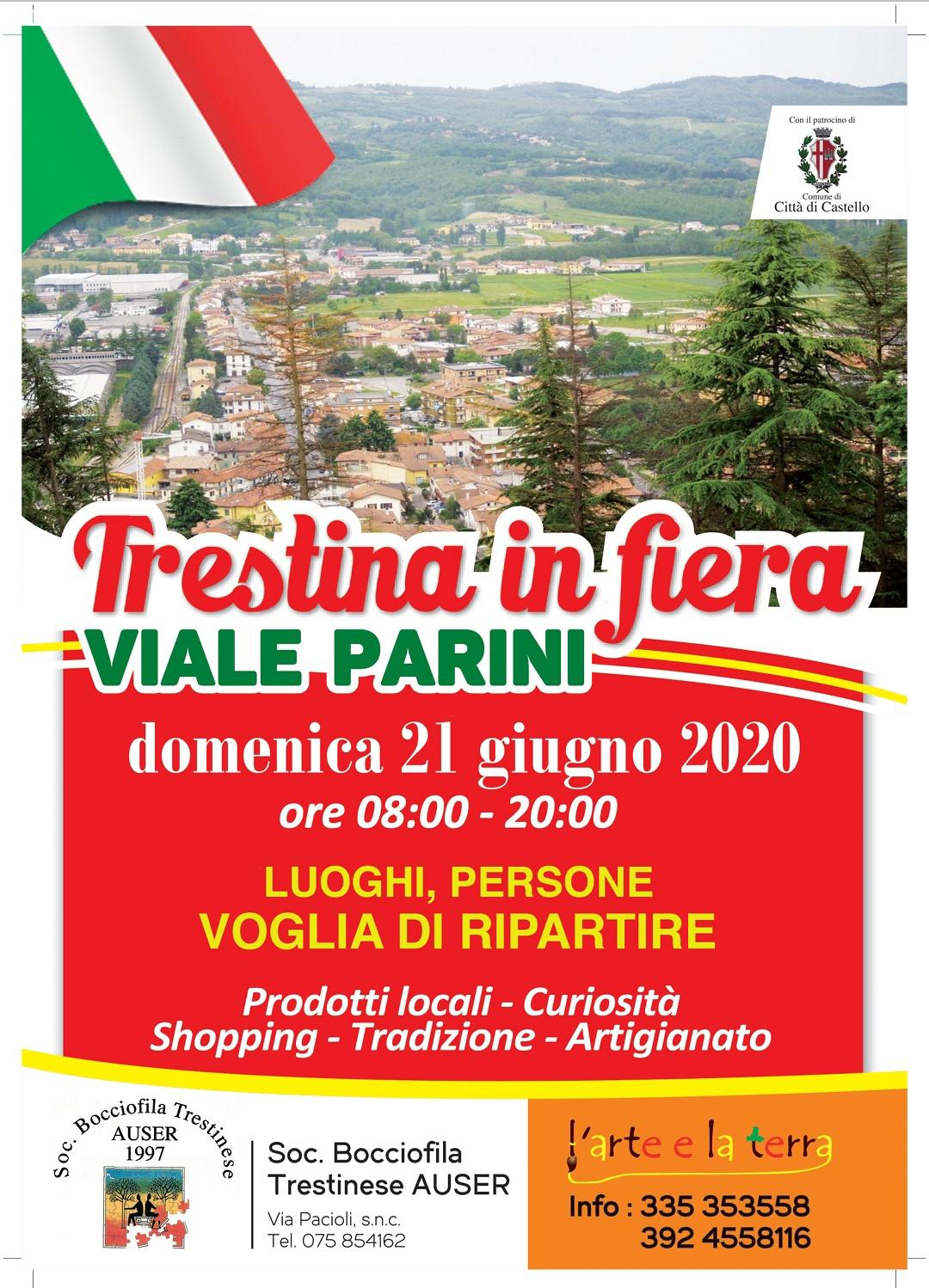 Ritornano i mercati nel centro storico di Città di Castello e ritornano anche gli appuntamenti sul territorio: domenica 21 giugno 2020 per l’intera giornata in viale Parini sarà rispettato l’appuntamento con Trestina in fiera, “una manifestazione nata qualche anno fa su un’idea mia e del consigliere Luciano Domenichini – ricorda l’assessore al Turismo e Commercio Riccardo Carletti, annunciando l’evento - per creare movimento e animazione, che, in questo complesso anno, diventa anche un segno della Voglia di ripartire, motto scelto per l’edizione 2020, ricca di ambulanti e di proposte per l’estate ormai alle porte. Non nascondiamo che Trestina in fiera è anche una delle prime iniziative in cui è prevista una partecipazione consistente e per questo sarà importantissimo rispettare tutte le misure di sicurezza assunte dall’organizzazione per vivere una bella giornata di incontri e shopping sulla base del distanziamento sociale e dell’uso di dispositivi di tutela personale e collettiva. Trestina in fiera ha fin da subito avuto un grande riscontro e sono certo, che non solo per il suo significato simbolico di ripartenza, anche quest’anno possa essere un successo grazie alla collaborazione della società Bocciofila Trestinese Auser 1997 e dell’associazione L’arte e la Terra e grazie ad attrattive di grande richiamo come i prodotti tipici, le curiosità la tradizione e l’artigianato”.