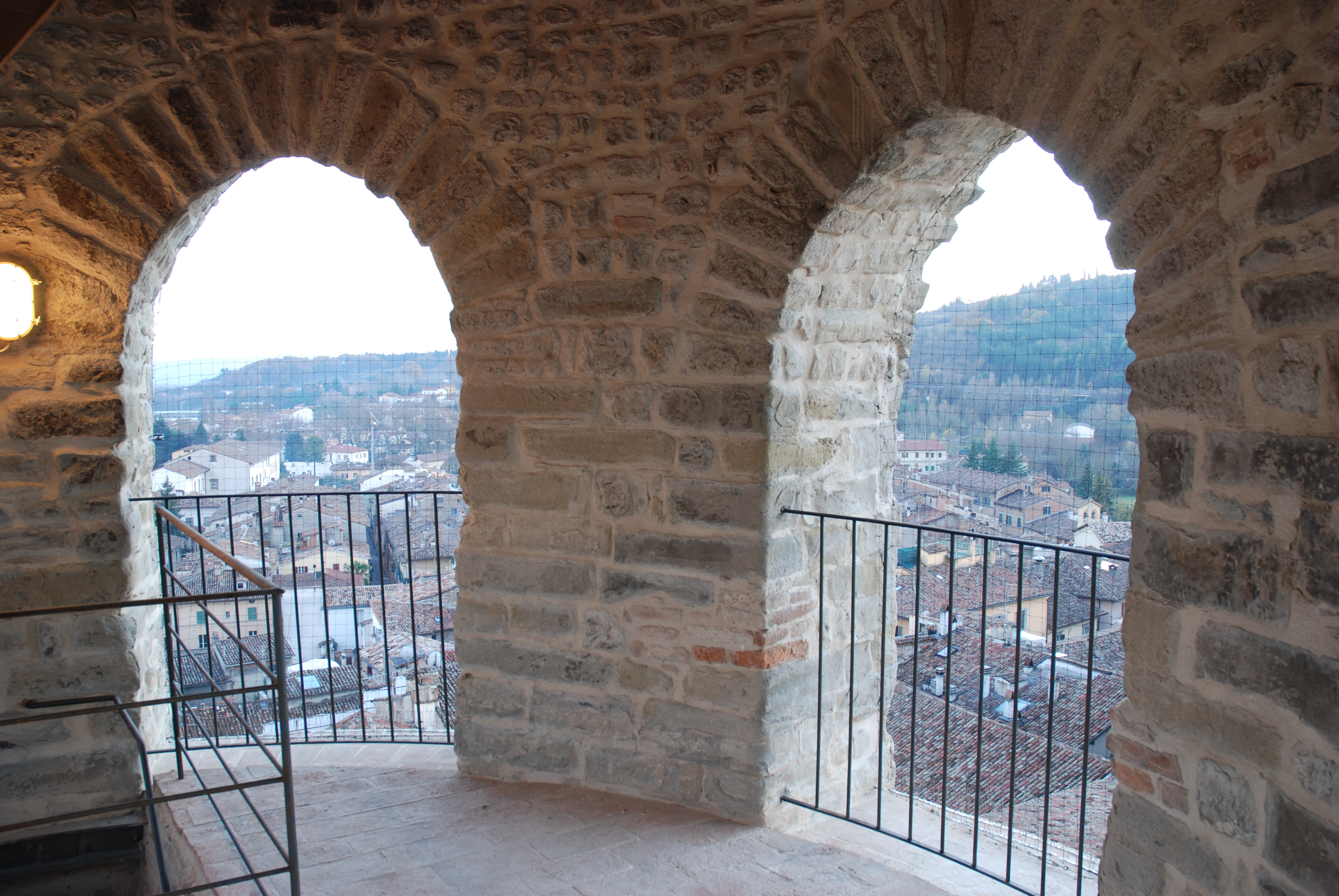 Il riferimento più antico risale all’anno 1283 quando il Comune tifernate destina una “rata” di moneta da devolvere alla “già cominciata costruzione del Campanile della Cattedrale”. Alcuni studi condotti da Mario Salmi lo datano al sec. XI riscontrando nei metodi costruttivi che in “tempo romanico” giungono dall’aretino, tipici dell’arte bizantino-ravennate, un movimento che faceva capo all’architetto Maginardo. Il campanile sorgeva isolato sul sagrato, prima dell’ampliamento rinascimentale della sacrestia della Basilica Cattedrale che finì per celarne l’ingresso originale, ancora testimoniato dall’archetto in cotto e dal sottostante stipite in pietra su cui si appoggia. Gli strati del paramento murario ci indicano le diverse fasi di realizzazione. La parte inferiore romanica è la più antica (secc. XI-XII) ed è realizzata a piccoli conci di pietra, mentre la congiunzione superiore gotica, caratterizzata da un doppio ordine di aperture di pietra arenaria, indica interventi successivi risalenti al 1283-84. La costruzione si completa forse già verso la metà del XIV secolo. Infatti nel 1369 “il Capitolo col permesso del vescovo provvede alla restituzione di 100 fiorini d’oro avuti in prestito da Gerozzo di Piero per ripristinare i tetti della chiesa e del campanile ed i beni della Canonica devastati l’8 luglio 1368”. Ancora un altro documento attesta che il 22 agosto del 1480 in una “Volta del Campanile del Duomo” si conservavano le carte dei privilegi e riforme degli uffici civili. La struttura, alta 43,50 mt. con un diametro medio di 7 mt. ed uno spessore medio della muratura di 1mt., termina con un coronamento a cono in cui è ubicata la cella campanaria ospitante 3 campane. A piano terra dove in origine era l’ingresso, oggi in parte celato dalla costruzione dell’adiacente Basilica, è ubicata la sacrestia. L’accesso attuale si trova a livello superiore e si raggiunge tramite una scala a chiocciola in pietra ricavata nello spessore delle murature di un fianco della Cattedrale. Proseguendo attraverso un piccolo ballatoio realizzato su arco in mattoni, si raggiunge la sommità tramite sistemi di scale e pianerottoli di sosta ricostruiti in legno di castagno. Nella cuspide è stata reinstallata la sfera di metallo ricoperta di lamine di oro zecchino in sostituzione della precedente deteriorata dal tempo, al cui interno è stata collocata una pergamena a ricordo dei lavori di ristrutturazione e consolidamento effettuati. La visita è possibile tutti i giorni escluso il lunedì accedendo alla biglietteria del Museo Diocesano in Piazza V. Gabriotti 3/b dove è possibile acquistare anche la Carta Ecclesia per usufruire di agevolazioni in oltre venti musei convenzionati civici e ed ecclesiastici dell’Umbria e della Toscana.