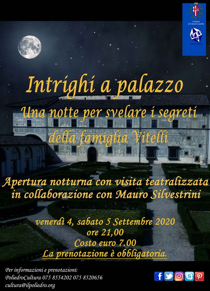 Dopo il grande successo della leggenda della Sora Laura le porte della Pinacoteca comunale di Città di Castello si apriranno ancora per raccontare le storie di questa dimora rinascimentale: Intrighi a palazzo è il titolo della visita teatralizzata in programma venerdì 4 e sabato 5 settembre 2020, dal tema Una notte per svelare i segreti della famiglia Vitelli. In collaborazione con Mauro Silvestrini, l’iniziativa promossa da Poliedro prevede l’apertura notturna del museo. Mascherina e prenotazione obbligatoria. Info Poliedro Cultura 075 8554202 075 8520656 (dal martedì alla domenica 10:00-13:00 14:30-18:30).